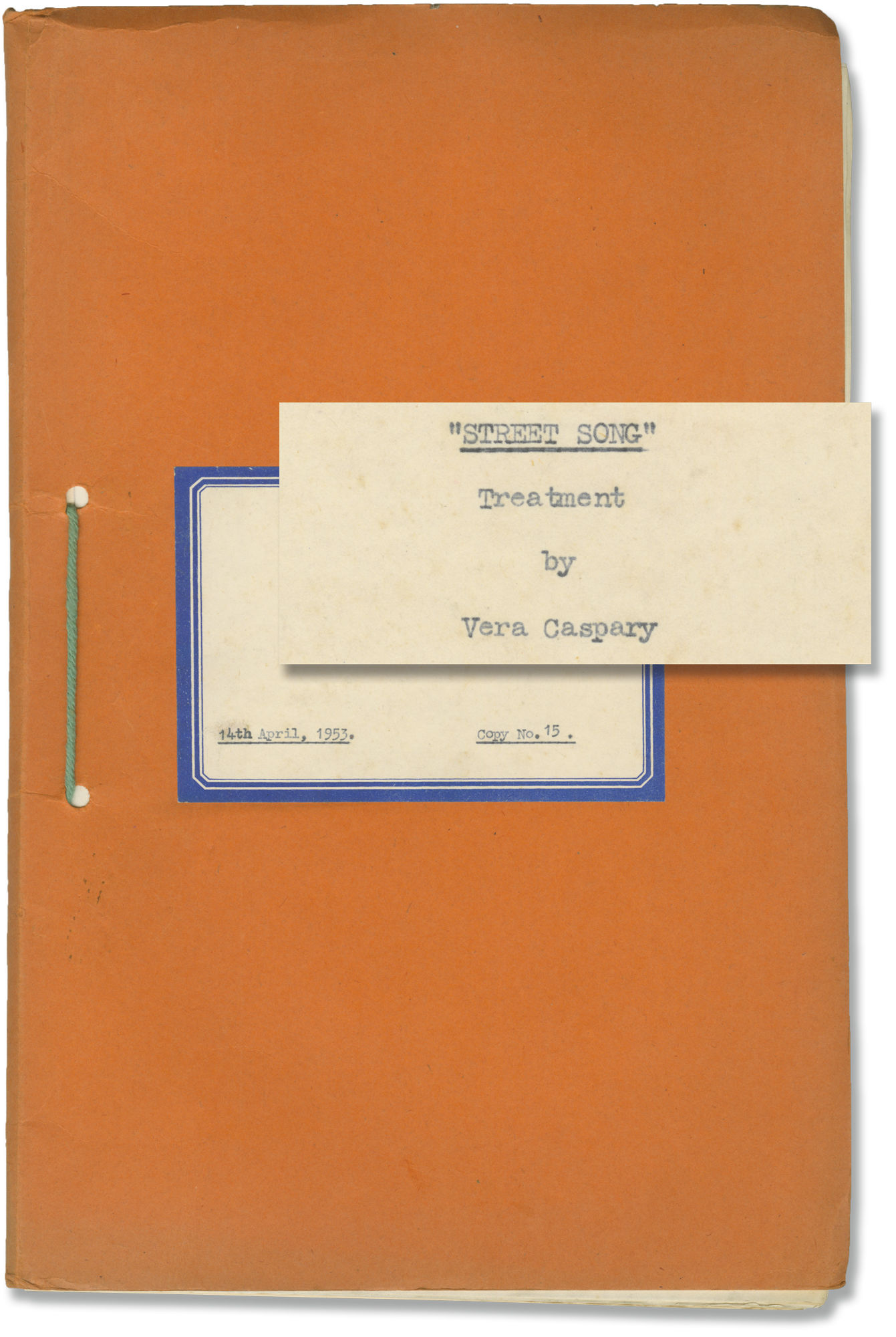 Tall orange titled wrappers, noted as Treatment on the front wrapper, dated 14th April, 1953, noted as Copy No. 15, with credits for screenwriter Vera Caspary. Title page present, dated 14th April, 1953, noted as Treatment, with credits for Caspary. 77 leaves, with last page of text numbered 76. Mimeograph duplication, rectos only. Pages Very Good plus, with some rust to the first few leaves and light foxing, wrapper Very Good plus, bound with green string.
