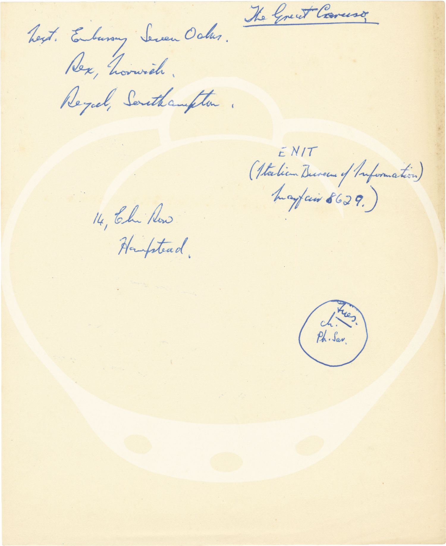 N.p.: N.p., 1953. Treatment script for an unproduced film. Included with the script are four partially-bound identical sets of carbon typescript pages listing prospective filming locations and camerawork, and two smaller unbound leaves, one blank and one with manuscript ink annotations to the recto.