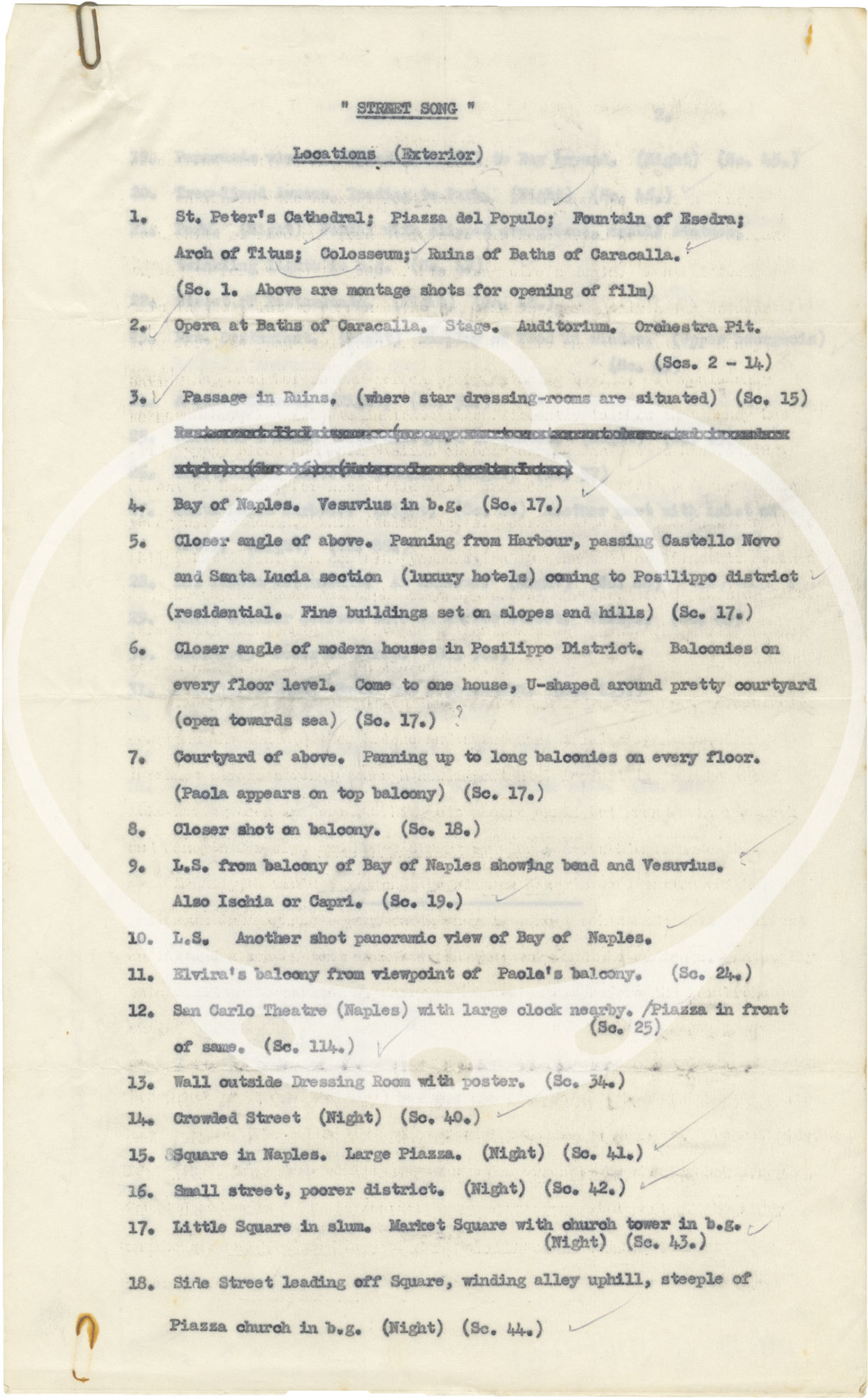 Screenwriter Vera Caspary was best known for her 1942 novel "Laura," the basis for the classic 1944 film noir and the project that most strongly established her presence among Hollywood studios as a desirable writer for film. Years later, however, in the midst of the HUAC investigations, Caspary became persona non grata, as she had been an active member of the Communist Party in the 1930s and never fully shed her proletarian leanings. In order to avoid prosecution and the potential destruction of her career, Caspary moved to Europe and spent several years searching for studio financing and writing film treatments, including the never-produced "Street Song." The project tells the story of an acclaimed but vain opera singer who falls in with a group of street musicians and learns humility and, ultimately, love.