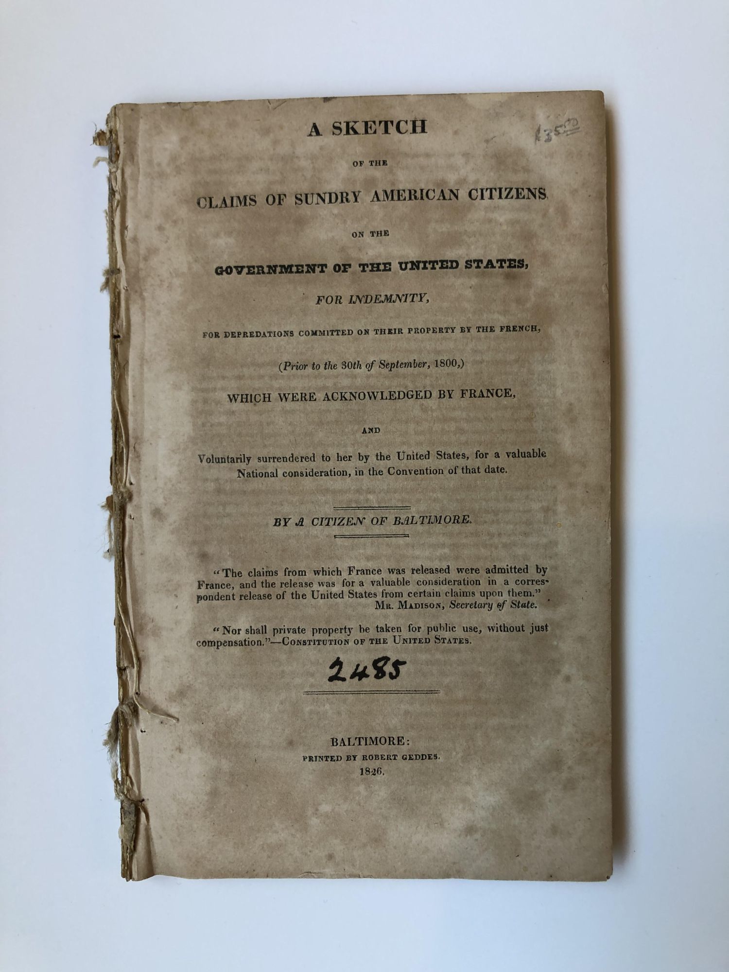 Baltimore, MD: Robert Geddes, 1826. Presumed First Edition. Softcover. Octavo, 143 pages; G; stitched pamphlet binding; some shelf wear and soiling; housed in a mylar envelope; some age-toning; pencil marking to upper right corner of front cover; number 2485 at front cover in iron gall ink; two-inch closed tear at page 81, with no text loss; RW consignment. Sabin 81514. 1355524. Special Collections.