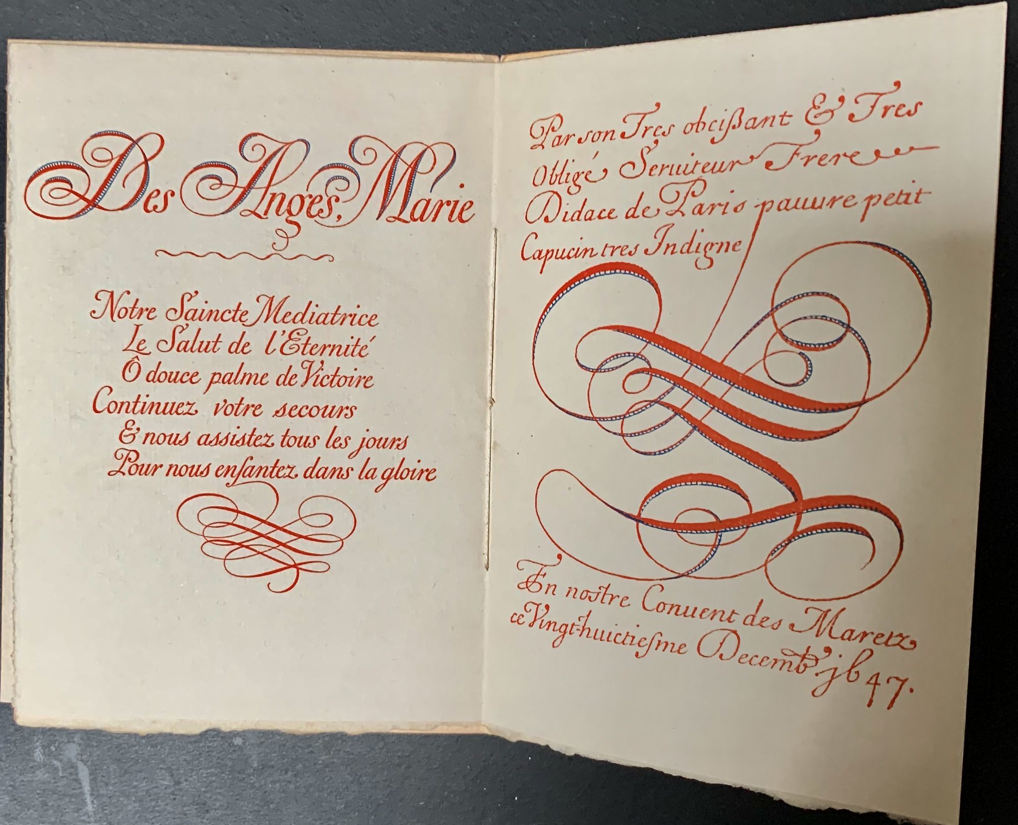 NP: Philip Hofer, 1947. Reprint. Wraps. Orig. decorated stitched red wrappers. Very good. Four unnumbered French leaved pages. 15.5 x 11 pages. Christmas greeting noting "These pages are reproduced, with one slight reconstruction, from a French calligrapher manuscript of Capuchin prayers which came into our possession this fateful year, 1942. Printed in two colors, red and gray.