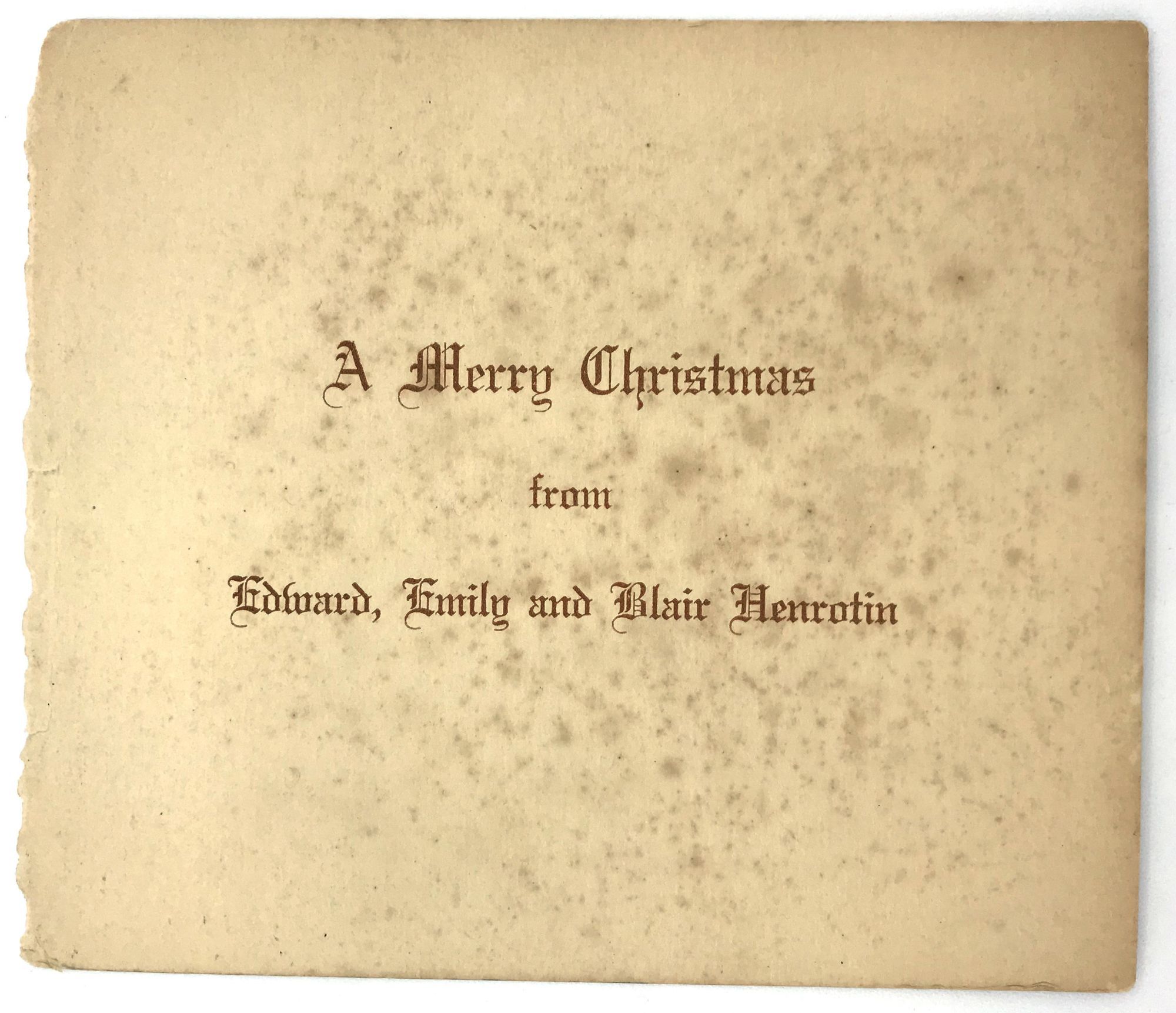 Printed Christmas card from "Edward, Emily and Blair Henrotin" with map of their property and upstate New York on verso. Measures 4.5" by 5".