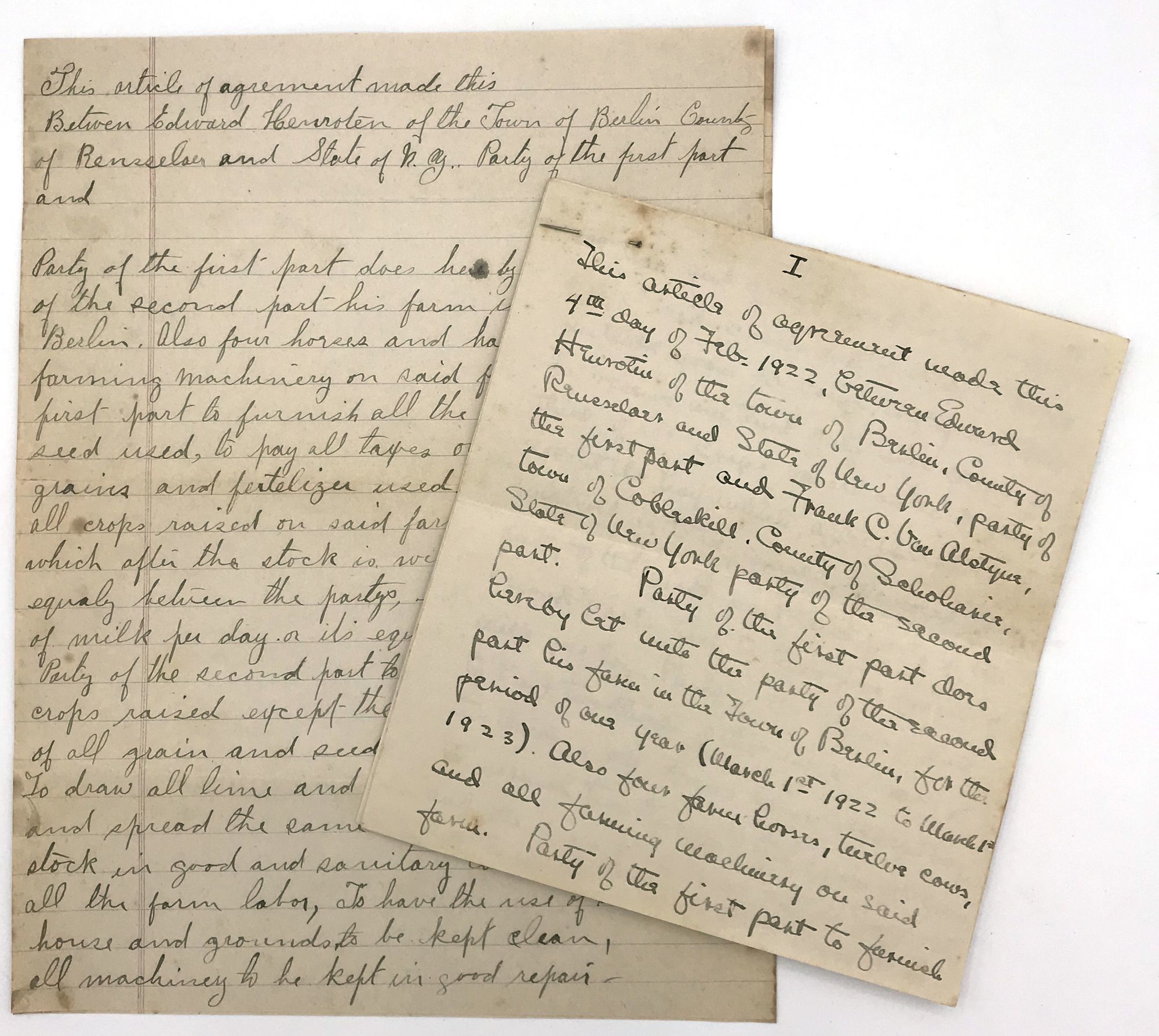 Two (2) manuscript drafts of contracts dated 1922 between Edward Henrotin and business associates concerning agricultural work. Measures 10" by 7.75" and 7" by 6", [4] pp. and [14] pp., respectively.