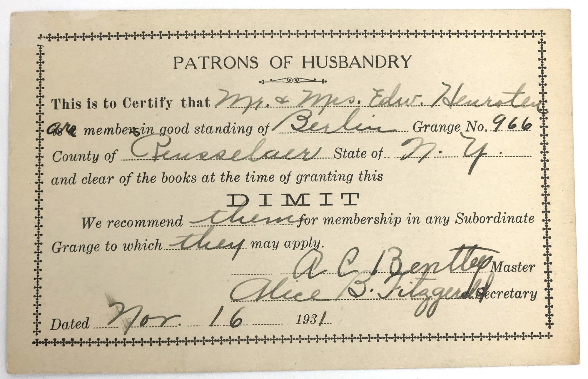 Printed "Patrons of Husbandry" slip signed in contemporary ink manuscript certifying that both Edward and Emily Henrotin are "members in good standing of Berlin Grange No. 966". Measures 3.5" by 5.5", verso blank. Dated 1931.