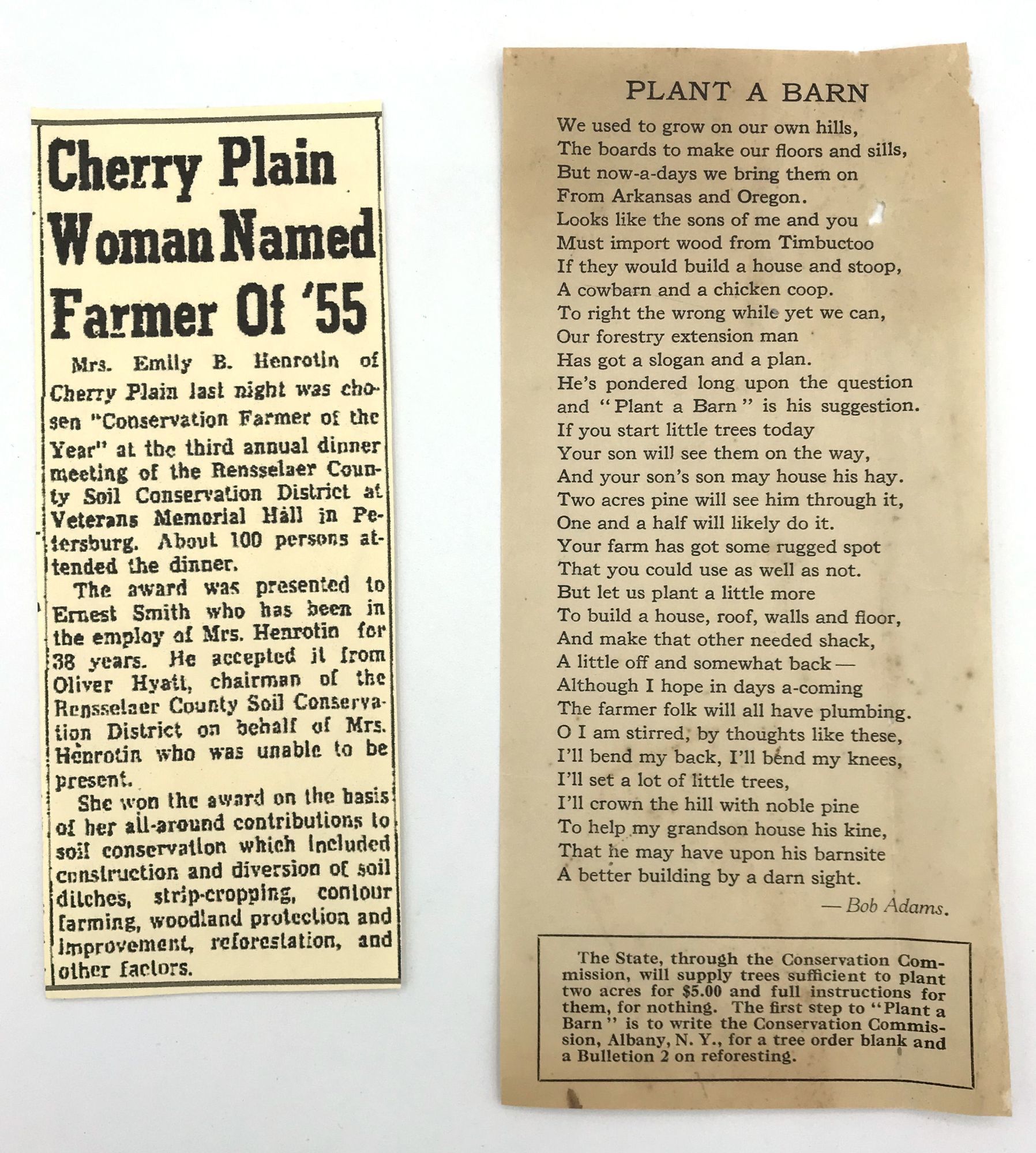 Two (2) undated newspaper clippings featuring "Plant a Barn", a poem by Emily, and a modern reproduction of a newspaper article about Emily titled "Cherry Plain Woman Named Farmer of '55" for her all round contributions to soil conservation which included construction and diversion of soil dtiches, strip-cropping, countur farming, woodland protection and improvement, reforestation and other factors.