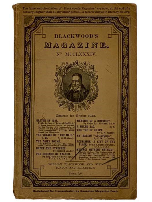London and Edinburgh: William Blackwood and Sons, 1922. Soft Cover. Good. Loss to spine base, tears and chips along edges, rear soiled. 1922 Soft Cover. 38, [ii], 425-564, viii pp. Contents for October 1922. Ulster in 1921; The Voyage of "The Maid"--I.-VI.; The Daily Round; Under the Pyrenees; The Defence of Abadeh; Memoirs of a Motorist; A Mixed Bag; The Top of Egypt; An Italian "Sudatorio"; Peshawur, a City of the Plain; Musings Without Method. Blackwood's Magazine was a British magazine and miscellany printed between 1817 and 1980. It was founded by the publisher William Blackwood and was originally called the Edinburgh Monthly Magazine. The first number appeared in April 1817 under the editorship of Thomas Pringle and James Cleghorn. The journal was unsuccessful and Blackwood fired Pringle and Cleghorn and relaunched the journal as Blackwood's Edinburgh Magazine under his own editorship.