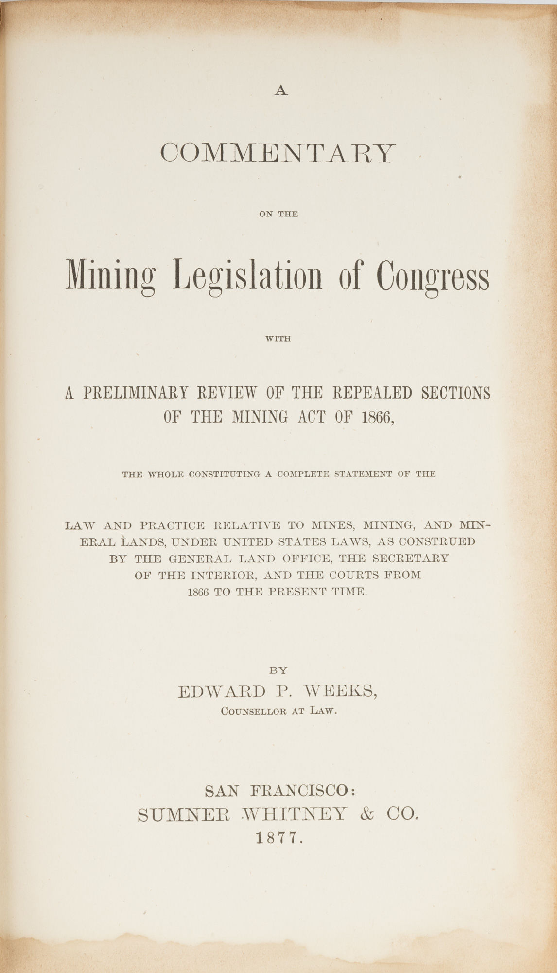 1877. The Law Relative to the Mineral Lands of the United States," 1866-1877 Weeks, Edward P. A Commentary on the Mining Legislation of Congress, With a Preliminary Review of the Repealed Sections of the Mining Act of 1866, The Whole Constituting a Complete Statement of the Law and Practice Relative to Mines, Mining, And Mineral Lands, Under United States Laws, As Construed by the General Land Office, The Secretary of the Interior, And the Courts from 1866 to the Present Time. San Francisco: Sumner, Whitney & Co., 1877. xvi, 451 pp. Octavo (9" x 5-1/2"). Contemporary sheep, blind frames to boards, raised bands and red and black lettering pieces to spine. Light rubbing and a fewminor scratches and stains to boards, moderate rubbing to extremities, hinges partially cracked, bookseller ticket (of Sumner Whitney), early owner signature (of D.H. Cowden, dated 1878) and later owner stamp (of Park Chamberlain) to front pastedown, brief owner inscription (shelf location) to front free endpaper. Moderate toning to interior, negligible faint dampstaining to margins, mostly at foot of text block, offsetting to preliminaries and final few leaves. $350. * First edition. Weeks describes this book as "an attempt to systematize and condense the materials which constitute the law relative to the Mineral lands of the United States, from the date of the first Mining Act, 1866, to the present time"(v). This appears to have been a well-received work. Later editions were issued in 1880 and 1900. The first edition is rare. OCLC locates 7 copies, 3 in law libraries (UC-Hastings, Wisconsin State Law Library, Yale). This edition not in the Harvard Law Catalogue.