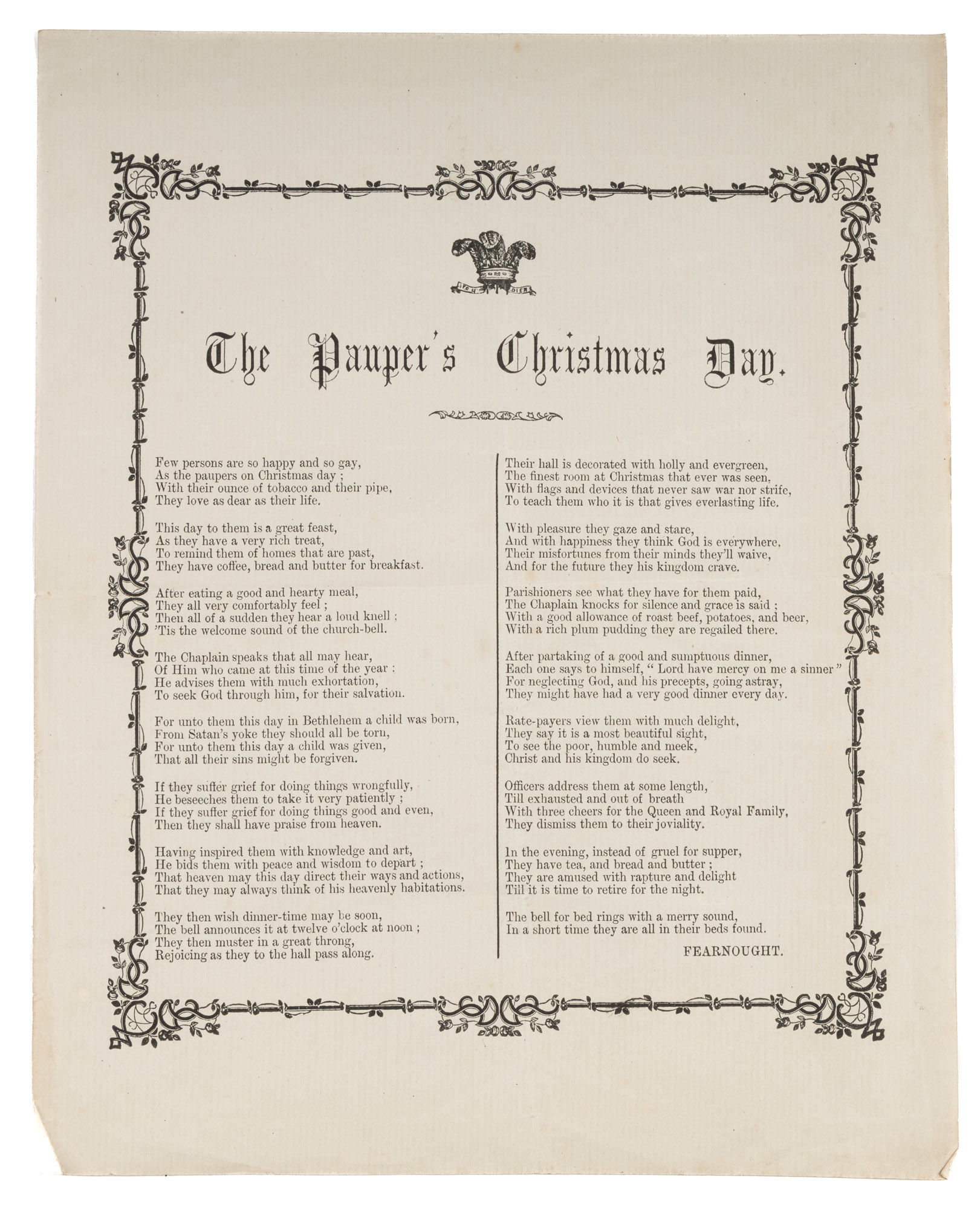 1850. Rate-Payers View Them With Much Delight" [Broadside]. [Poor Laws]. [Great Britain]. The Pauper's Christmas Day. [England: S.n., 1872?]. 10" x 8" broadside, text in two columns below headline, woodcut arms of the Prince of Wales above headline, column separated by rule, text enclosed by woodcut typographical border. Moderate toning, a few tiny spots, horizontal fold line through center, a few fold lines and creases to corners. $350. * This poem, by "Fearnought," describes a pleasant Christmas day in a Church-run poorhouse. The paupers are grateful, pious and humble and the rate-payers (taxpayers) who support them are warmed by the sight: "Rate-payers view them with much delight, they say it is a most beautiful sight, To see the poor, humble and meek, Christ and his kingdom do seek." This appears to be an unrecorded imprint. No copies listed on OCLC or Library Hub.