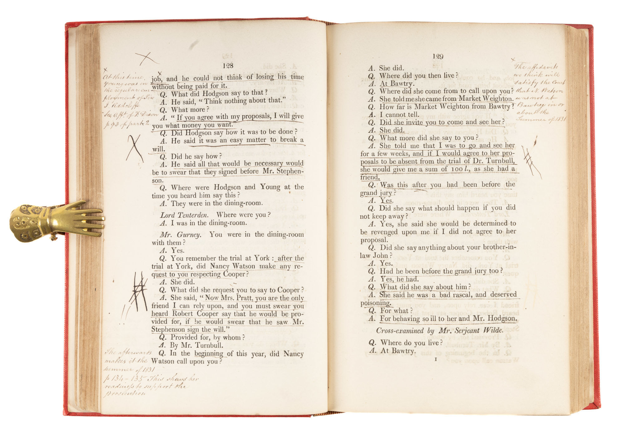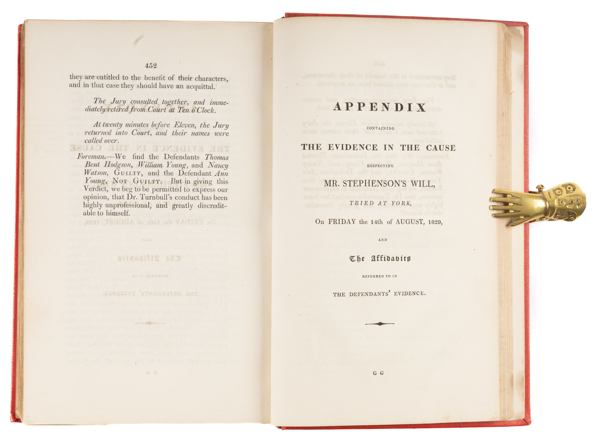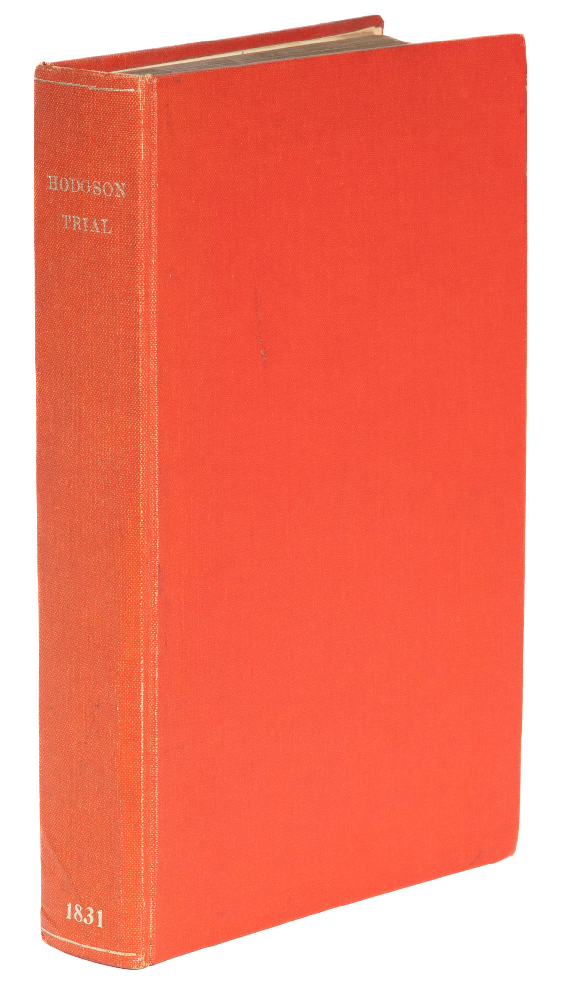 1831. Conspiracy to Suppress a Will [Trial]. Hodgson, Thomas Bent, Primary Defendant. Report of the Trial of Thomas Bent Hodgson, Esq. And Others Charged With a Conspiracy, At the Court of King's Bench, Guildhall, London, On Wednesday & Thursday, The 21st & 22d of December 1831, By a Special Jury, Before the Right Hon. Lord Tenterden. London: Printed by James & Luke G. Hansard & Sons, 1831. 507, [1] pp. Octavo (8-1/4" x 5-1/4"). Later buckram, gilt title and date to spine, endpapers renewed, speckled edges. Boards bowing slightly, light rubbing to extremities, rear hinge cracked (before final leaf), small bookseller's ticket and later bookplate (of Geoffrey Briggs) to front pastedown. Light toning to interior, light soiling in a few places, somewhat heavier to title page, corners lightly worn in a few places not affecting text, crack in text block between pp. 14 and 15, first few leaves loosening at foot but secure, brief annotations, underlining and marks to margins in several places in an early hand. $250. * Only edition. Hodgson and his co-defendants William Young, Ann Young and Nancy Watson were accused of conspiring to suppress a will made by William Stephenson, a friend of Hodgson and former employer of Watson and the Youngs. Despite what the jury deemed "highly unprofessional" conduct by the prosecutor, Hodgson, Watson and William Young were convicted; Ann Young was acquitted. Our copy was owned by Sir Geoffrey Briggs [1914-1993], an English lawyer and judge who served as Chief Justice of Hong Kong and Brunei. The brief but substantive notes likely precede his ownership. OCLC locates 6 copies of this title in law libraries (Harvard, Stanford, University of Minnesota, University of Virginia, Library of Congress, Social Law).