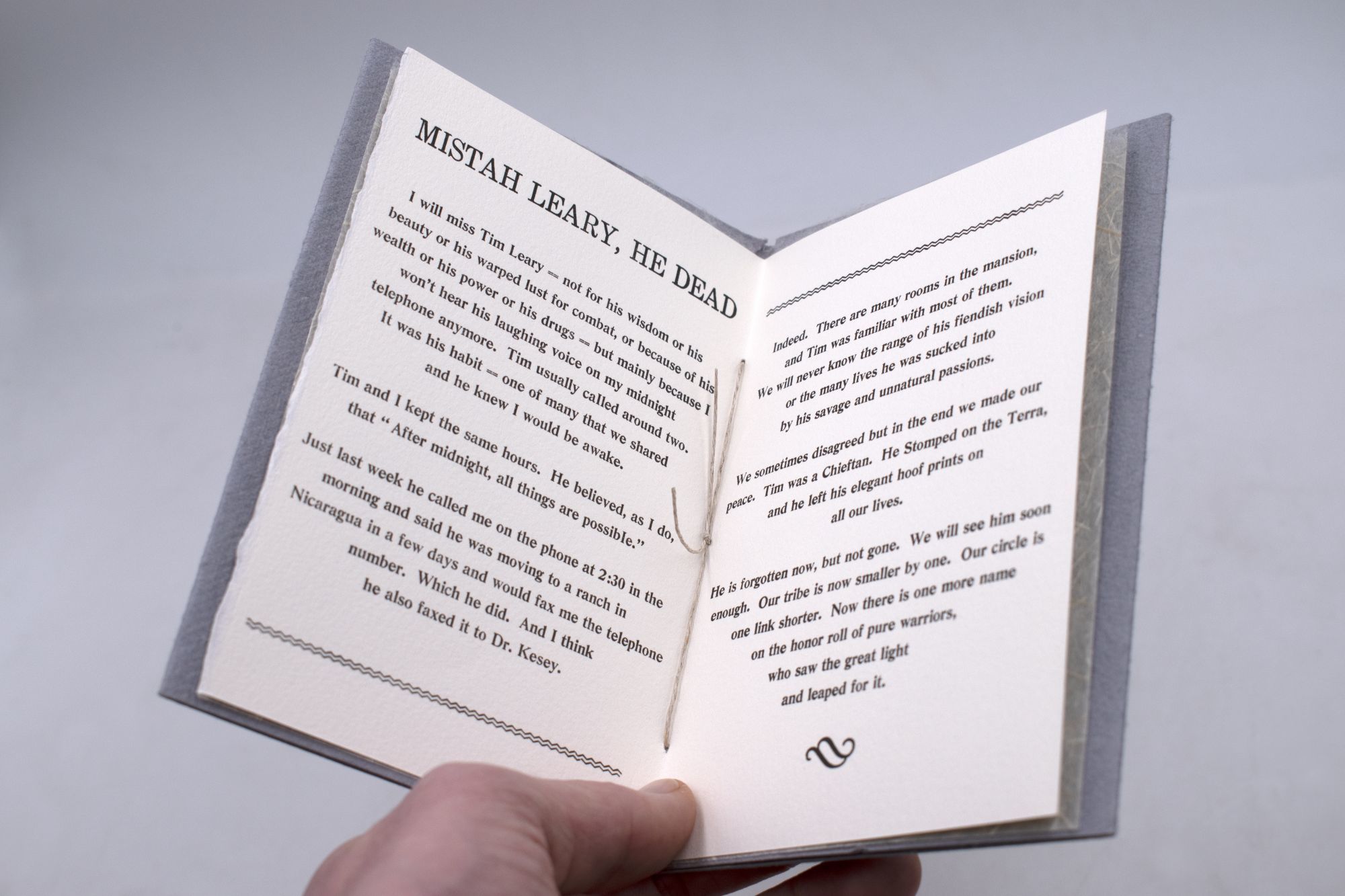 San Francisco: X-Ray Book Company, 1996. First edition, No. 147 of 300 [there are an additional 26 lettered copies as well]. Letterpress chapbook, front inside cover reads, "Woody Creek, Colorado, June 9, 1996" Back flap has embossed Gonzo logo and beneath flap states printed by hand in New Orleans. Back cover holds a sheet of acid blotter paper featuring Leary's face. The bottom of the page is stamped "Caution do not drop". 1 vols. 16mo. Hand-sewn wrappers are fine. Tissue endpaper and inner pages are bright and clean. A fine copy. Johnny Brewton; Karoline Schleh. First edition, No. 147 of 300 [there are an additional 26 lettered copies as well]. Letterpress chapbook, front inside cover reads, "Woody Creek, Colorado, June 9, 1996" Back flap has embossed Gonzo logo and beneath flap states printed by hand in New Orleans. Back cover holds a sheet of acid blotter paper featuring Leary's face. The bottom of the page is stamped "Caution do not drop". 1 vols. 16mo. Thompson's eulogy to Timothy Leary, originally printed in Rolling Stone magazine.
