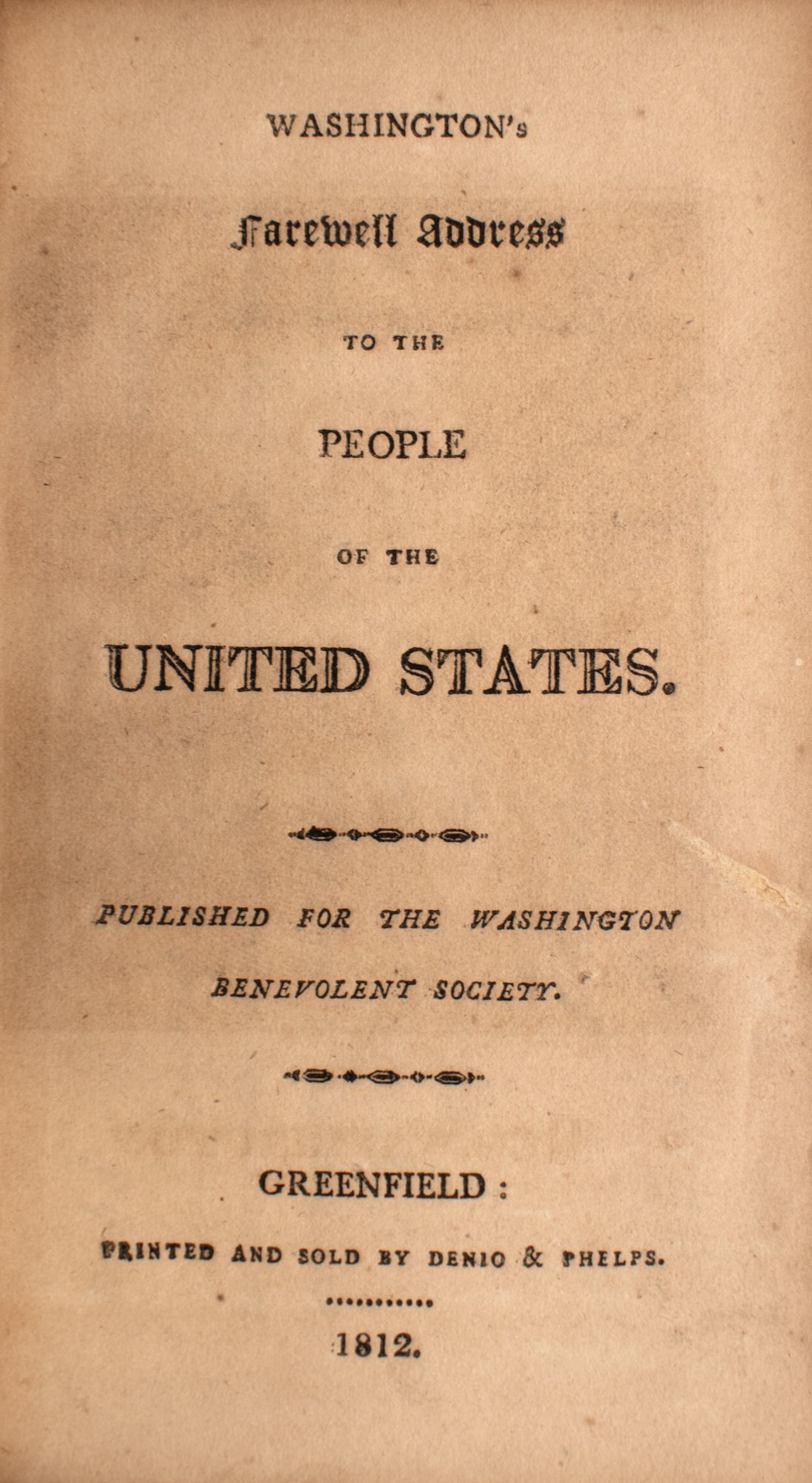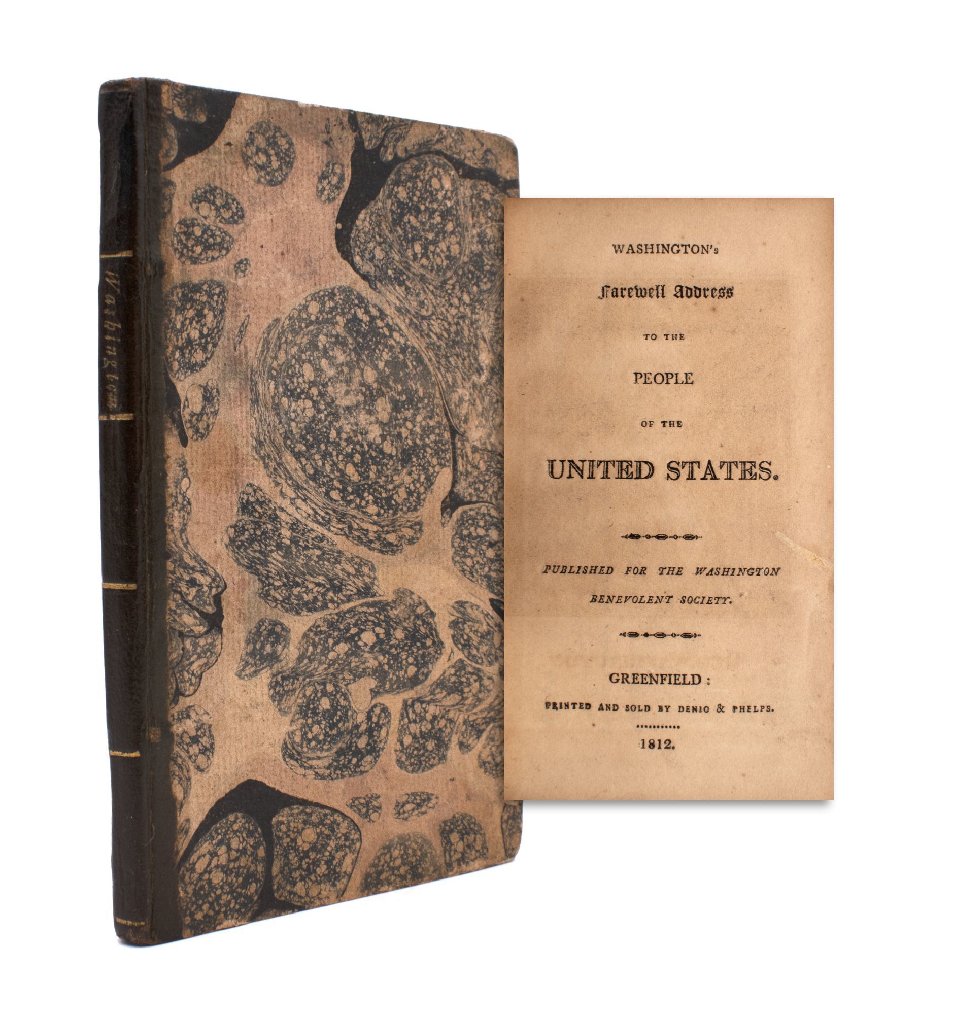 Greenfield: Printed and sold by Denio & Phelps, 1812. Stipple engraved frontispiece portrait engraved by Gimbrede. 40pp. Partly-printed Washington Benevolent Society form accomplished in manuscript for Cyrus Washburn, signed by John Barrett, president, and Charles Bowen, Secretary. 12mo. Contemporary calf-backed marbled paper covered boards. Stipple engraved frontispiece portrait engraved by Gimbrede. 40pp. Partly-printed Washington Benevolent Society form accomplished in manuscript for Cyrus Washburn, signed by John Barrett, president, and Charles Bowen, Secretary. 12mo. Written largely by Alexander Hamilton, Washington's famed Farewell Address was first printed in newspapers in September 1796 at the end of his second term as President, emphasizing the importance of unity and morality, the dangers of political factions and sectionalism and warning against "insidious wiles of foreign influence." The reaction to the address was immediate and overwhelmingly positive, printed within regional newspapers and as separate pamphlets and broadsides throughout the United States. The Washington Benevolent Societies were grass-roots political clubs set up between 1808-1816 by the Federalist Party, with copies of Washington's address given to members.