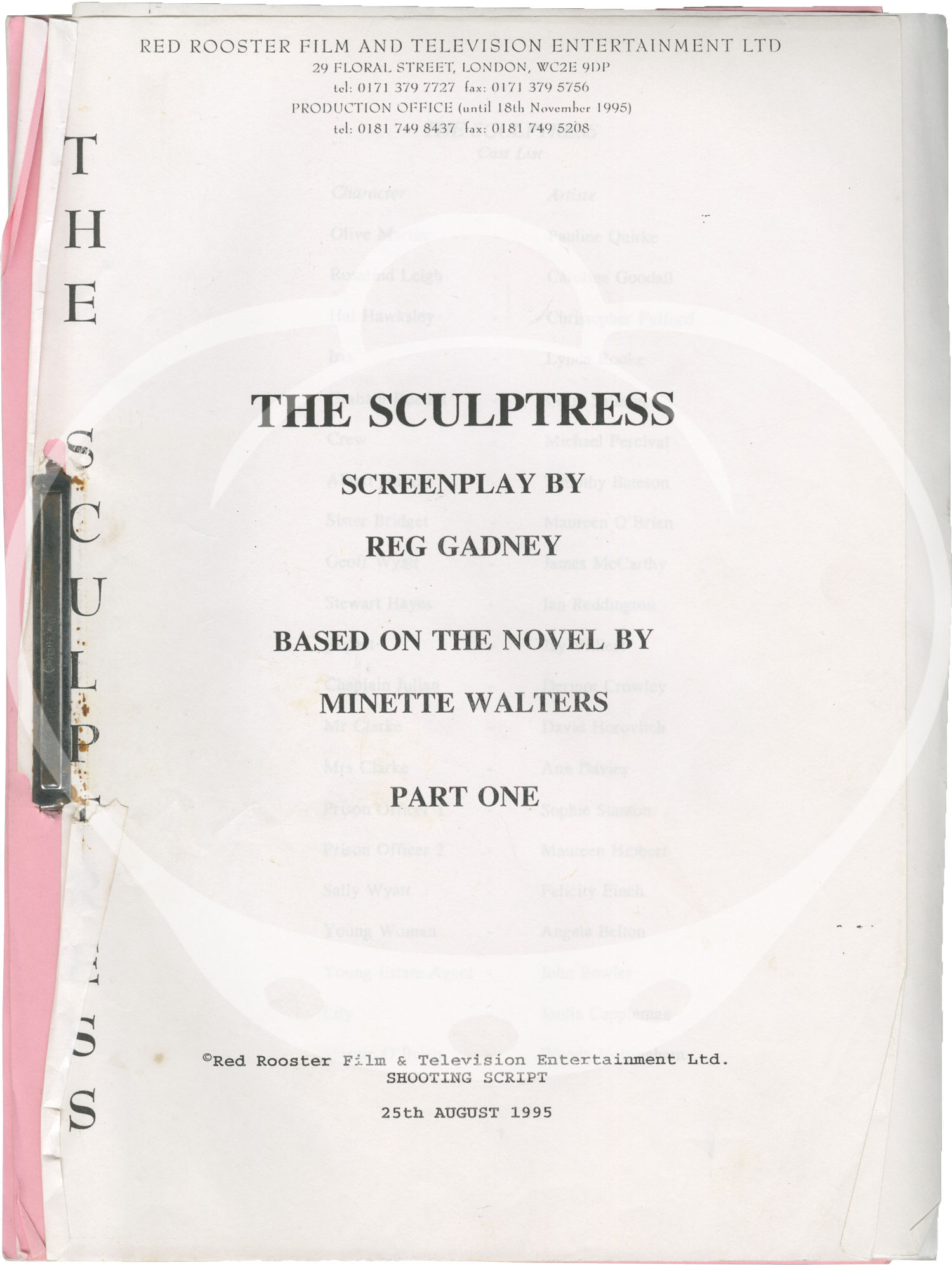 White titled self wrappers, noted as SHOOTING SCRIPT on the front wrapper, dated 31st AUGUST 1995, with credits for screenwriter Reg Gadney and novelist Minette Walters. 65 leaves, with last page of text numbered 56. Xerographic duplication, rectos only, with pink and blue revision pages throughout, dated variously between 13.9.95 and 28.9.95. Pages Very Good plus, wrapper Very Good plus, with rusting and creasing to the binding, with silver prong binding.