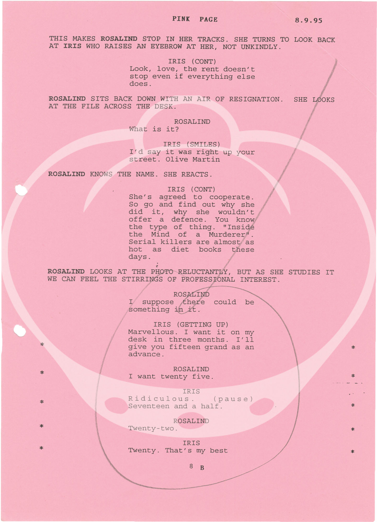 White titled self wrappers, noted as SHOOTING SCRIPT on the front wrapper, dated 30th AUGUST 1995, with credits for screenwriter Reg Gadney and novelist Minette Walters. 52 leaves, with last page of text numbered 52. Xerographic duplication, rectos only, with pink revision pages throughout, dated 13.9.95. Pages Very Good plus, wrapper Very Good plus, with rusting and creasing to the binding, with silver prong binding.