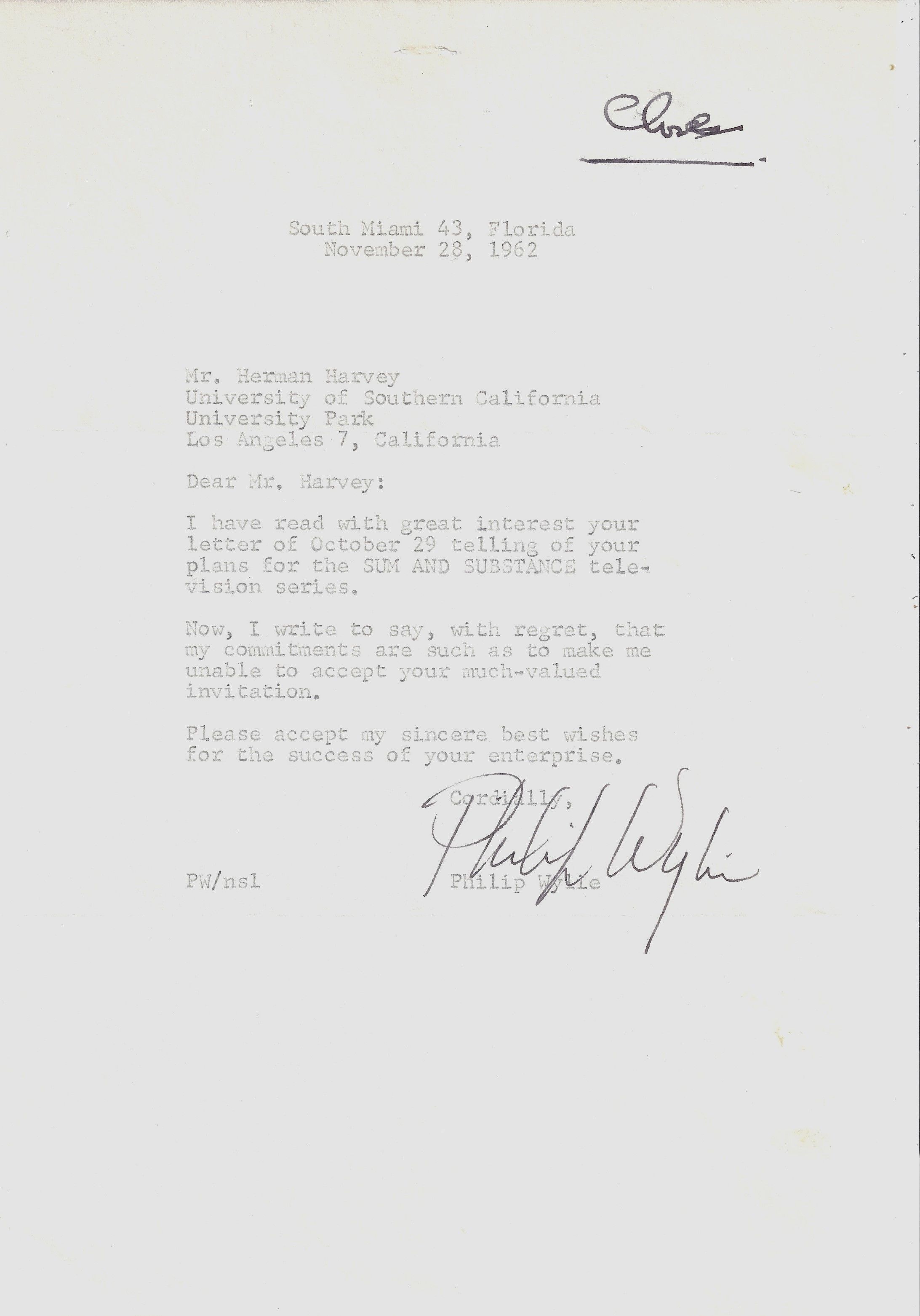 South Miami, 28 November 1962. Letter. Creases from mailing. Near Fine. A one-page TYPED LETTER SIGNED on 8-1/2" x 11" paper to Herman Harvey of the University of Southern California declining his invitation to appear on his educational television series. Wylie is perhaps best known for his book GENERATION OF VIPERS.