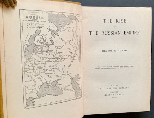 Boston: L.C. Page and Co, 1900. Cloth. Very Good. The 1900 1st edition of the first book published by H.H. Munro, who soon would adopt the nom de plume "Saki". Solid and VG in its mustard cloth, with bright gilt-titling along the spine. Light soiling and spotting to the panels, neat former owner name (in pencil) at the front pastedown. Thick octavo, top-edge gilt.