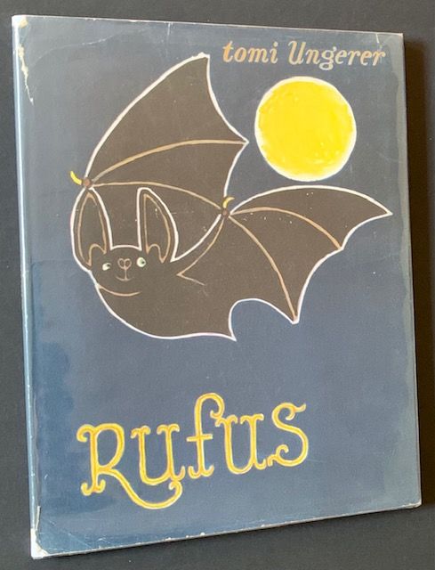 New York: Harper & Brothers, 1961. Near Fine/Very Good. Tomi Ungerer. The 1961 correct 1st edition (with the "$2.95" price and the "40/80" and "0961" codes along the front dustjacket flap) of this beloved Tomi Ungerer tale of Rufus the bat. Clean and Near Fine in a crisp, VG dustjacket, with several small closed tears along the panel edges and light chipping at the spine ends. Still though, a very presentable copy. Tall quarto, wonderfully illustrated thruout in rich color by the maestro Tomi Ungerer.