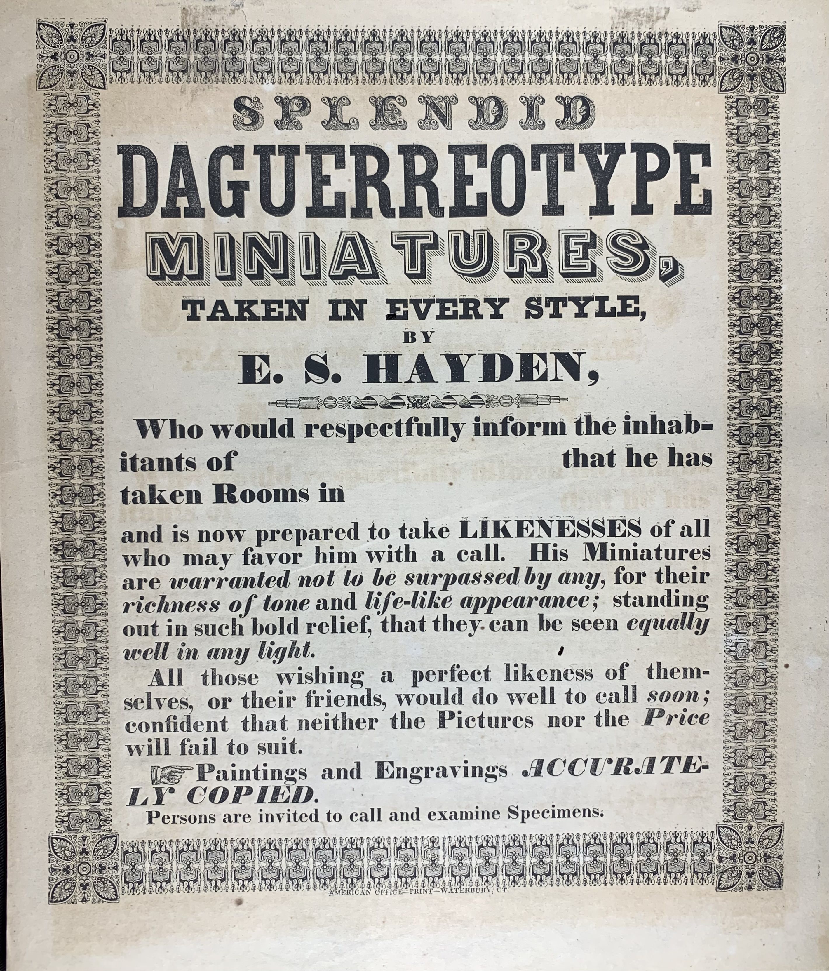 Original early letterpress broadside. 10 by 12 inches. Illustrated with decorated border. American Office Waterbury, CT (ca. 1850).