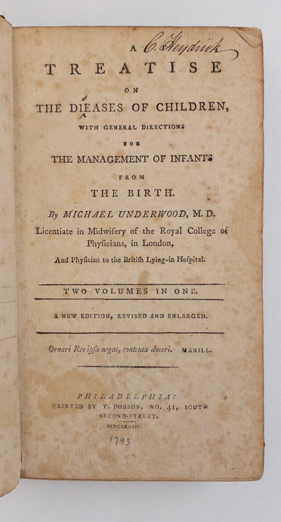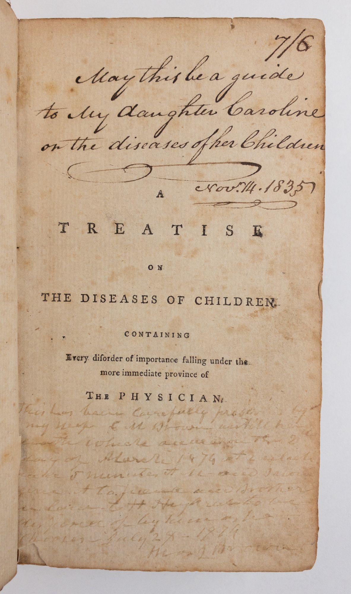 Philadelphia: T. Dobson, 1793. A New Edition, Revised and Enlarged. Hardcover. 12mo, xx, 404, 105-108 pages. In Good condition. Bound in full brown calf and bearing a label with gilt titling and ruling to spine. Chipping to head and tail of spine; rubbing and bumping to edges and corners of boards. Joints repaired with dyed archival paper. Text block age toned and foxed and hinges cracked but stable. Handwritten ink ownership inscriptions to half title, title page, first page of preface, and table of contents. MF Consignment. Shelved in Rm. G. The provenance note at the top of the half title page reads: "May this be a guide to my daughter Caroline on the diseases of her Children. Nov. 14. 1835." A second note, in another hand, at the bottom of the same page reads: "This has been carefully preserved by my wife C M Brown untill her death which occurred the 2nd day of March 1874 at [illegible] 5 minutes [illegible] and I now give it to friend and brother in law C. H. Heydrick to be disposed of by him as he chooses. July 28 1874 / Thos. J. Brown." The name written on the title page is "C. Heydrick"; the name on the first page of the preface and on the table of contents is "Christopher Heydrick." 1355890. Special Collections.