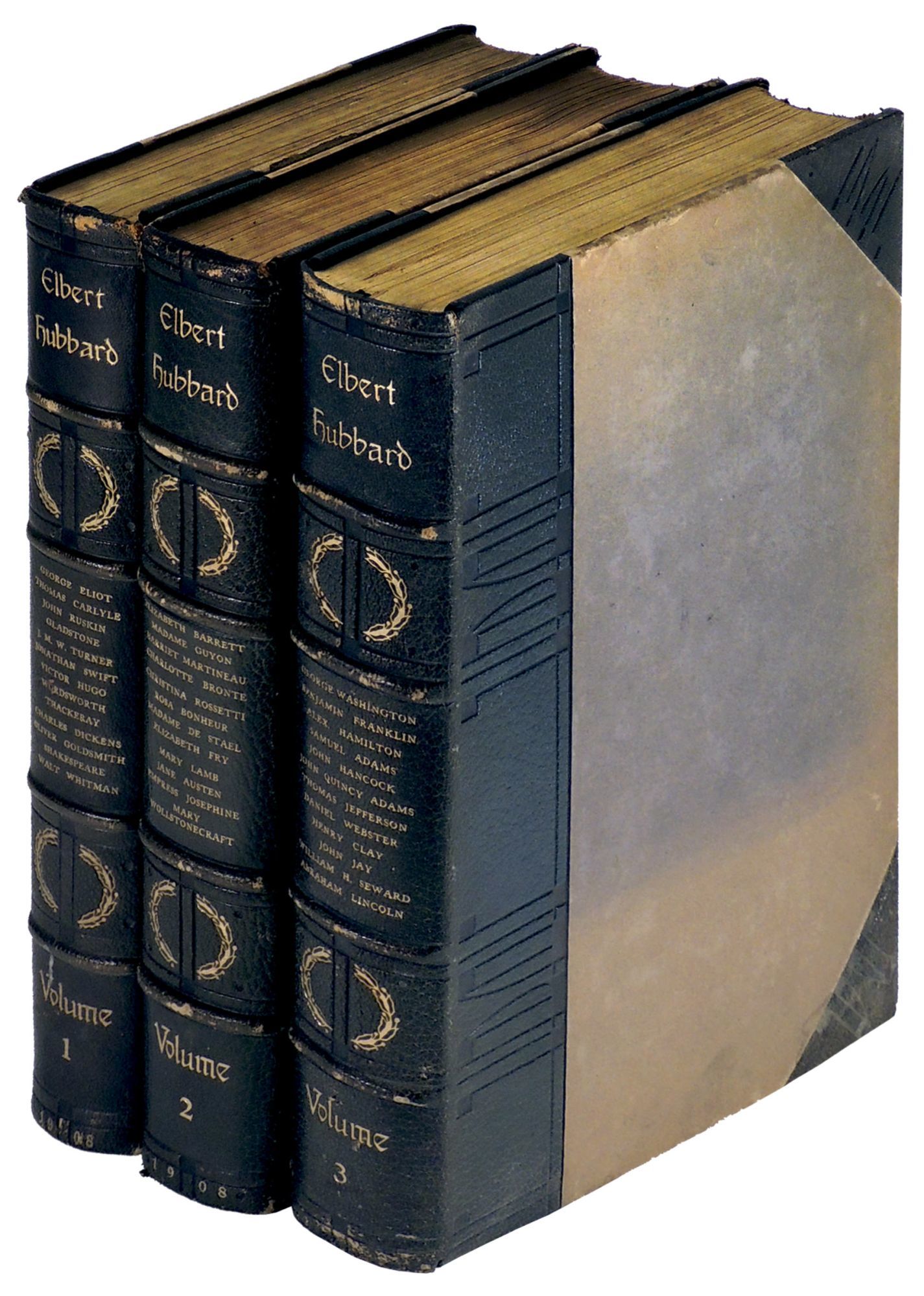 East Aurora, NY: The Roycroft Shop, 1908. Hardcover. Very Good. Hardcover. Author's Edition. Each of the three volumes are numbered 491 of 1,000 copies. All are signed by Hubbard. Illustrated. These three volumes include writings from Hubbard's Little Journeys series which discusses authors, artists, politicians, and other people of note. All volumes are bound in three quarter navy blue leather over blue paper covered boards with gilt titles to spines. Rubbing, wear, scuffing, minor soiling, and fading to boards and edges. Interiors are clean and bright overall; however, there are occasional smudges to margins and illustrations are toned. Dampstaining to top corners of most pages in second volume. Volume I is 281 pages; Volume II is 313 pages; Volume III is 320 pages. PRI/062922.