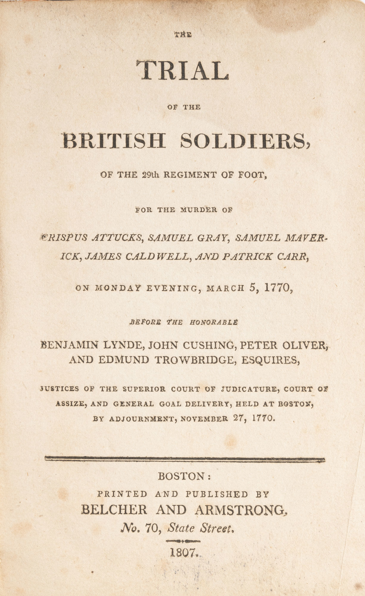 1807. Boston: Belcher and Armstrong, 1807.. Boston: Belcher and Armstrong, 1807. The Trial that Followed the Boston Massacre [Trial]. [Wemms, William, Primary Defendant]. The Trial of the British Soldiers, Of the 29th Regiment of Foot, For the Murder of Crispus Attucks, Samuel Gray, Samuel Maverick, James Caldwell, And Patrick Carr, On Monday Evening, March 5, 1770. Boston: Printed and Published by Belcher and Armstrong, 1807. 120 pp. Octavo (7-1/2" x 5"). Contemporary marbled boards with later rebacking, quarter-paper spine with printed title and ornaments. Moderate rubbing to boards, heavier rubbing to board edges with wear to corners, joints starting, hinges cracked, boards secure. Light browning to interior, faint dampstaining to margins in a few places, light soiling to title page. $950. * Reissue of the first edition, published in 1770 with a title beginning The Trial of William Wemms. The violent confrontation between soldiers and citizens known as the Boston Massacre resulted in the trial of eight soldiers for murder. Defended by John Adams and Josiah Quincy, six were acquitted and two, who fired fatal shots, were convicted of manslaughter, burned on the hand and released. McDade, The Annals of Murder 122 (note). Cohen, Bibliography of Early American Law 13203.