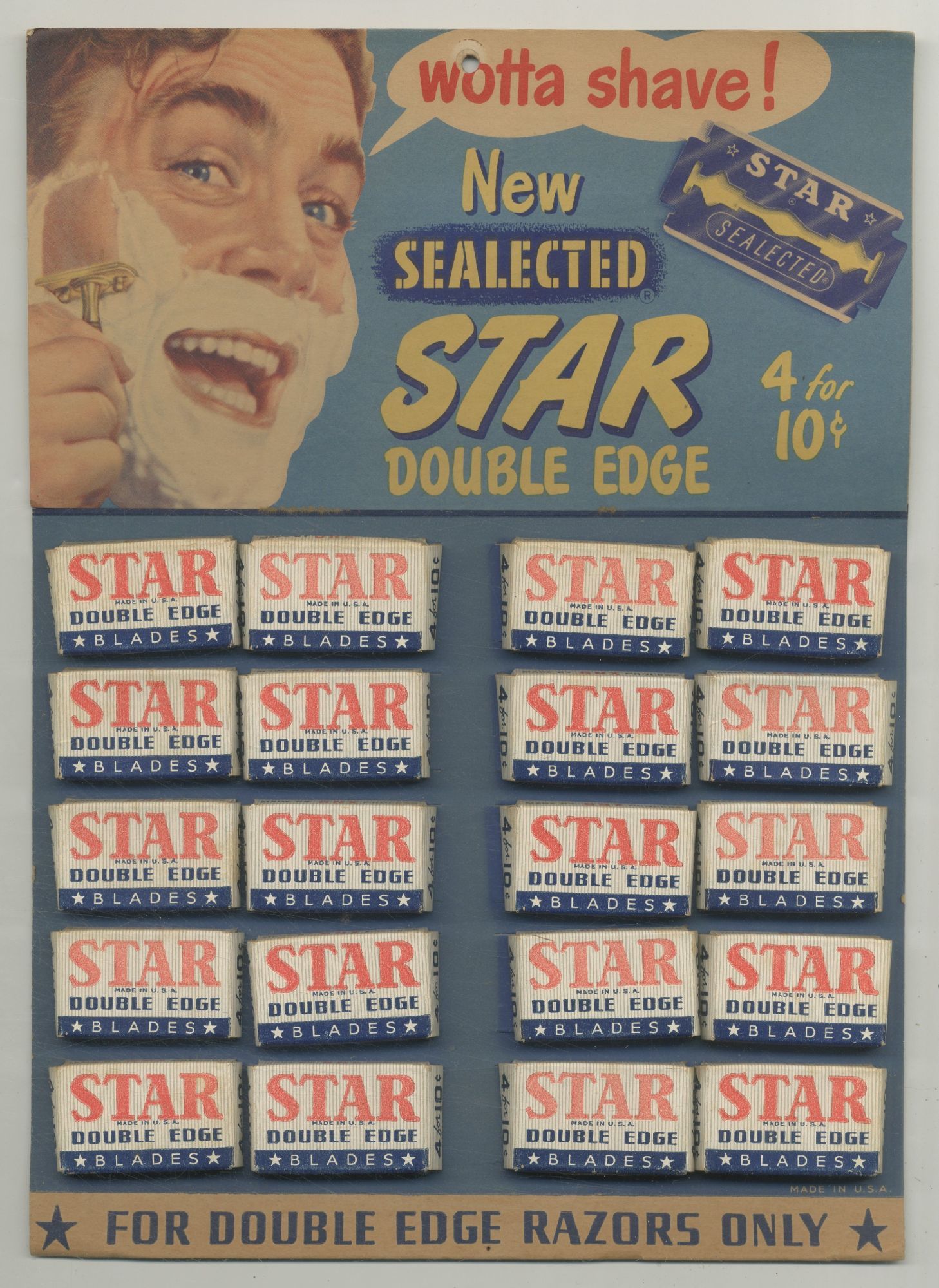 [Point of sale display broadside]: Wotta Shave! New Sealected Star Double Edge. 4 for 10c
