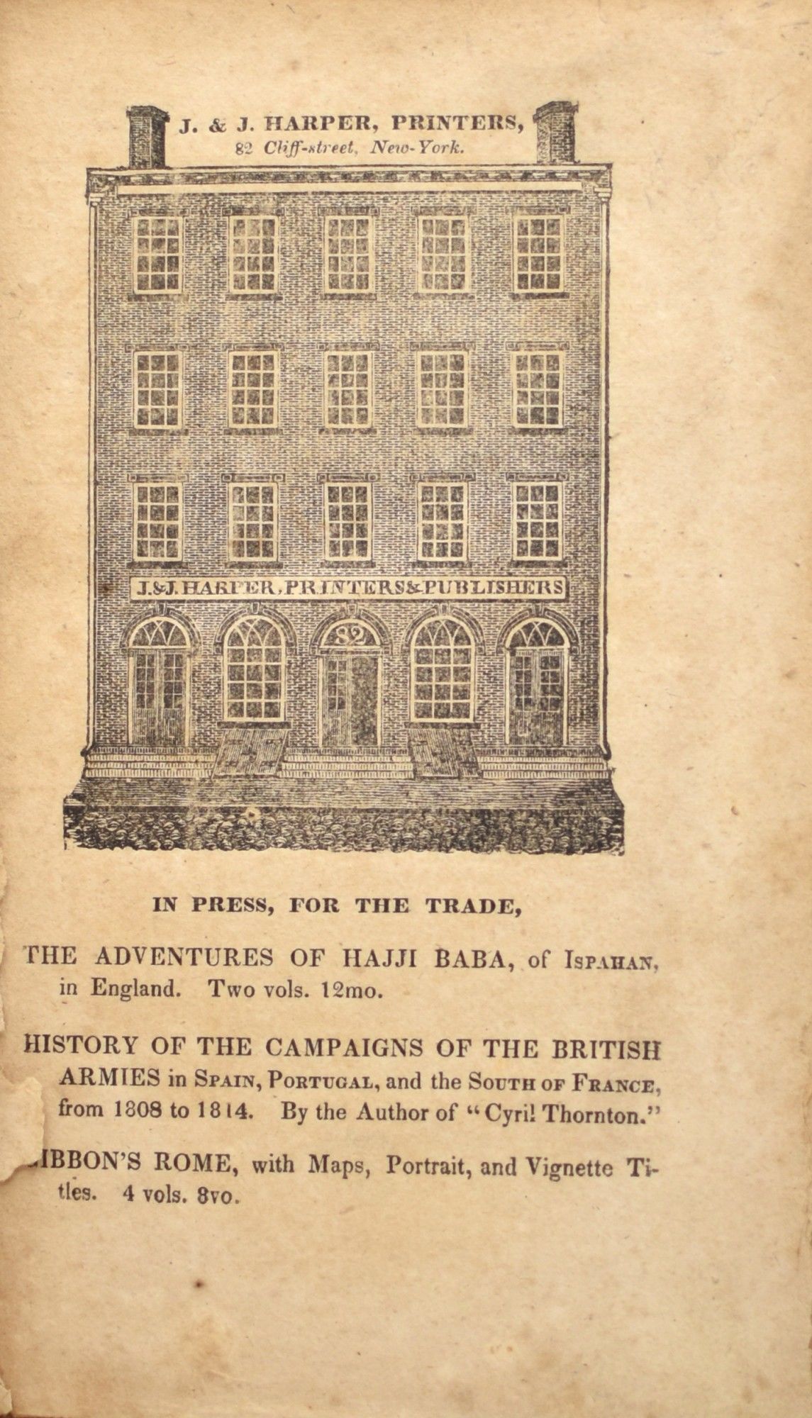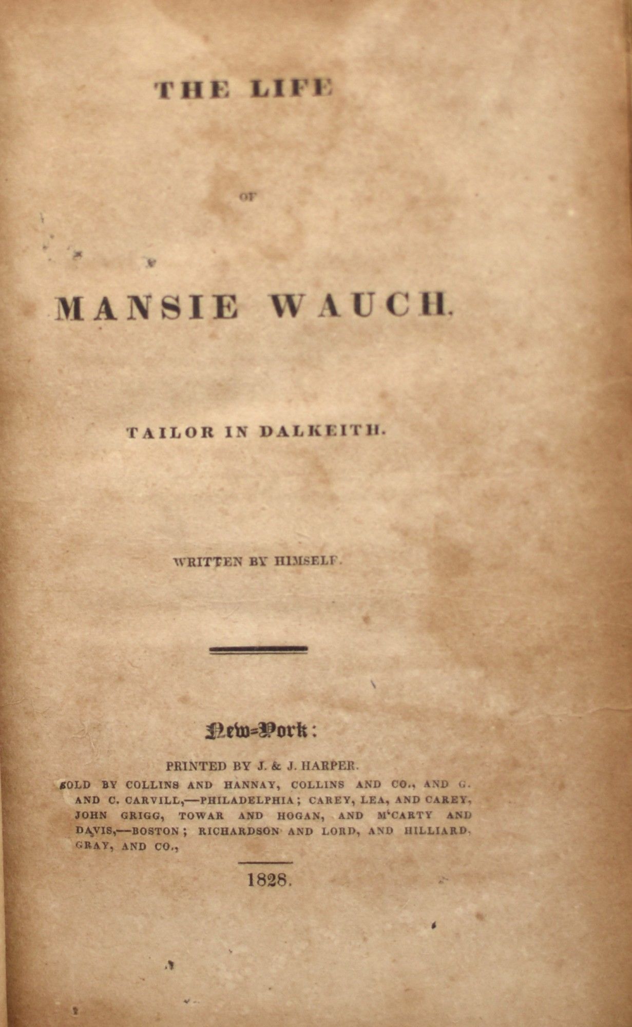 New York: J. & J. Harper, 1828. First American Edition. Hard Cover. Very Good binding. 8vo. (8 1/8" x 4 7/8"); in the publisher's board backed in drab cloth with a partial publisher's label to the spine; xii, [13] 14-223 pages; lacking the front endpaper, but with a lovely engraved image of the building housing J. & J. Harper at the front of the book, followed by 2 pages of publisher's ads.~~With quite remarkable Scots dialect: "What could I do? My love had vanished like lightning; but oh, I was in a terrible gliff! Instead of gundy. I sold my thrums to Mrs. Walnut for a penny ... I wrote out a letter to the minister .. begging him not to believe Jess's word, as I was not able to keep a wife, and as she was a leeing gipsy." (page 3). Very Good binding.