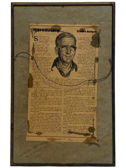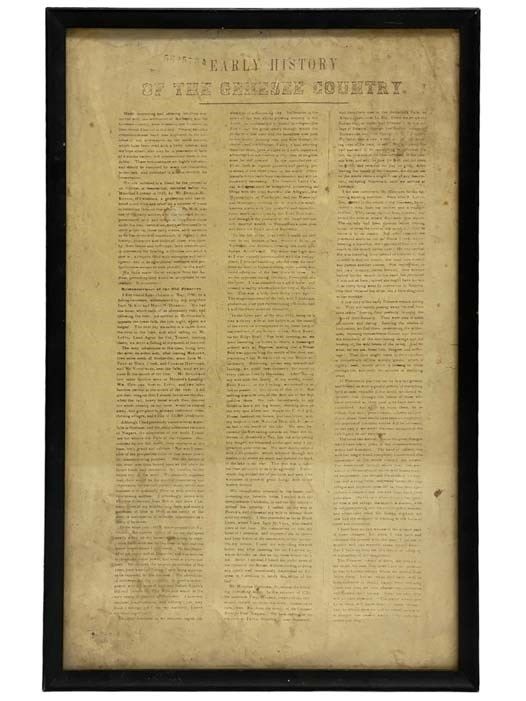 S.N. Single Sheet. Very Good. Appears to be a copy of an earlier document. A few small tears, lightly soiled. Stuart Bolger article attached to rear (Bolger was instrumental in the design and construction of Genesee Country Village). 17 x 11 (frame dimensions). Early History of the Genesee Country, Framed Single Sheet, with wire for hanging. Includes extracts from Donald McKenzie's Pioneer History of Caledonia, which discusses early Lake Ontario settlers, the Genesee Falls, and Nathaniel Rochester. Orsamus Turner used as a source when writing his local histories.
