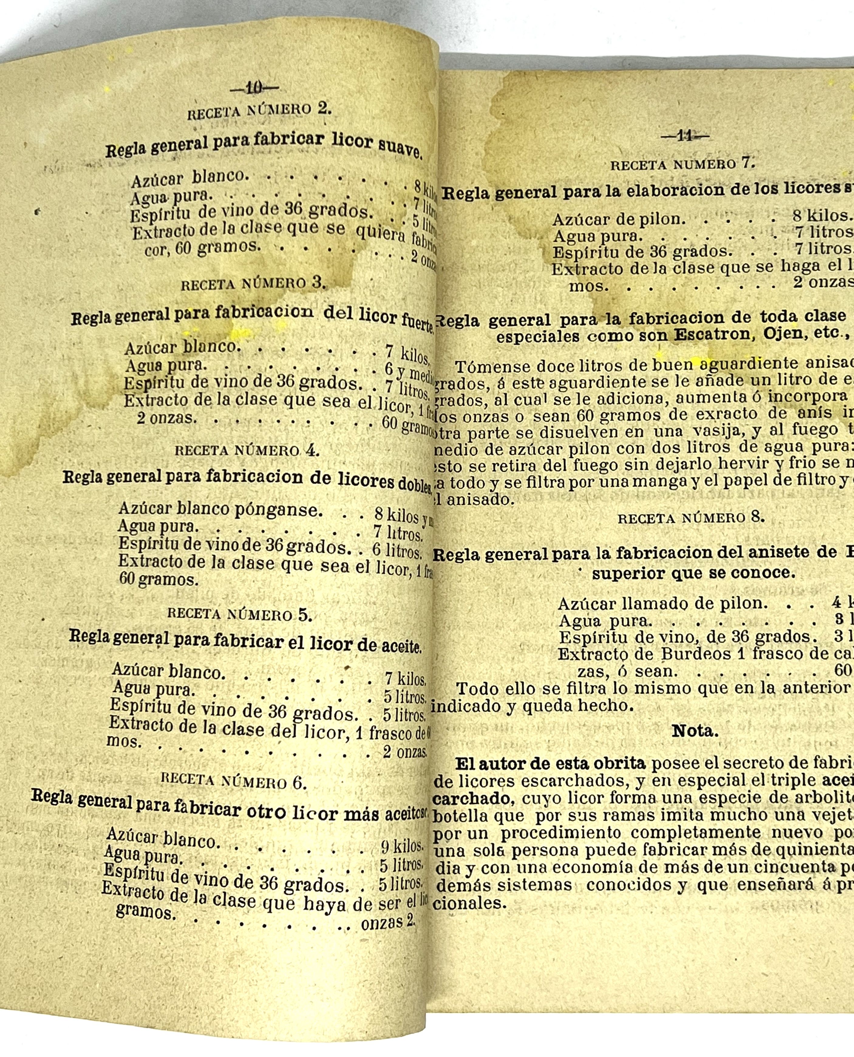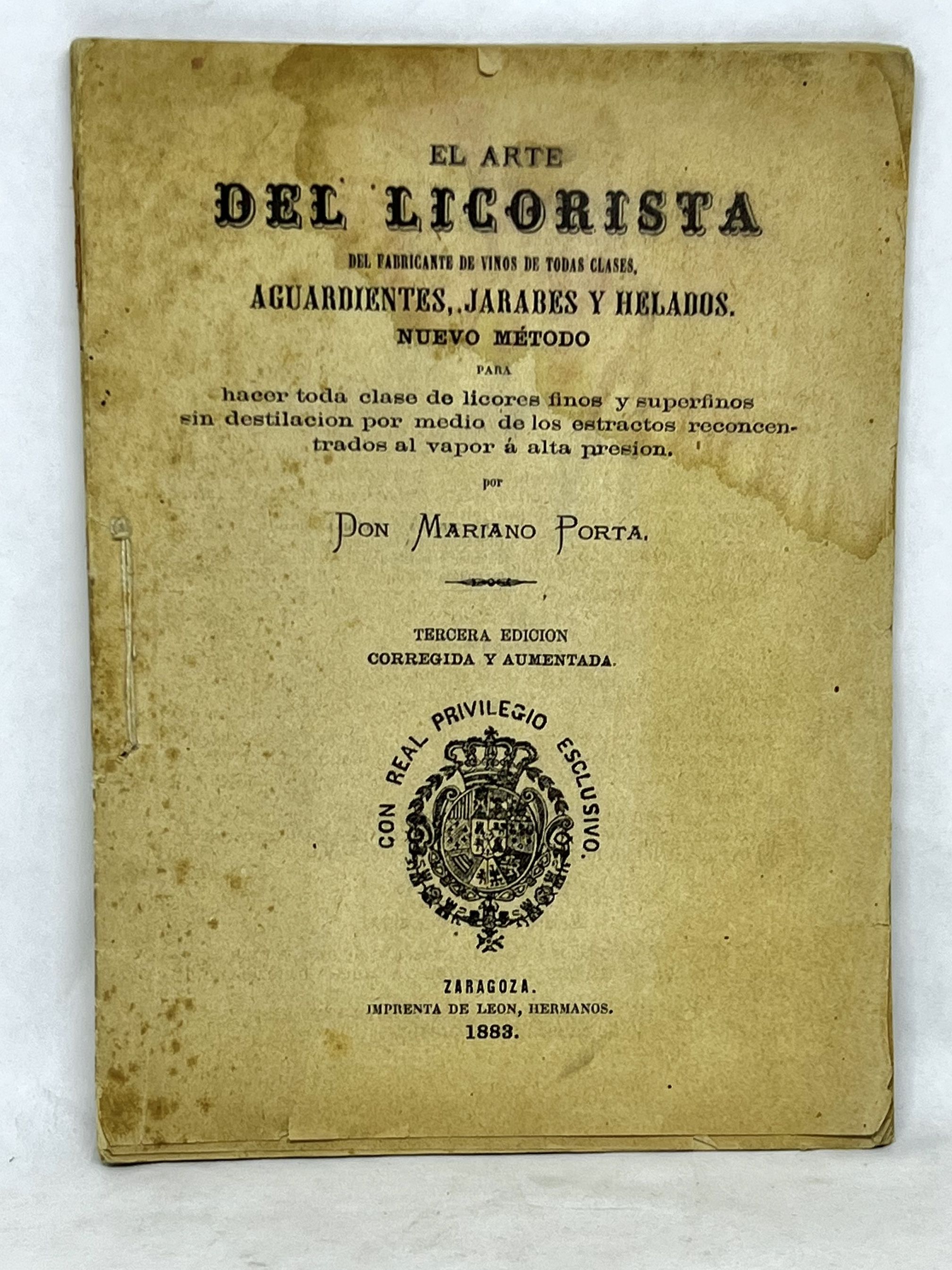 Zaragoza, Spain, 1883. Sewn binding. Tan paper pamphlet. Good. 81 pages. 21 x 15.5 cm. (The Art of the Liquorist. From the Manufacturer of Wines of All Kinds, Spirits, Syrups & Ice Cream. New method to make all kinds of fine and superfine liquors without distillation by means of the extracts reconcentrados by steam at high pressure). A scarce 19th-century Spanish pamphlet issued in Zragoza, the capital of Aragón. Mariano Porta presents an innovative distillation-free system for producing liqueurs, outlining processes for wines, cordials, syrups, ice creams, teas, and creams. Includes detailed instructions reflecting contemporary chemical and culinary practices. Heavily water-stained throughout (affecting the upper thrid of the pages), though the text remains entirely legible.