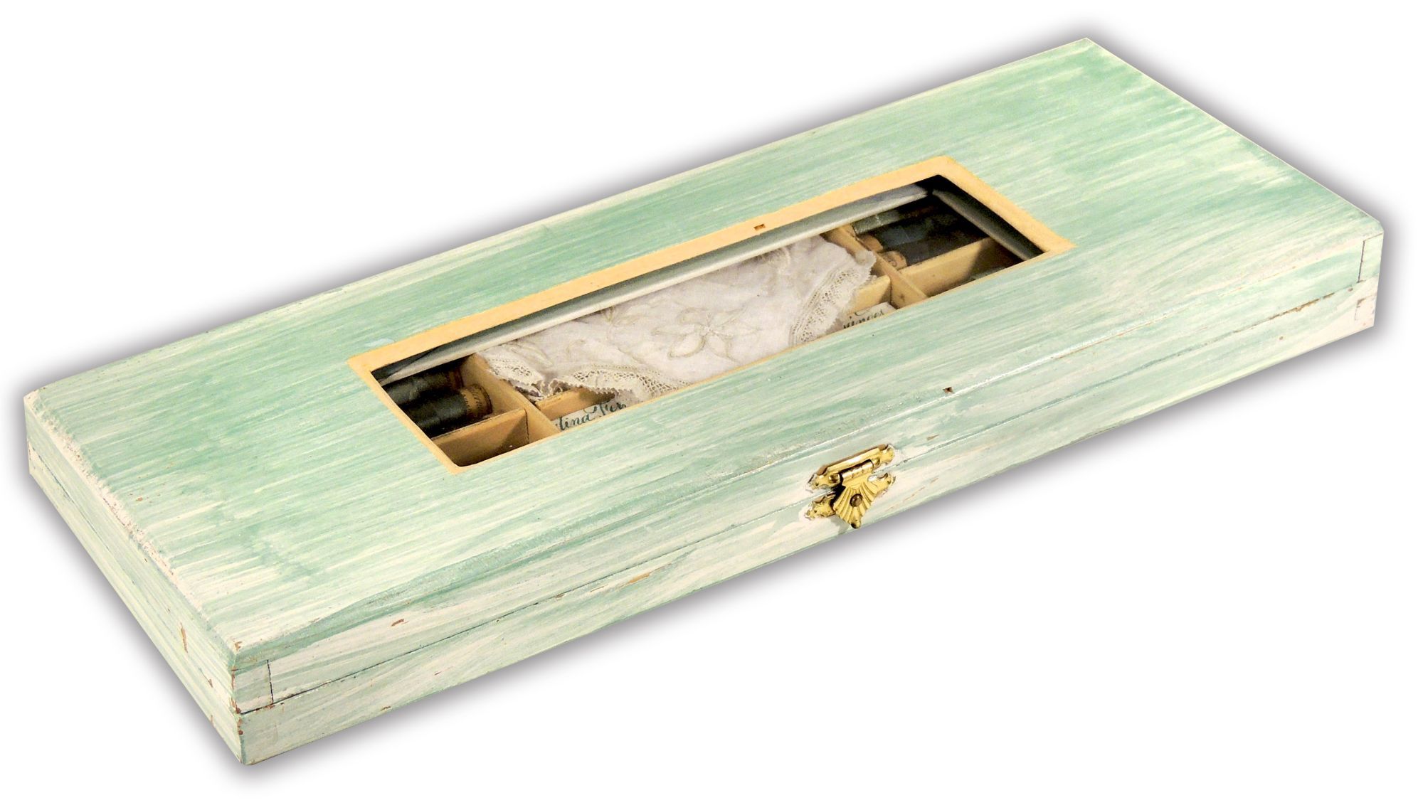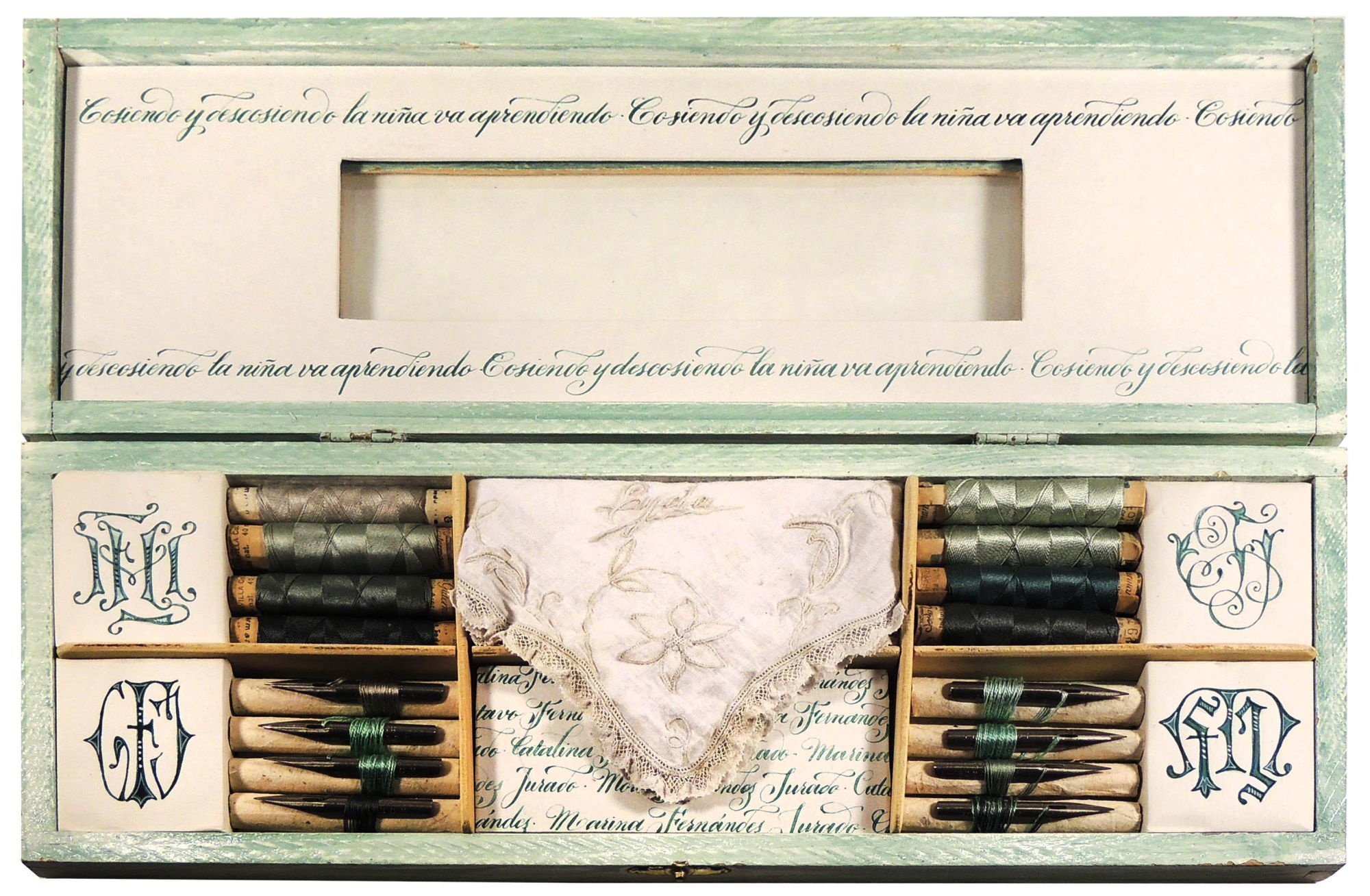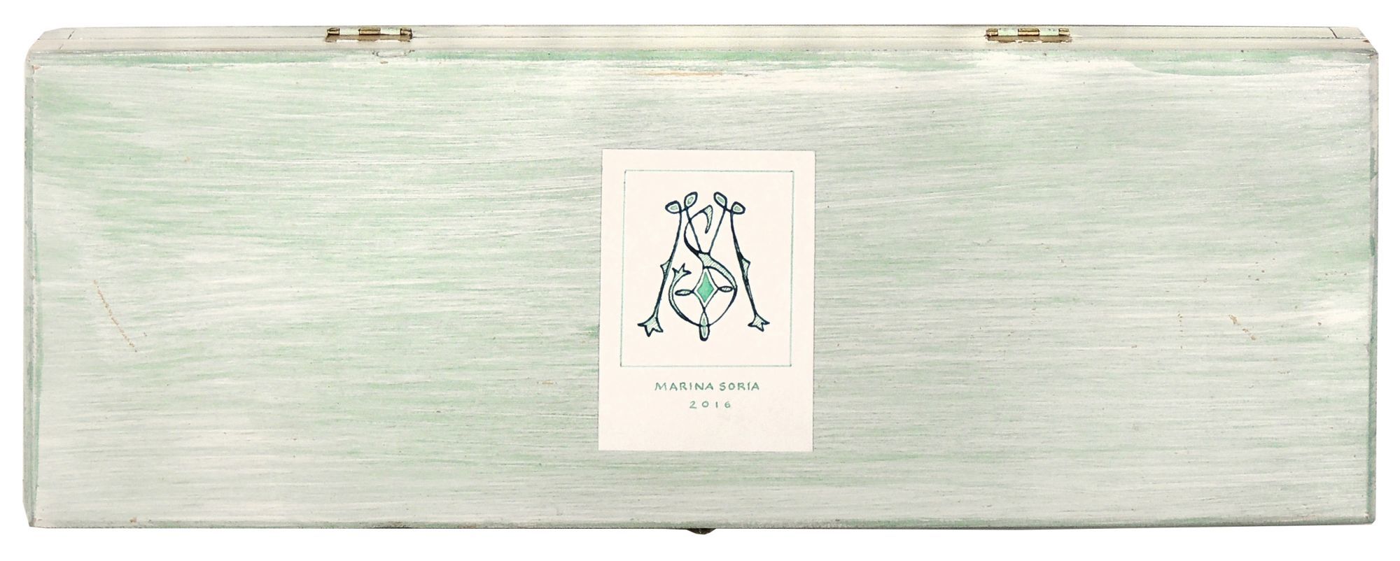 Buenes Aires: Marina Soria, 2016. Fine. Unique. An engaging and personal work by world renowned calligrapher and book artist Marina Soria. It is a light blue wooden box with a glass window that opens to reveal calligraphic text and monograms done in watercolor and gouache on Strathmore paper. It is decorated with compartments containing old sewing threads and nibs. There is also a found object - a delicately embroidered white handkerchief. The artists writes: "The monograms are made from the initials of my daughters and my husband´s names. My daughters: MFJ: Mora Fernández Jurado / CFJ: Catalina Fernández Jurado / MFJ: Marina Fernández Jurado. GFJ: Gustavo Fernández Jurado. My monogram is at the back of the box: MS The text is a quote my granny used to say to me when I was a child. The original text is in Spanish "Cosiendo y descosiendo la niña va aprendiendo" Translation: "stitching and unstitching the little girl keeps on learning." In fine condition. Measures 32.5 x 12 x 3 cm.