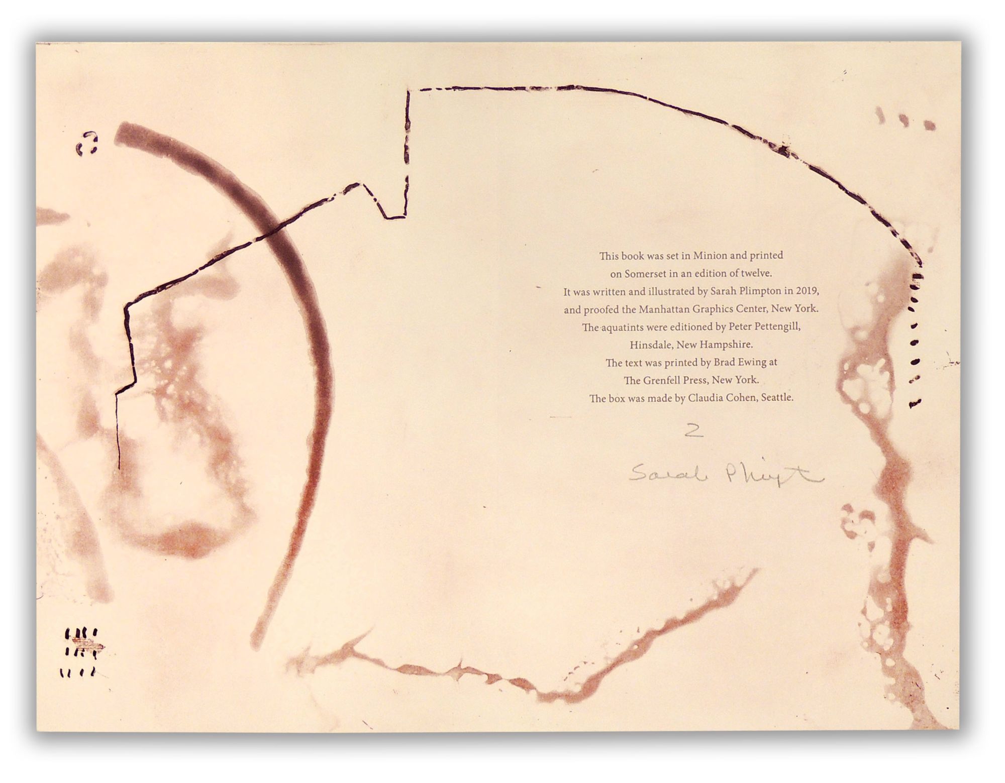 Set in Minion type and printed on Somerset paper. The aquatints were editioned by Peter Pettengill, Hinsdale, NH. The text was printed by Brad Ewing at The Grenfell Press in NY. In beige softcover wrappers and housed in purple and cream clamshell box made by Claudia Cohen. In fine condition. Measures 6.25 x 9.5 inches. Unpaginated. ARTISTSB/070522.
