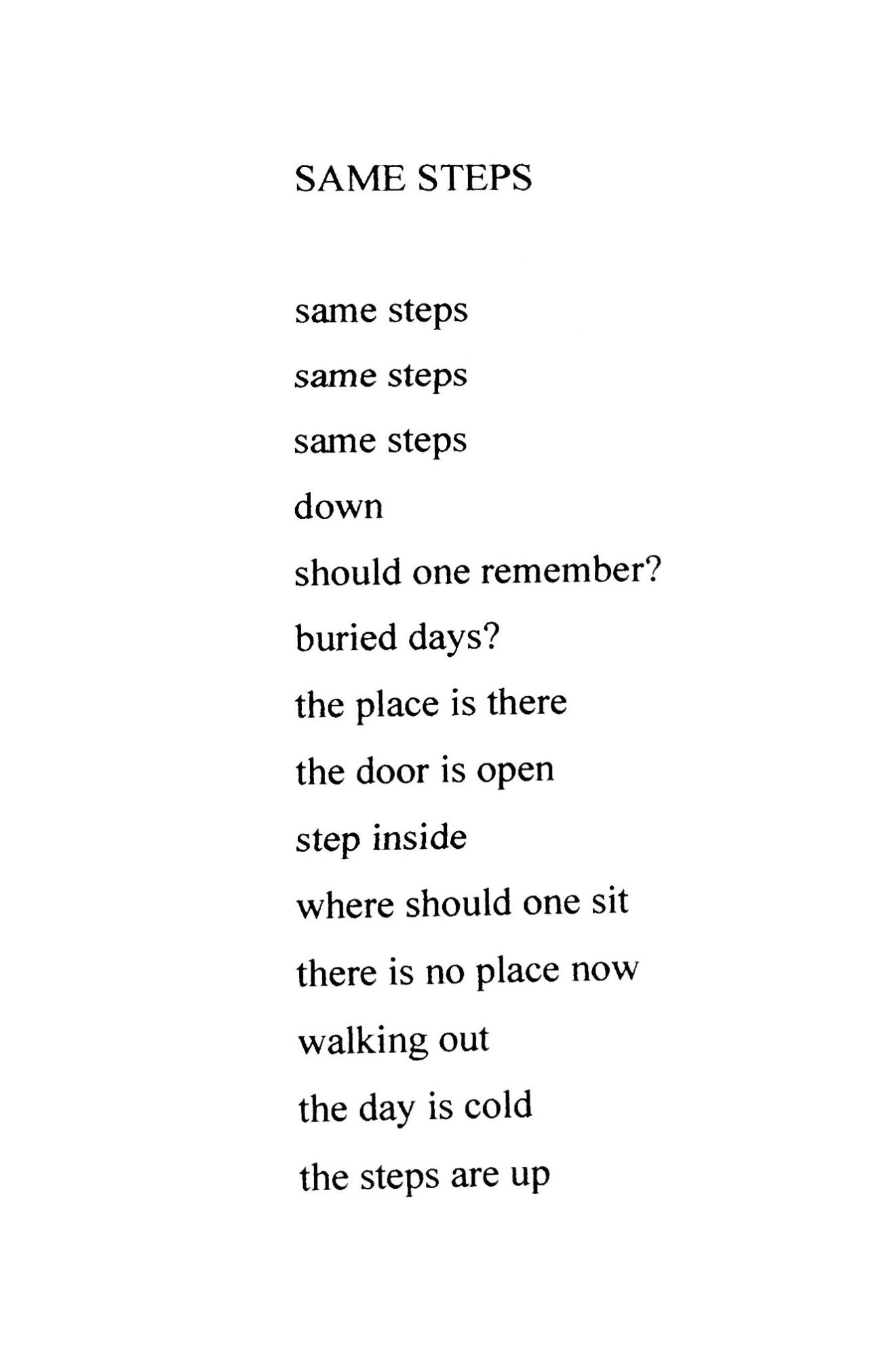 New York: Sarah Plimpton, 2019. Fine. Number 2 of 12 copies signed and numbered by the artist, who is also the author. Sarah Plimpton was born in New York City and divides her time between New York and France. She works in several media; oil painting, printmaking and artists’ books and is also a poet. Her books are in such collections as The Museum of Fine Arts, Boston, The New York Public Library, The Morgan Library, and the Metropolitan Museum of Art. This lovely little poem is printed on five bifolds, accompanied by evocative aquatints. "same steps/same steps/same steps/down/should one remember/buried days?/the door is open/step inside/where should one sit/there is no place now/walking out/the day is cold/the steps are up" In a review, John Ashbery describes Plimpton's poetry: "As quiet as a moment just before sleep, Sarah Plimpton's poems are like preludes to dreams. The “everyday” happens daily, but it is also rare and precious in Ms. Plimpton's transparent telling."