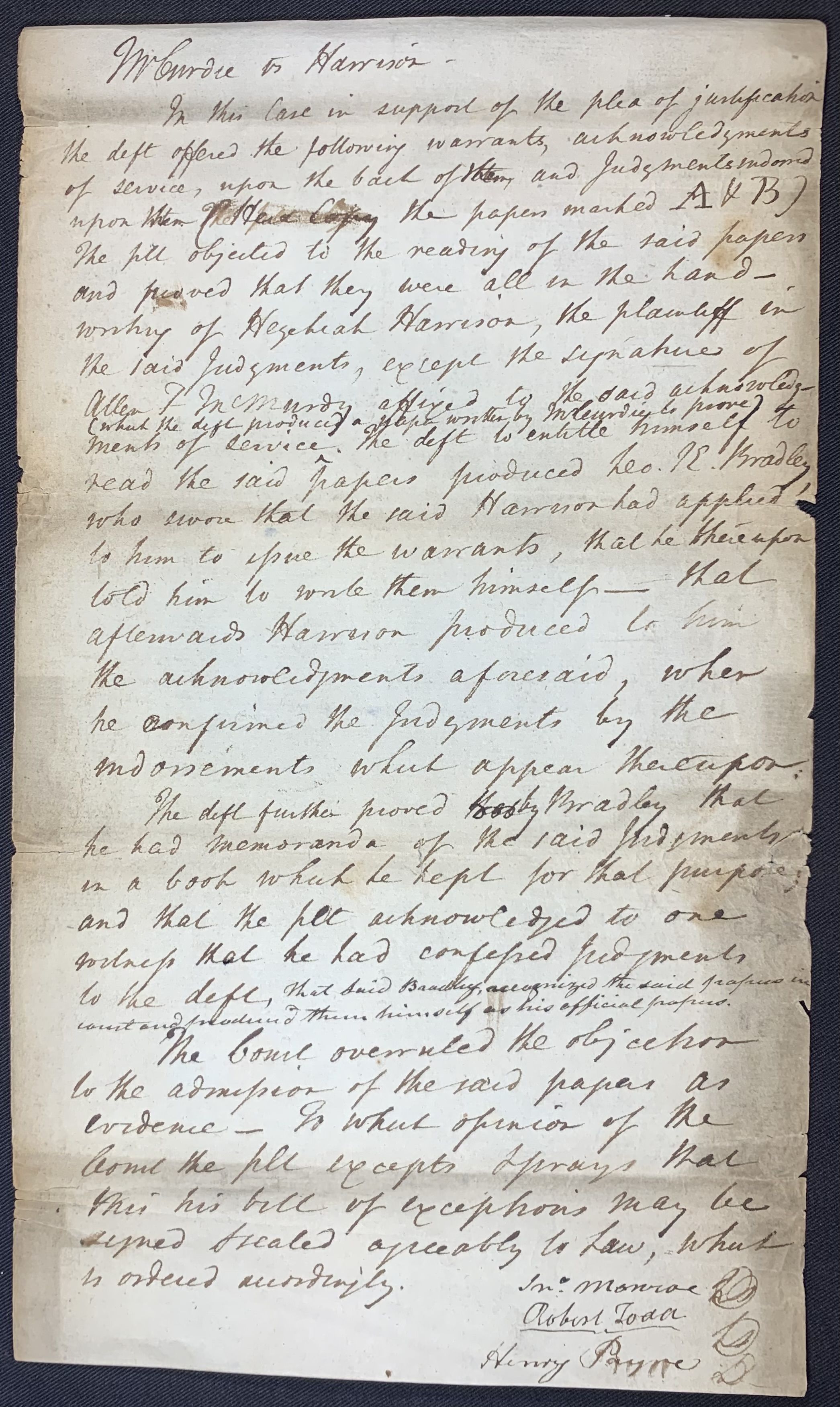 The document reads in part: "McCurdee vs Harrisons. In the case in support of the plea of justification the defendant offered the following warrants, acknowledgements of service . . . The plaintiff objected to the readings of the said papers ad proved that they were all in the handwriting of Hezekeah Harrison. . ."