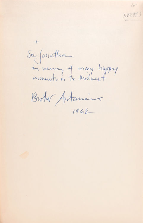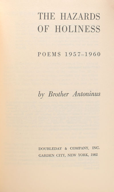 Garden City, New York: Doubleday, 1962. First edition. 94 pp. 1 vols. 8vo. Red cloth. Fine in fine dust jacket. First edition. 94 pp. 1 vols. 8vo. Inscribed: "To/ La Jonathan (Williams)/ in memory of many happy/ moments in the midwest/ Brother Antoninus/ 1962.