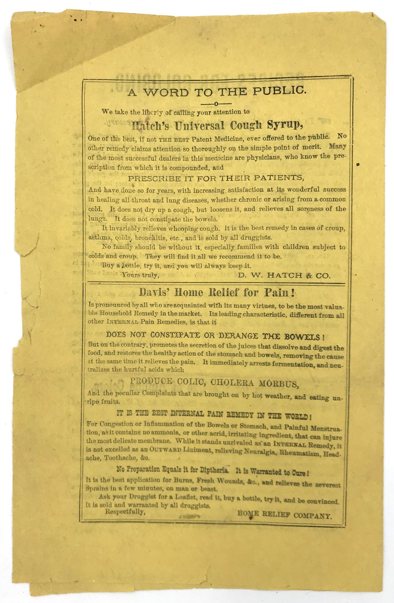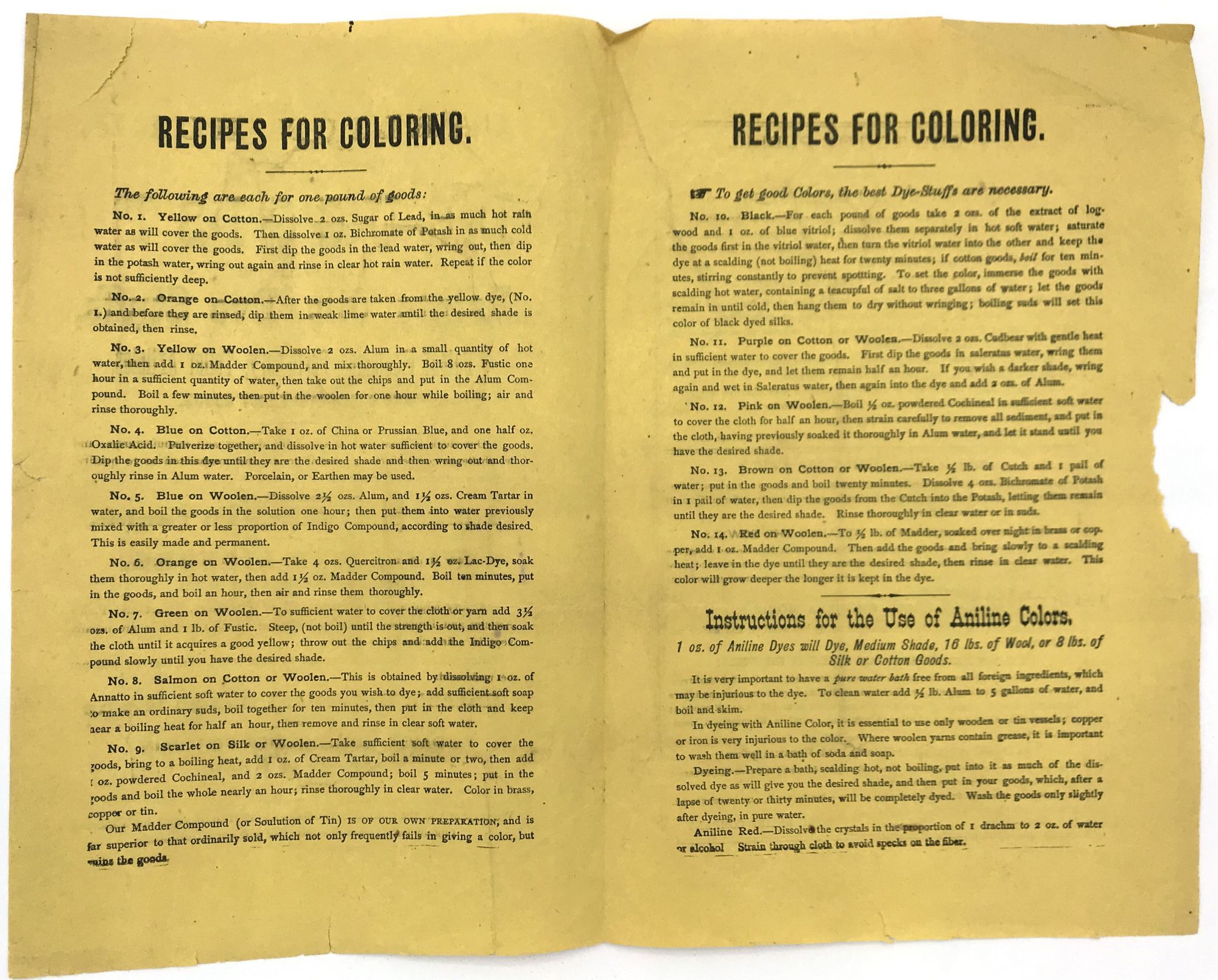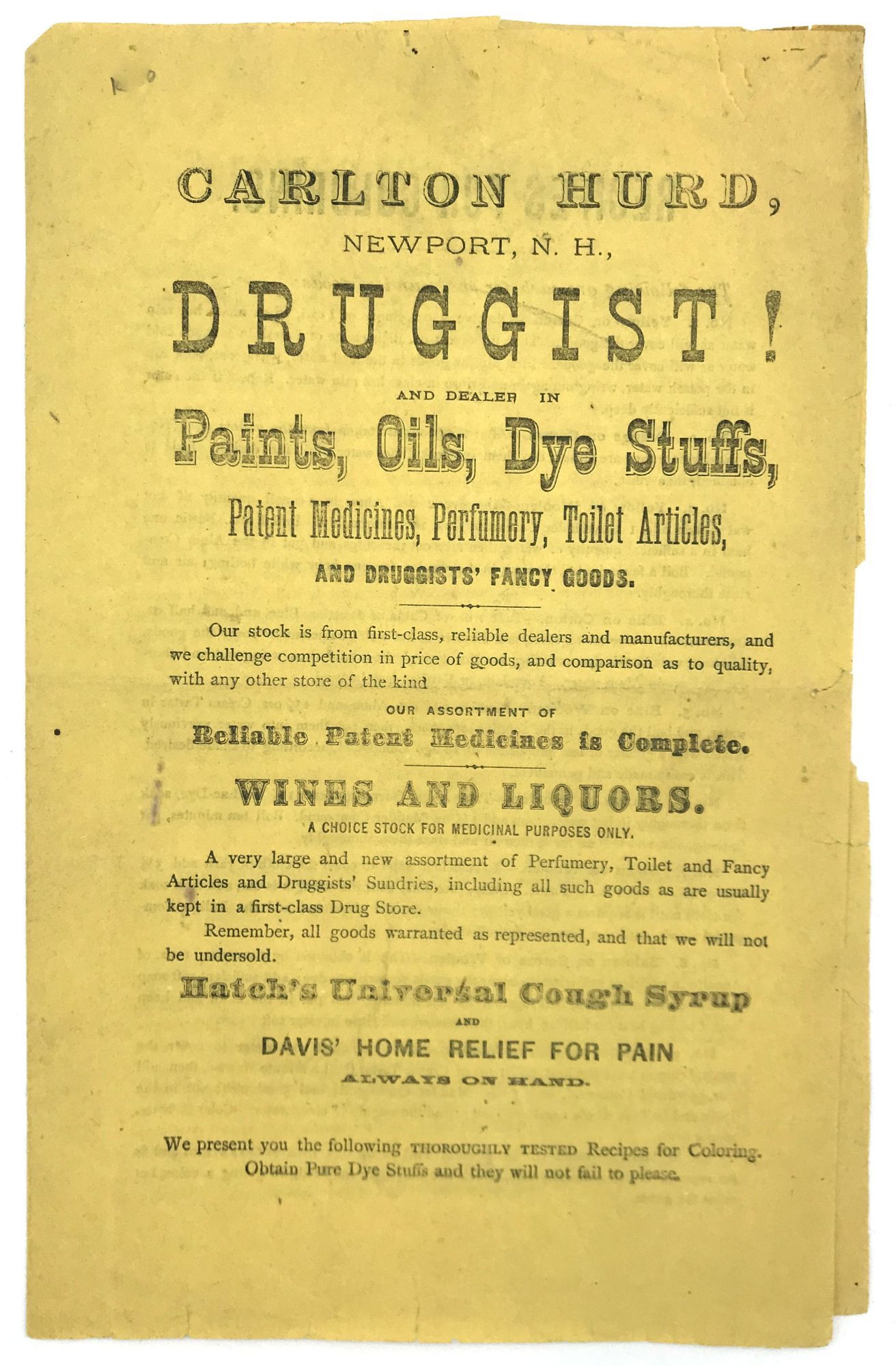 Newport, New Hampshire: Carlton Hurd, 1870. Very good. Some wear to extremities,. Printed bifolium advertising goods sold by Carlton Hurd, druggist and "dealer in Paints, Oils, Dye Stuffs, Patent Medicines, Perfumery, Toilet Articles, and Druggists' Fancy Goods". Also advertises "Wine and Liquors, a choice stock for medicinal purposes only". Of particular interest are the "Recipes for Coloring", which offer instructions for achieving fourteen different colors and shades on cotton or woolen fabrics. Final page advertises two patent medicines: Hatch's Universal Cough Syrup, and Davis' Home Relief for Pain.