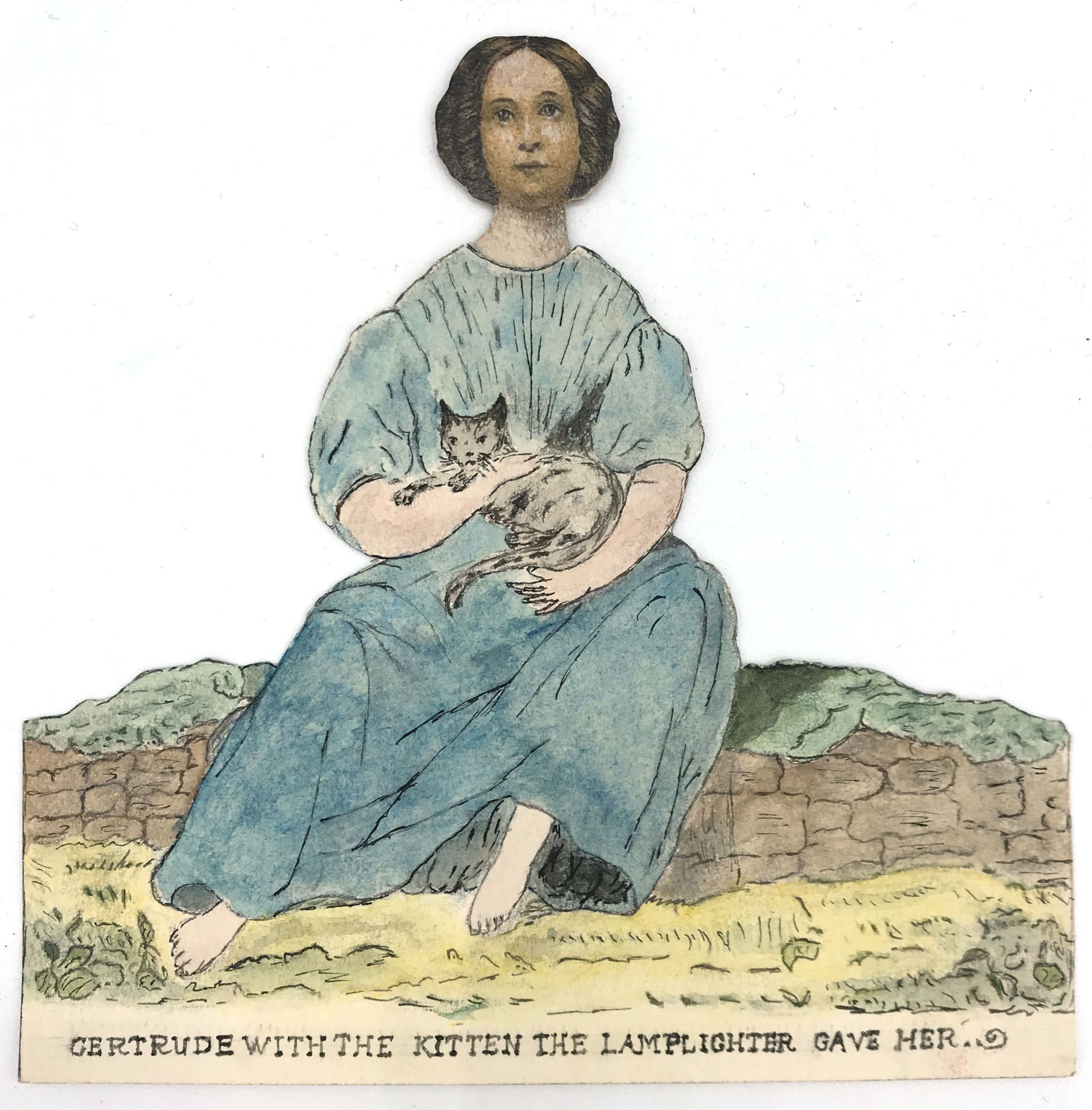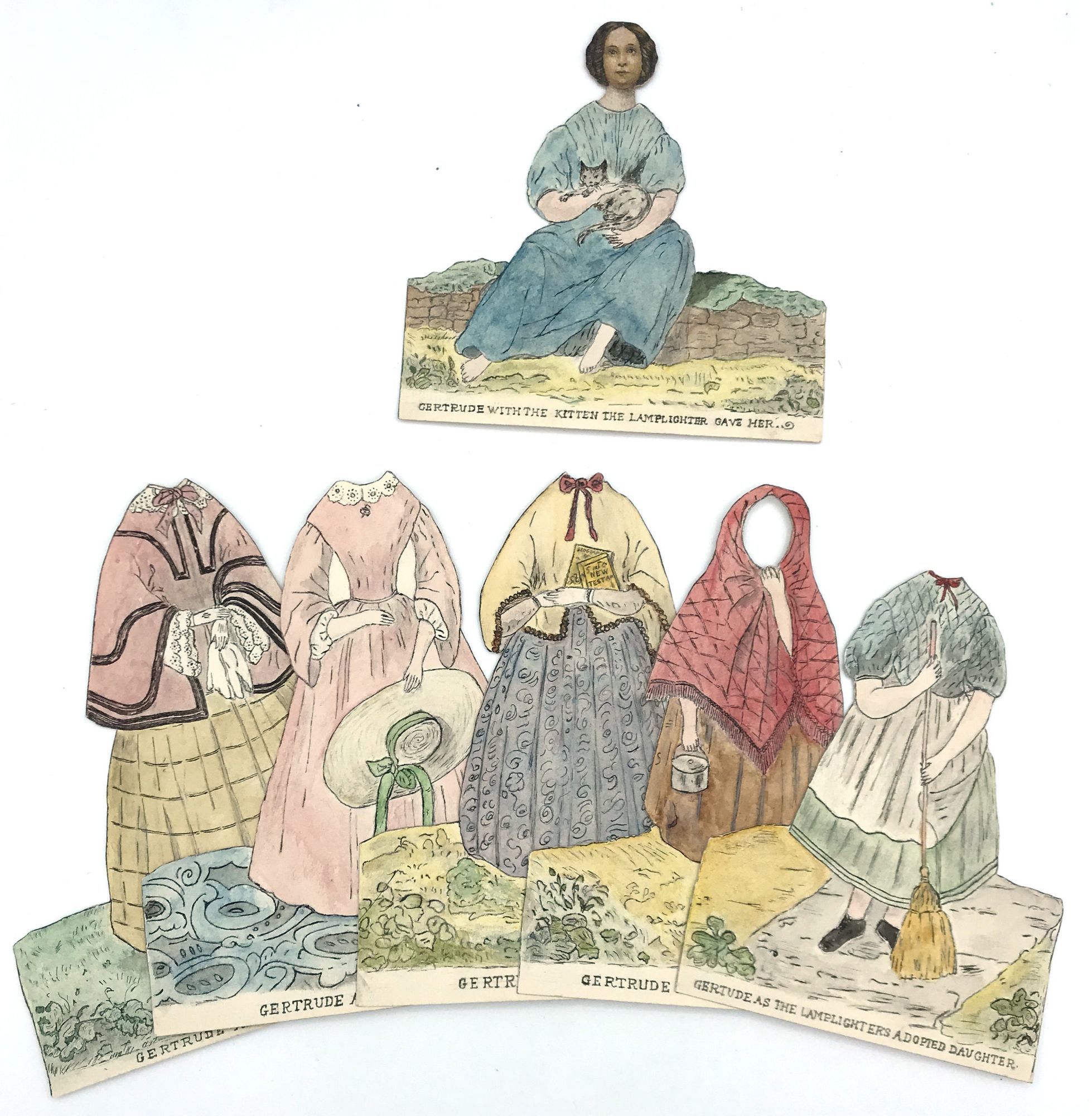United States, 1860. Fine. The head appears to be from one of the S & J Fuller toybooks.. A charming paper doll depicting the character Gertrude Flint from "The Lamplighter" by Maria Susanna Cummins, together with six overlays showing her in different circumstances: as "A School Girl"; "Nan Grant's Dependent"; "Mr. Armory's Daughter"; "Miss Emily's Friend"; "With the Kitten the Lamplighter Gave Her"; and "The Lamplighter's Adopted Daughter". While the doll itself (2" by 1") is chromolithographed, each overlay appears to be handmade using pen and ink wash/watercolor. The largest measures 6.25" by 5.5".