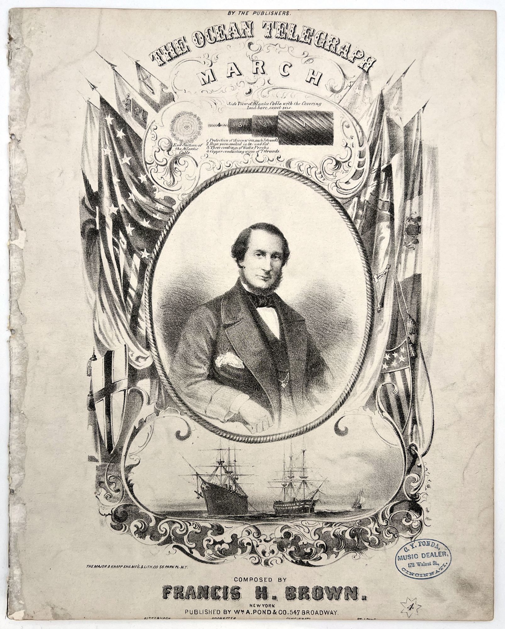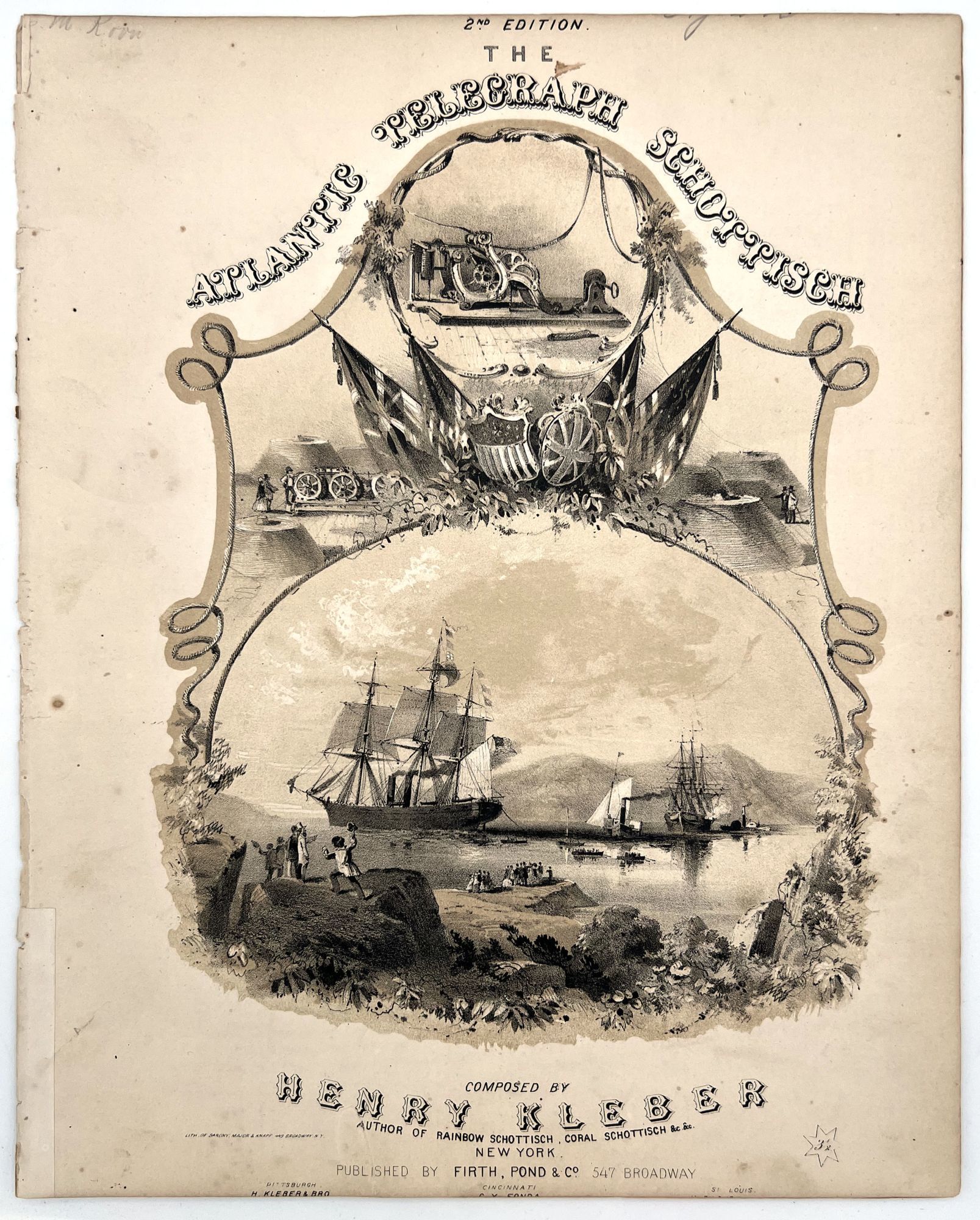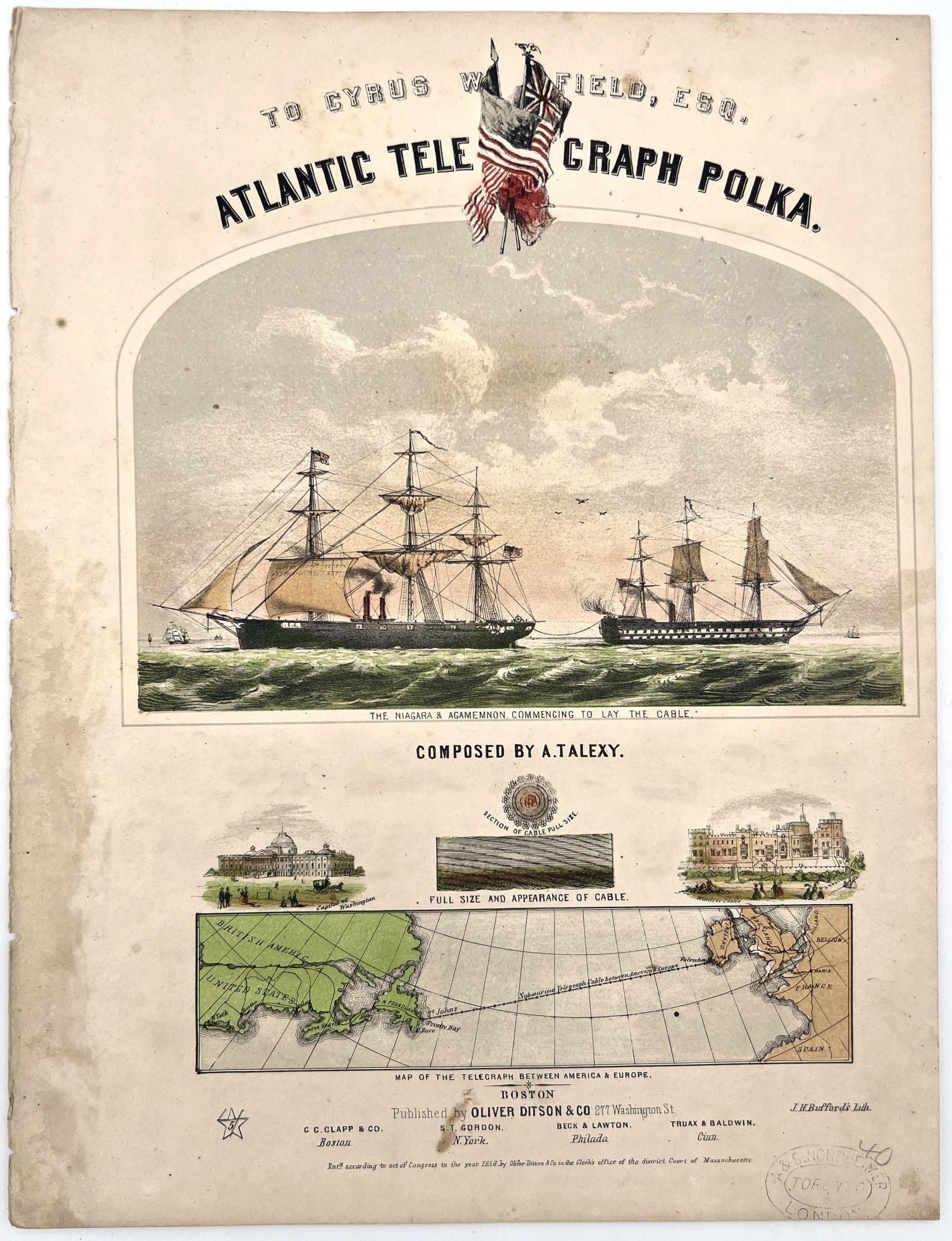 1858. Two with trimmed top margin. Appear to have been disbound.. Three ( 3) different pieces of printed music with illustrated covers depicting the enthusiasm surrounding the laying of the cable. Both romanticized and scientifically accurate depiction of the Niagara & Agamemnon laying the cable, the cable itself; both size and composition and the geographic placement. The titles the Atlantic Telegraph Schottisch (1857), The Ocean Telegraph March (1858) and the Atlantic Telegraph Polka (1858). All include music and no verse. Each measures approx. 13 1/2" x 10 1/4" The first cable was laid in the 1850s from Valentia in western Ireland to the Bay of Bulls, Trinity Bay, Newfoundland. The first communications occurred on 16 August 1858, but the line speed was poor and efforts to improve it caused the cable to fail after three weeks. The Atlantic Telegraph Company led by Cyrus West Field constructed the first transatlantic telegraph cable. The project began in 1854 and was completed in 1858. The cable functioned for only three weeks, but was the first such project to yield practical results. The first official telegram to pass between two continents was a letter of congratulations from Queen Victoria of the United Kingdom to President of the United States James Buchanan on August 16. Signal quality declined rapidly, slowing transmission to an almost unusable speed. The cable was destroyed the following month when Wildman Whitehouse applied excessive voltage to it while trying to achieve faster operation. It has been argued that the cable's faulty manufacture, storage and handling would have caused its premature failure in any case. Its short life undermined public and investor confidence and delayed efforts to restore a connection. The next and more successful attempt was in 1865.