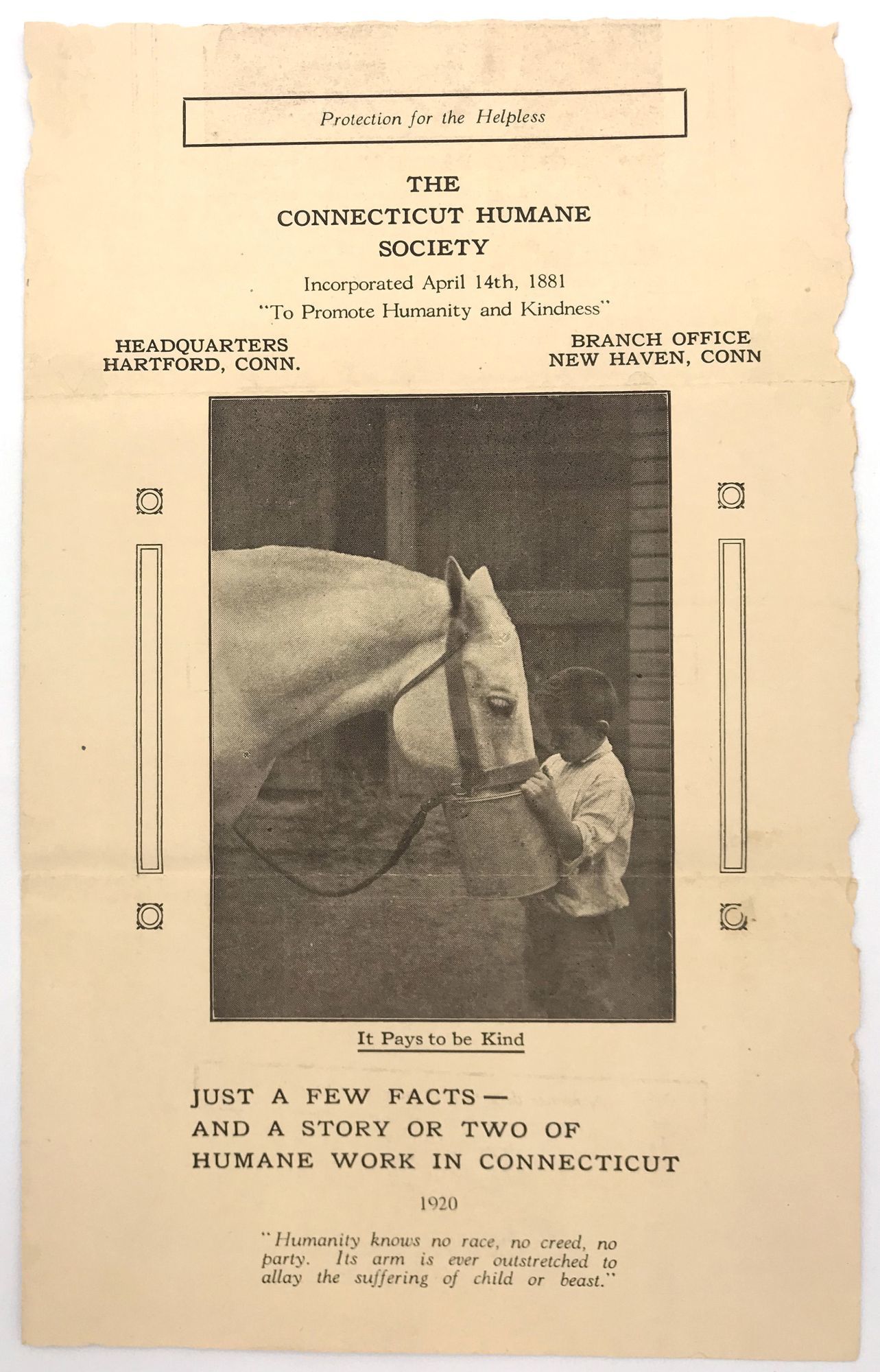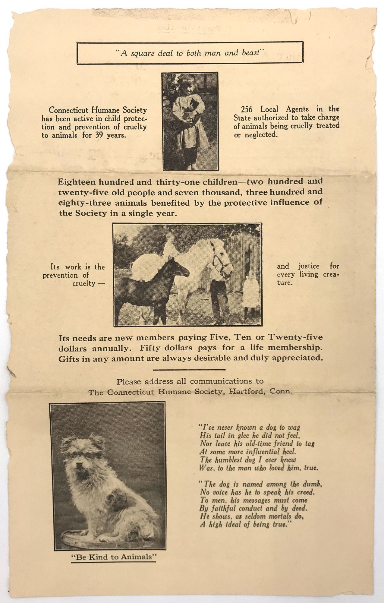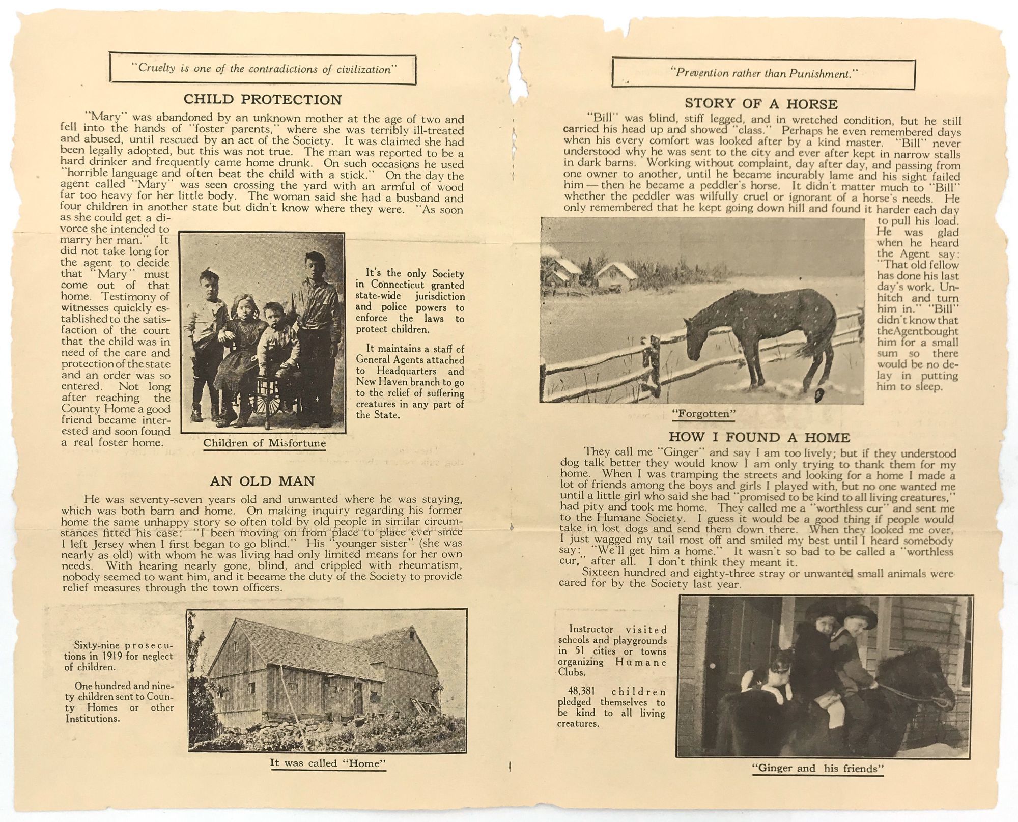 Hartford, Connecticut, 1920. Very good to fine; some light toning, wear to edges. Letter folds.. An early photographically illustrated leaflet for the Connecticut Humane Society, incorporated in 1881 "To Promote Humanity and Kindness" (first leaf recto). Includes a heart-wrenching story about a neglected horse, as well as a heart-warming story about a pony who found a forever family. Contrary to the Society's modern work, which involves solely animal-related welfare activities, this leaflet also includes two sections titled "Child Protection" and "An Old Man", showing that the Society provided relief and humanitarian work for people as well as animals in 1920. "Child Protection" describes the Society's efforts to find abandoned children an ethical foster home, while "An Old Man" describes, in sentimental prose, the plight of an elderly blind man who was able to seek relief through the organization.