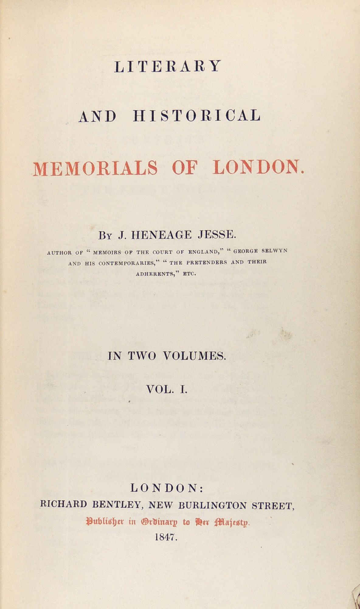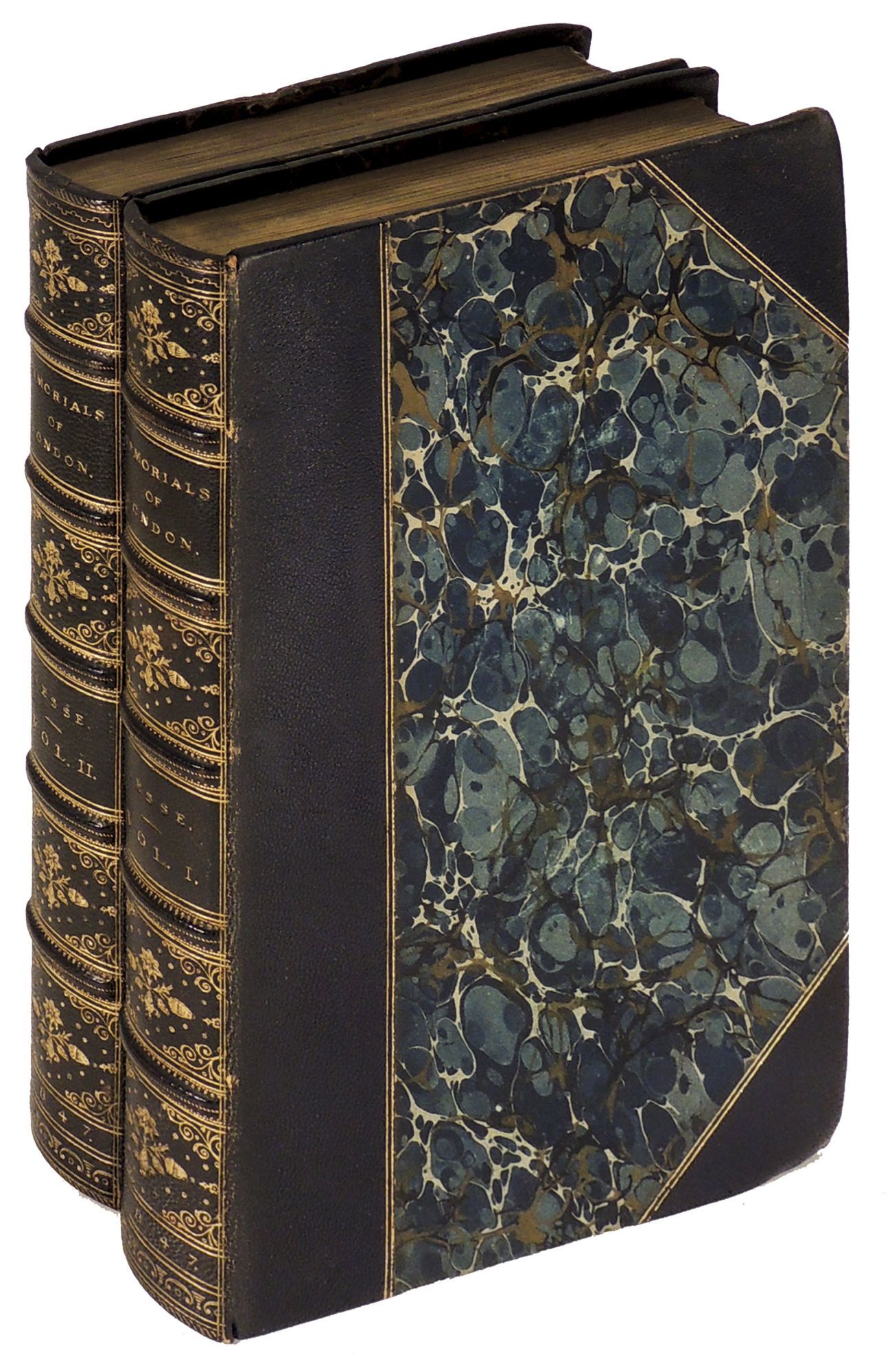 London: Richard Bentley, 1847. Hardcover. Very Good. Hardcover. First edition. An interesting and amiable "antiquarian ramble" about London by John Heneage Jesse (1809-1874), a noted English historian. Chapters are organized by areas of London and landmarks such as the Tower of London and Westminster Abbey. Bound in three quarter blue leather with marbled paper covered boards and gilt titles to spines. Marbled endpapers and top edges gilt. Floral gilt ornaments and raised bands to spines. Wear and a few bumps to edges of boards and corners. Interior pages are clean overall with occasional small spots of soiling and smudge marks to margins. With three foldout maps to first volume and two plates. (The fold-out map of London and Westminster is bound into the rear of the first volume and has a large closed tear.) Two foldout maps and three plates in Volume II. An attractive set. Octavos. Volume I: 448 pages; Volume II: 456 pages. ENGHIST/032322.