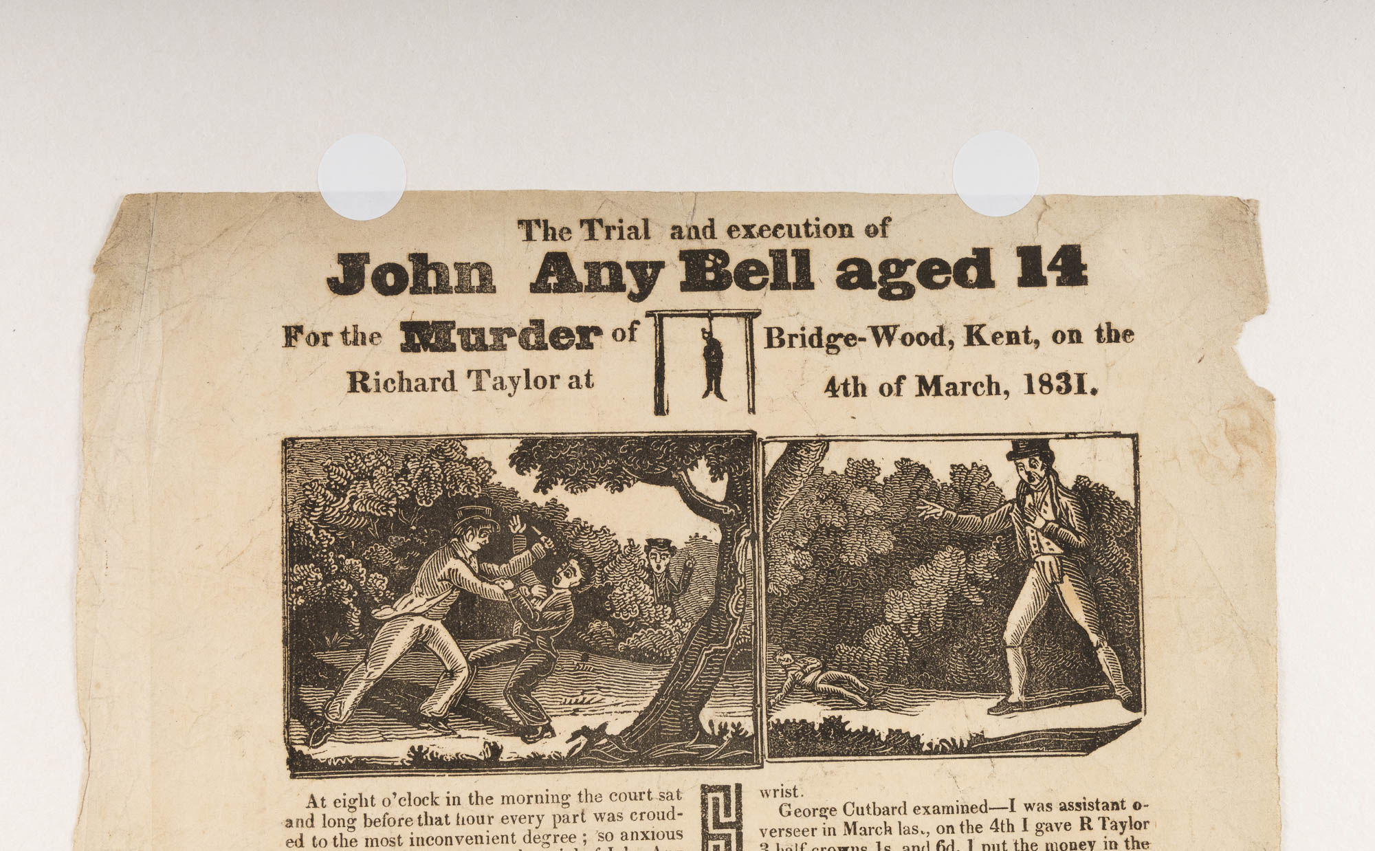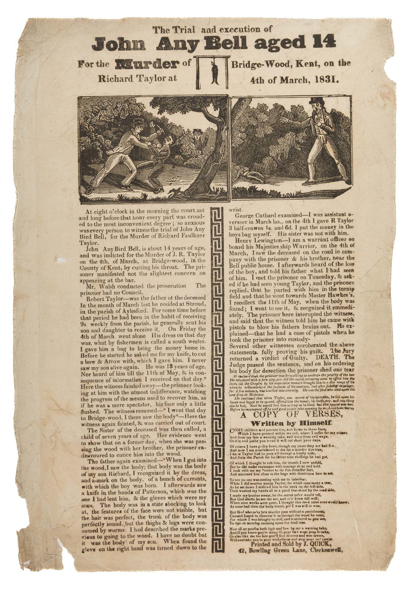 1831. The Execution of a Teenage Murderer [Broadside]. [Execution]. Bell, John Any Bird [d.1831]. The Trial and Execution of John Any Bell Aged 14 For the Murder of Richard Taylor at Bridge-Wood, Kent, On the 4th of March, 1831. [London]: Printed and Sold by J. Quick, [1831]. 14-3/4" x 10" broadside. Text in two columns separated by woodcut border under headline and two woodcut vignettes, verses attributed to Bell at foot of second column. Moderate toning, light soiling and creasing, no loss to legibility, small tears to edges and hole to left margin not affecting text, two small circular stickers to top-edge. $3,000. * The fourteen-year-old Bell confessed to killing Richard Faulker Taylor, thirteen, presumably for the small sum of money Taylor was carrying home. Any Bird Bell's name is sometimes given as James, probably a result of confusion with his younger brother, James Bell. The younger brother, apparently a witness to the crime, testified against him at trial, where he was convicted of murder. Bell was the youngest person executed in England in the nineteenth century. John Vandenburg Quick [1792-1858] was a successful London printer who specialized in broadsides, pamphlets, prints, paper toys and puzzles. This is a rare broadside. OCLC and Library Hub locate 1 copy (Harvard). Not at the British Library.