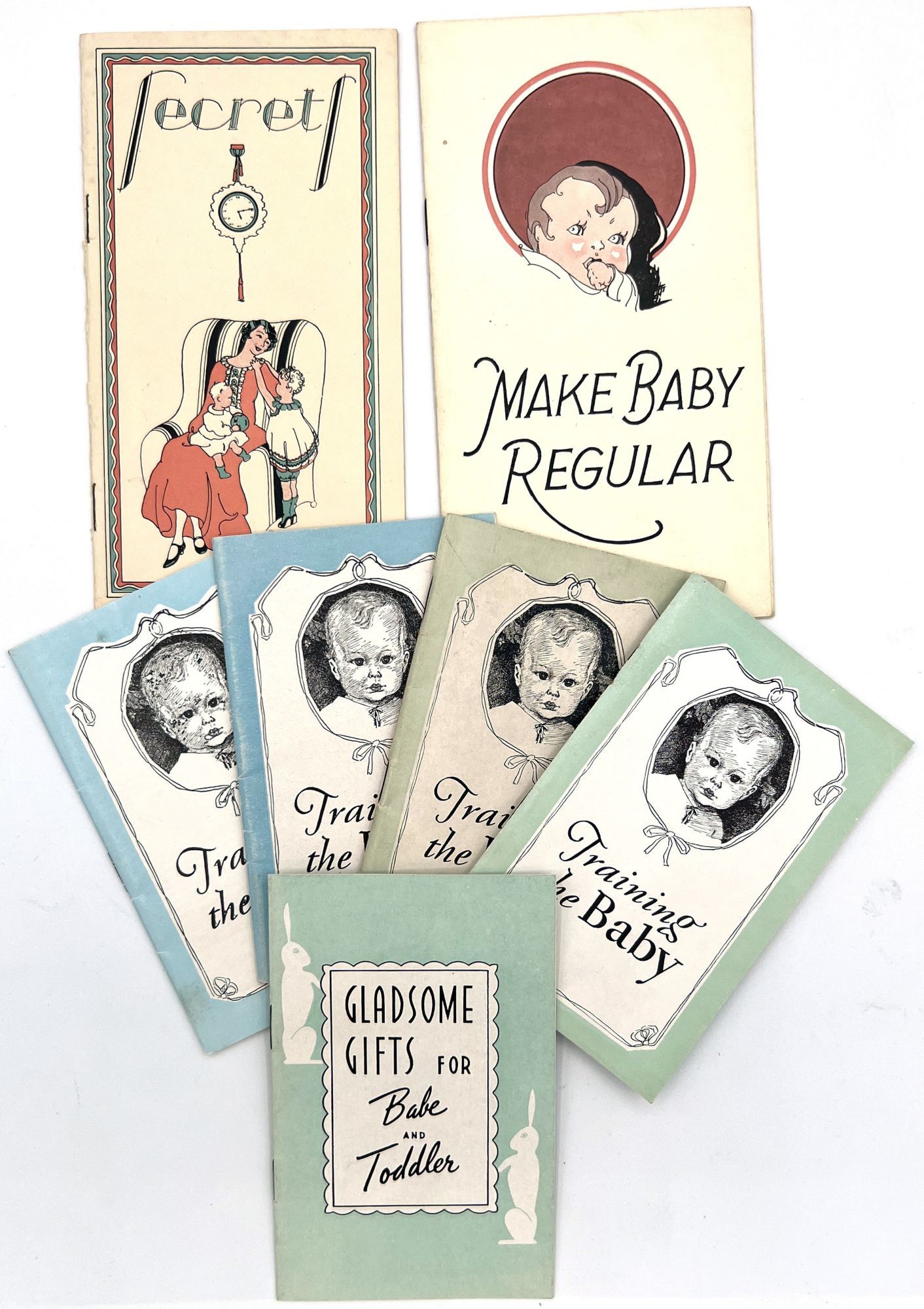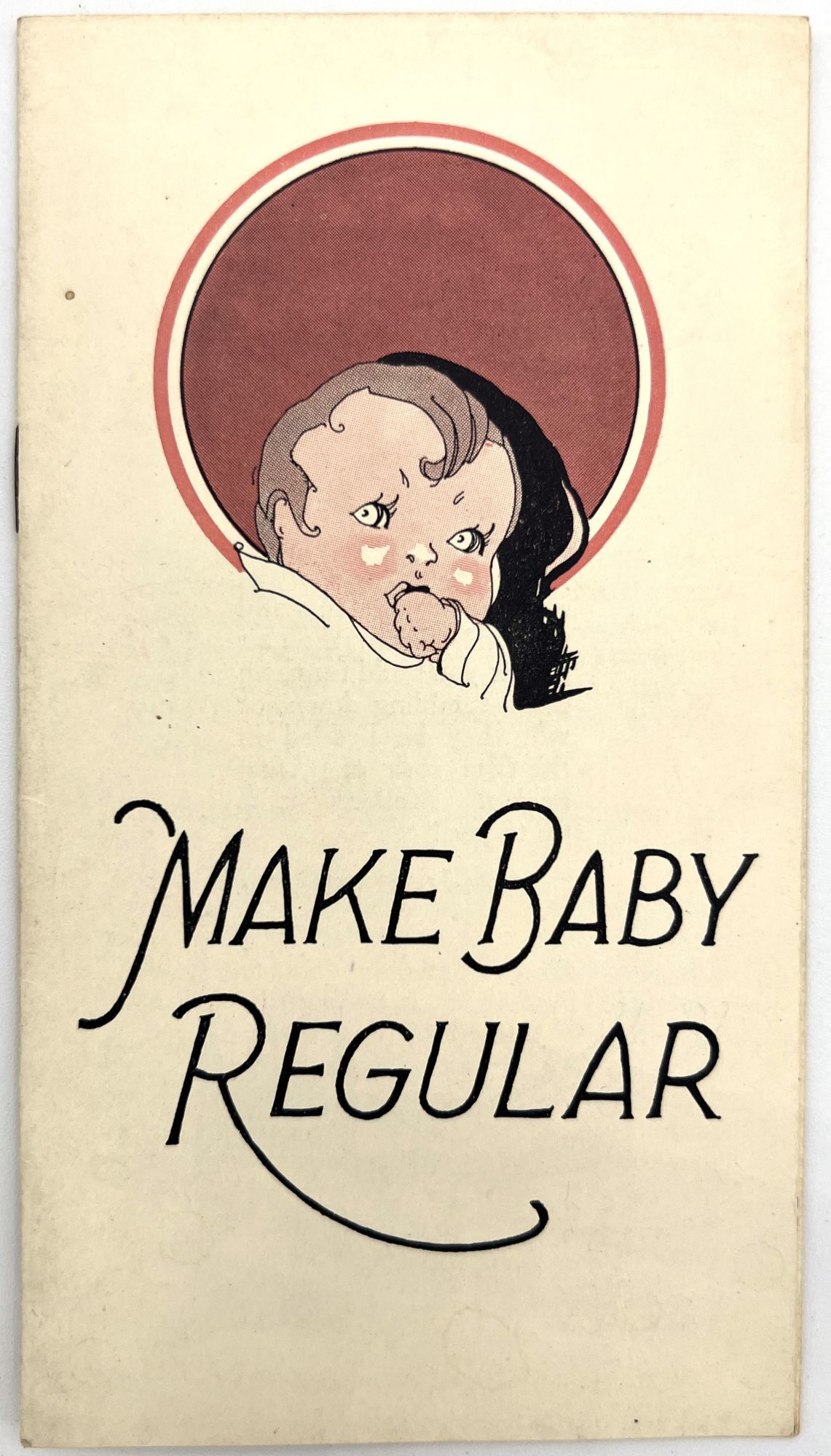 "Make Baby Regular". Fort Wayne: Juvenile Wood Products, Inc., 1925. Illustrated guide to using "Little Toidey" to toilet train babies. 12mo (6.25" by 3.5"), pp. 14, stapled in original illustrated wrappers. Early pen inscription of sales agent to lower wrapper recto ("Mrs. H.M. Burke, Agt").