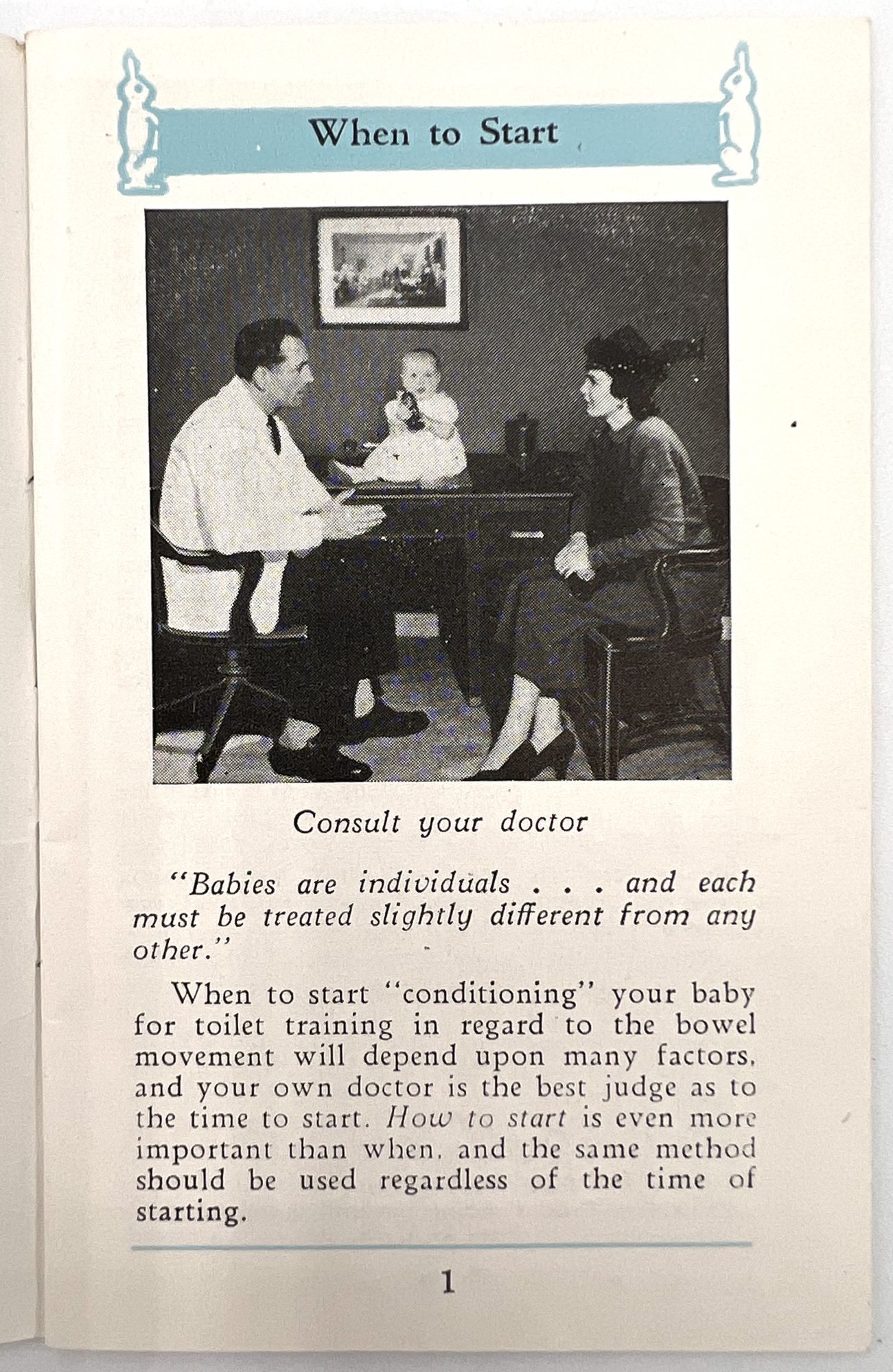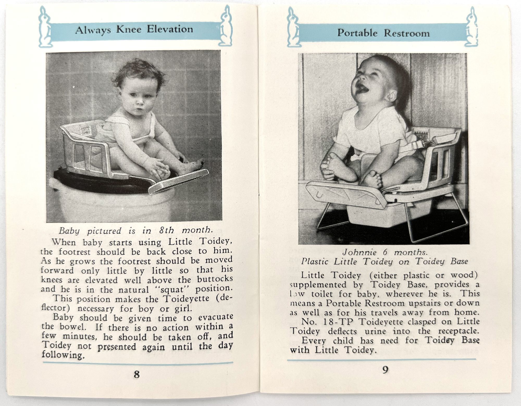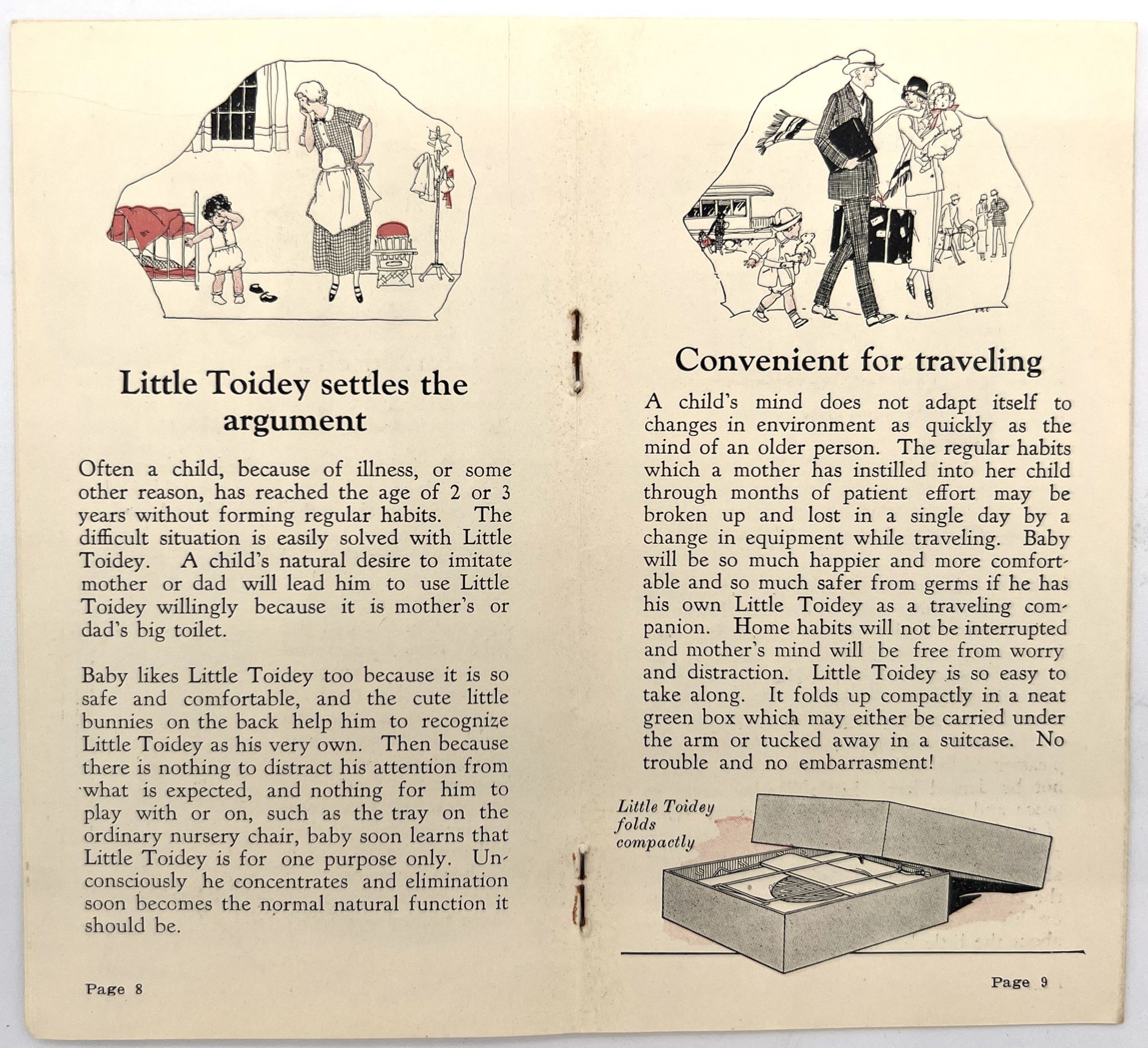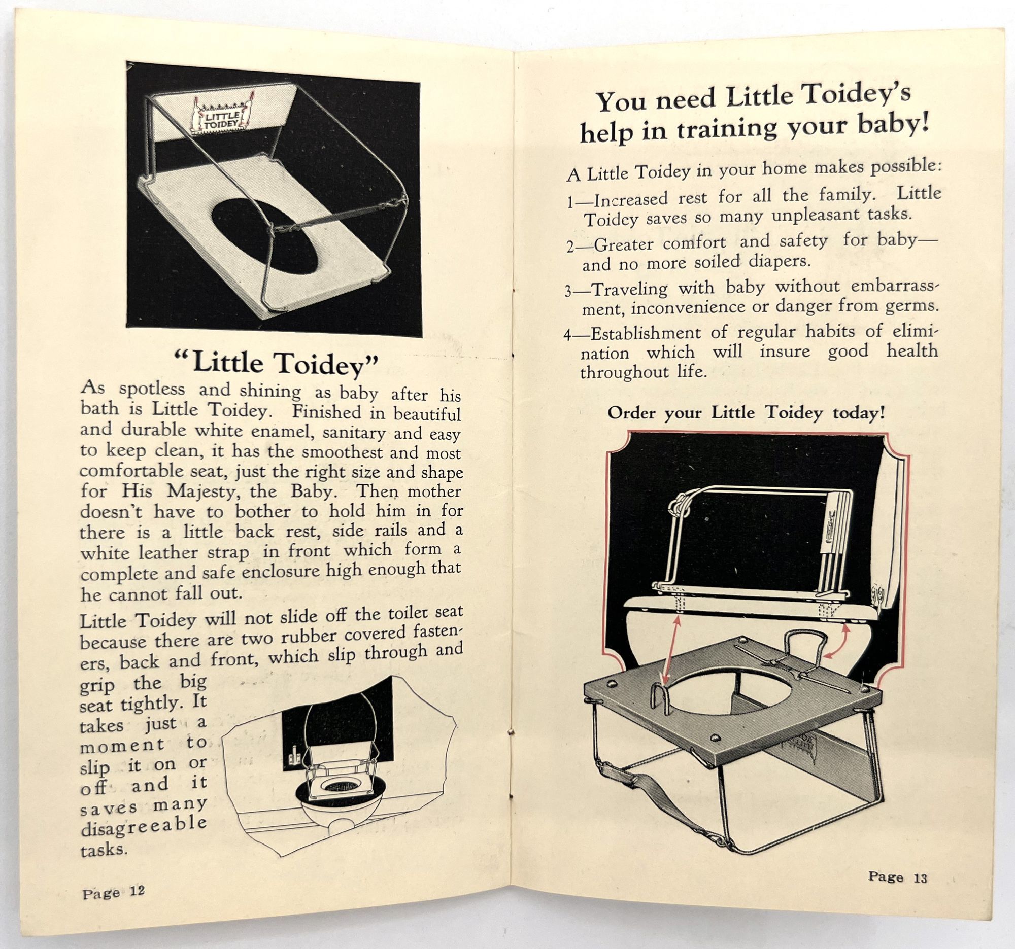 United States: Little Toidey, 1955. A grouping of seven (7) booklets advertising toilet training products, Little Toidey by Juvenile Wood Products, Inc., published between 1924 and 1955, marketed towards wives and mothers. It was designed to sit atop of an adult toilet. Exemplifies the evolution of the product over 30 years. The booklets include: