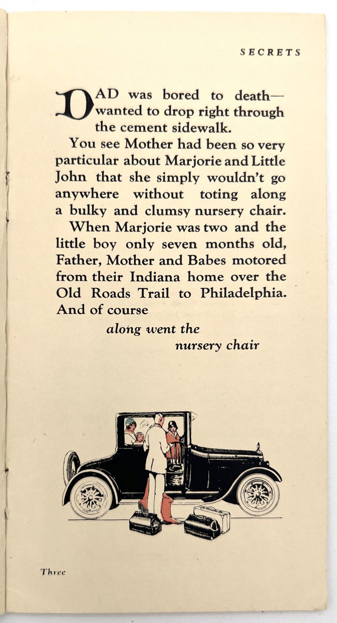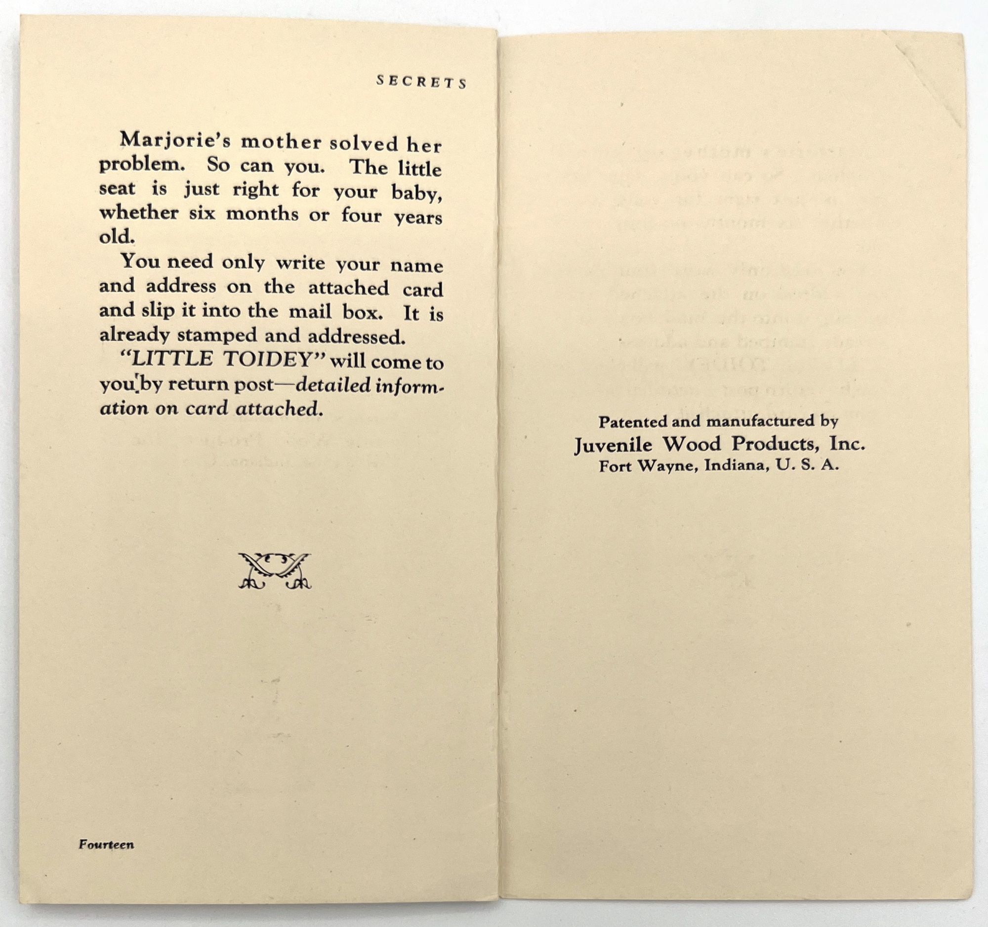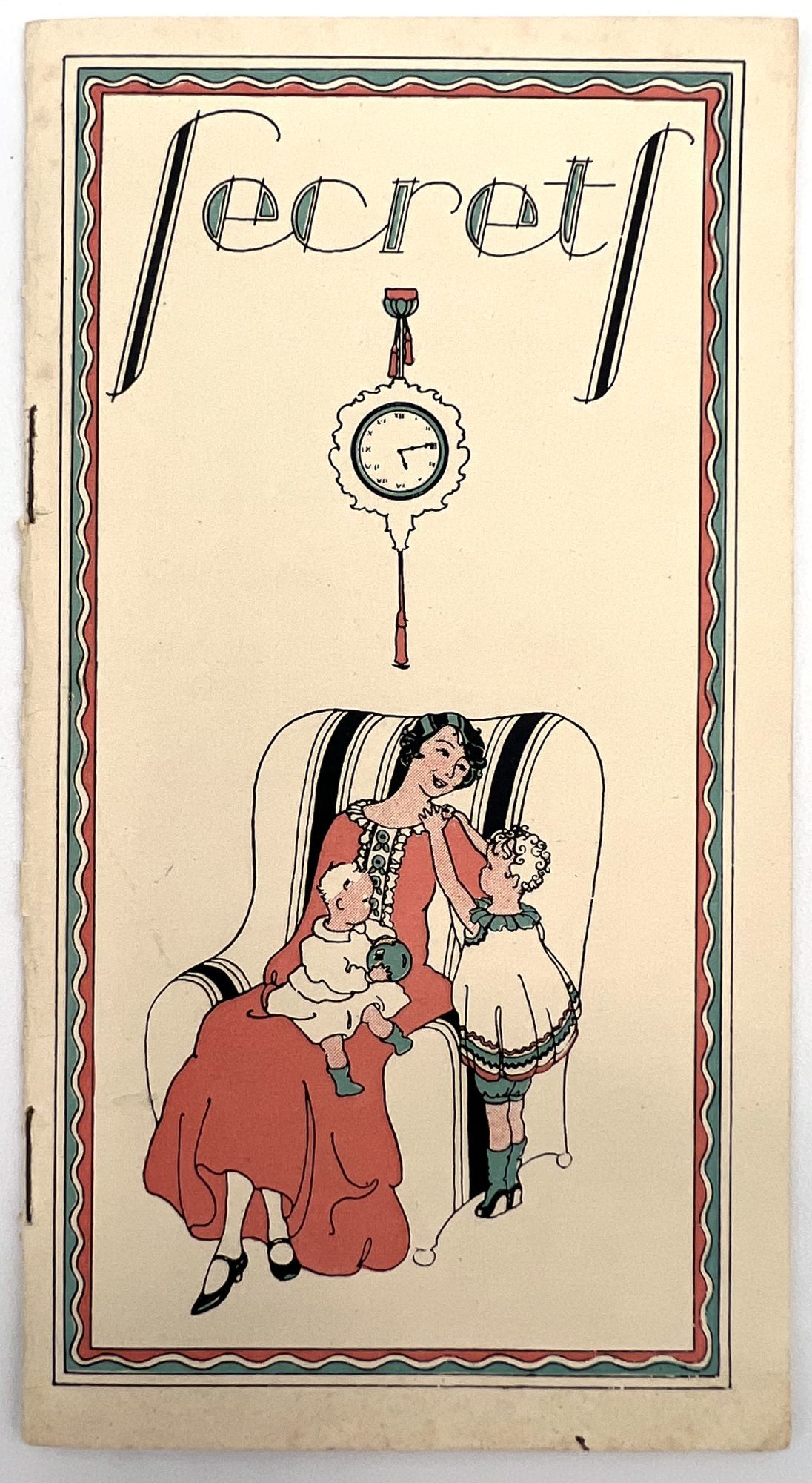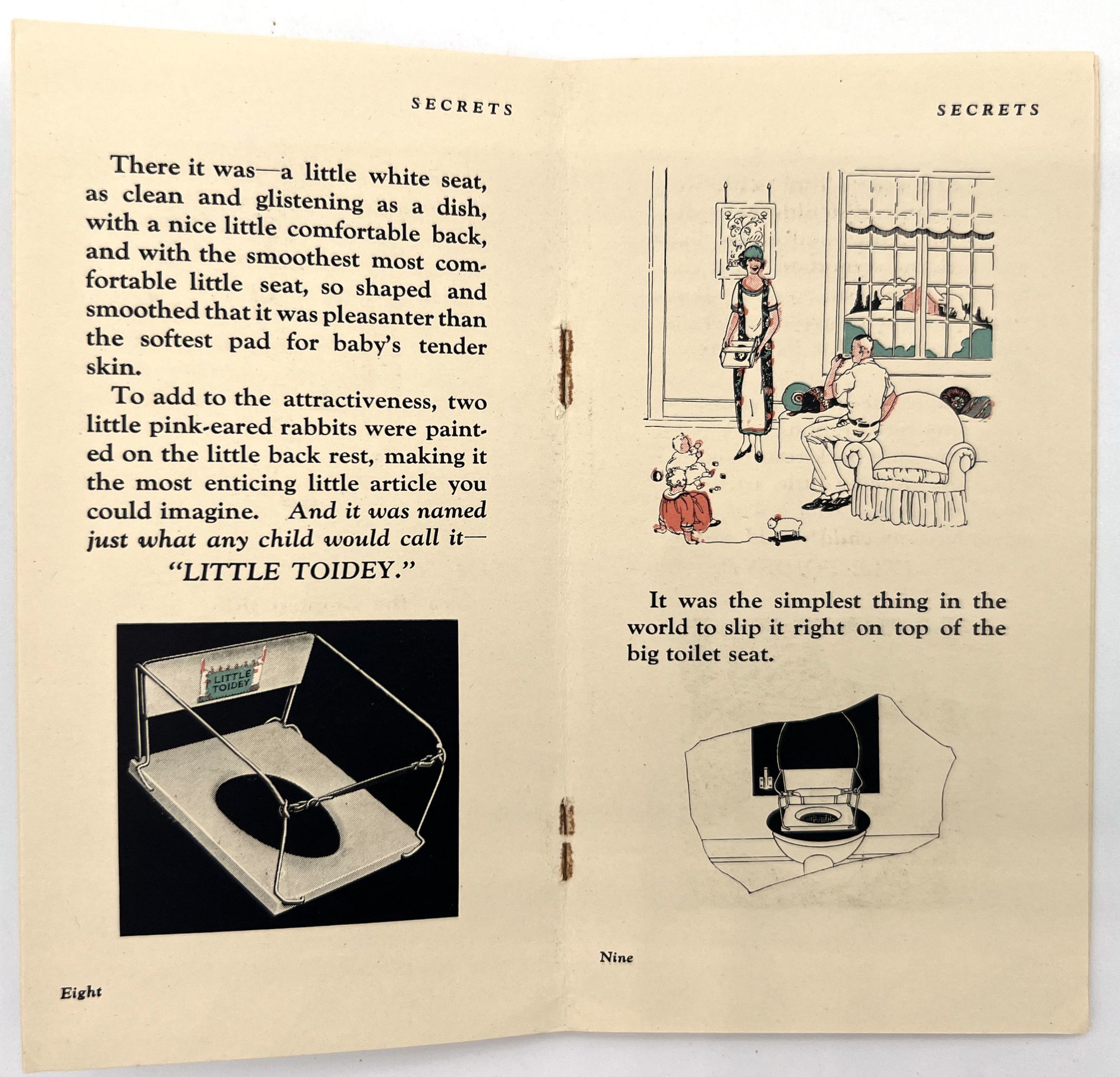 "Secrets". Fort Wayne: Juvenile Wood Products, Inc., 1924. Illustrated story about a family, advertising a toilet training product called "Little Toidey". 12mo (6" by 3.25"), pp. 14, stapled in original illustrated wrappers.