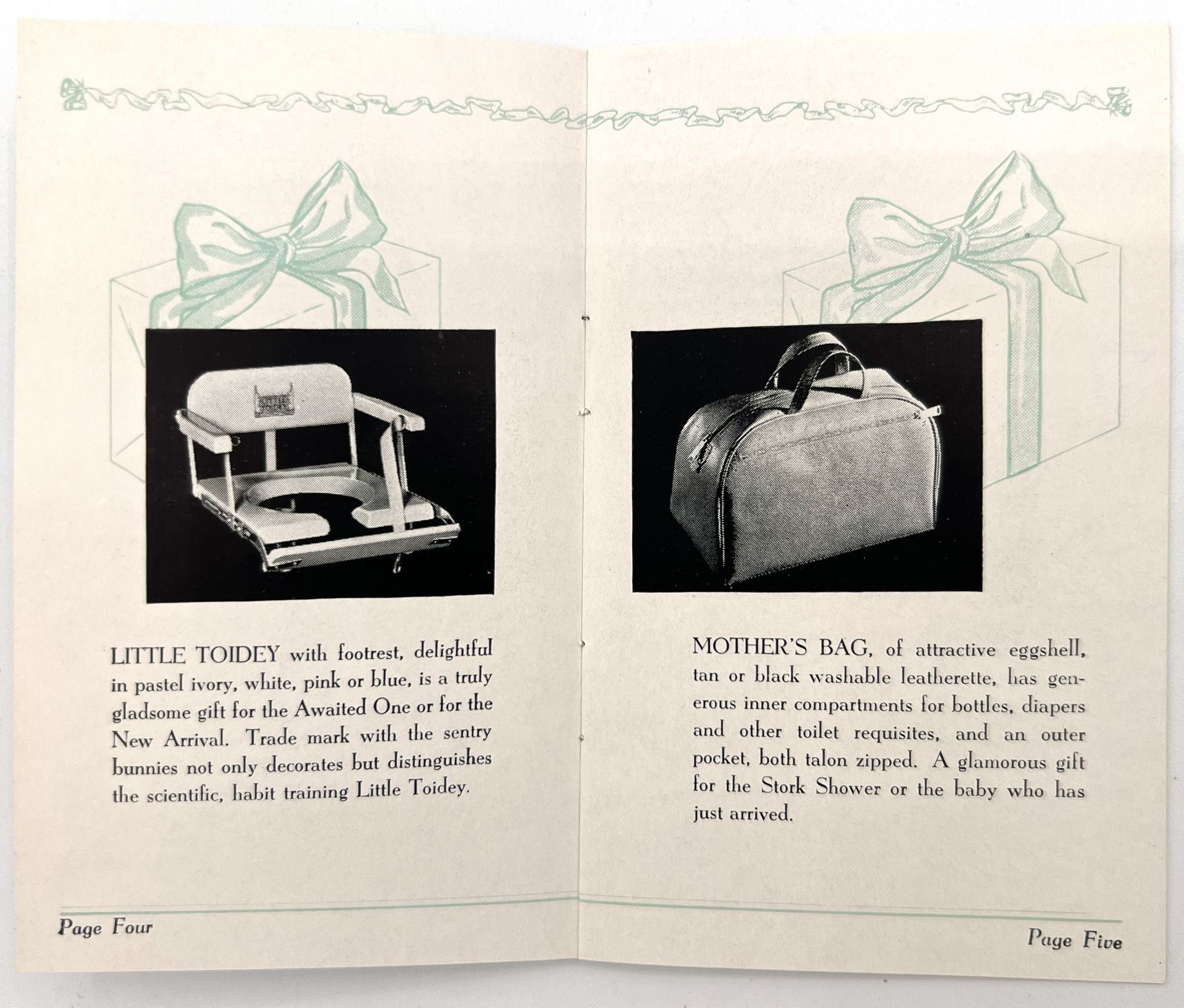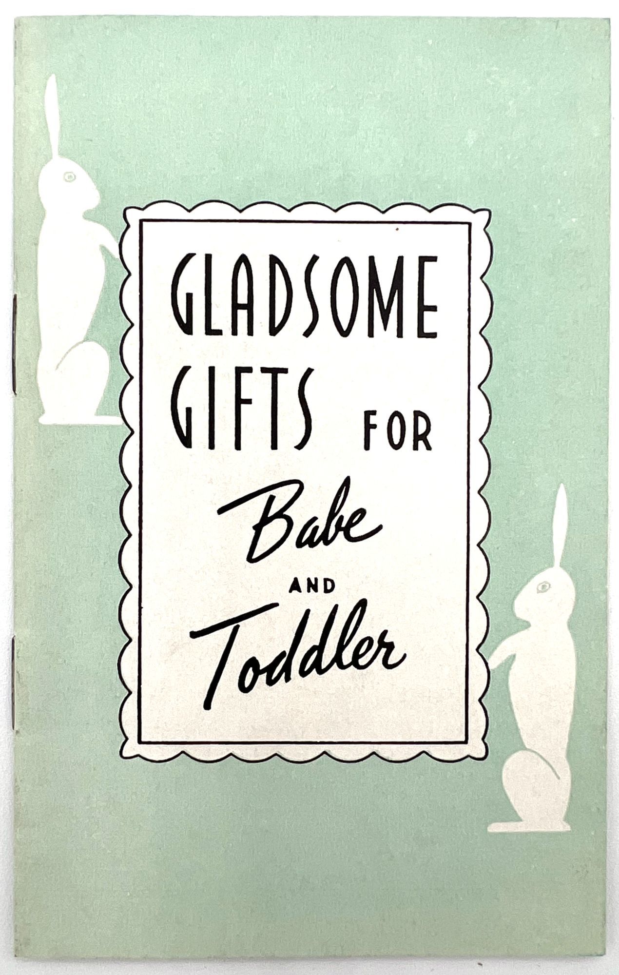 "Gladsome Gifts for Babe and Toddler". Fort Wayne: Juvenile Wood Products, Inc., 1939. Illustrated catalog of toilet training gifts and other baby products. 12mo (4.75" by 3"), pp. 12 (incl. wrps), with in-text illustrations, stapled in original illustrated wrappers.