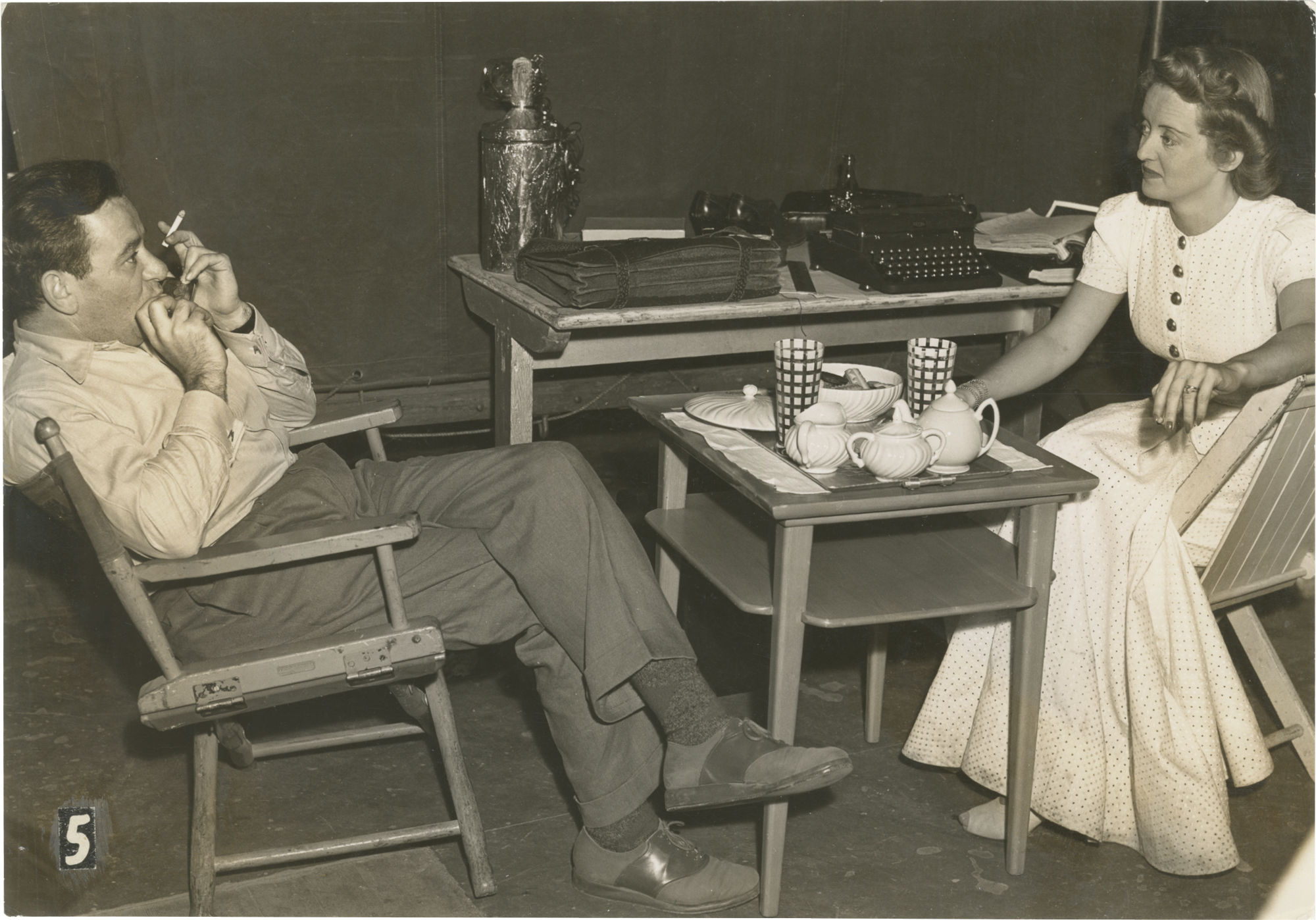 N.p.: N.p., 1940. Vintage borderless reference photograph from the 1940 film, showing director William Wyler and actress Bette Davis enjoying tea on the set.