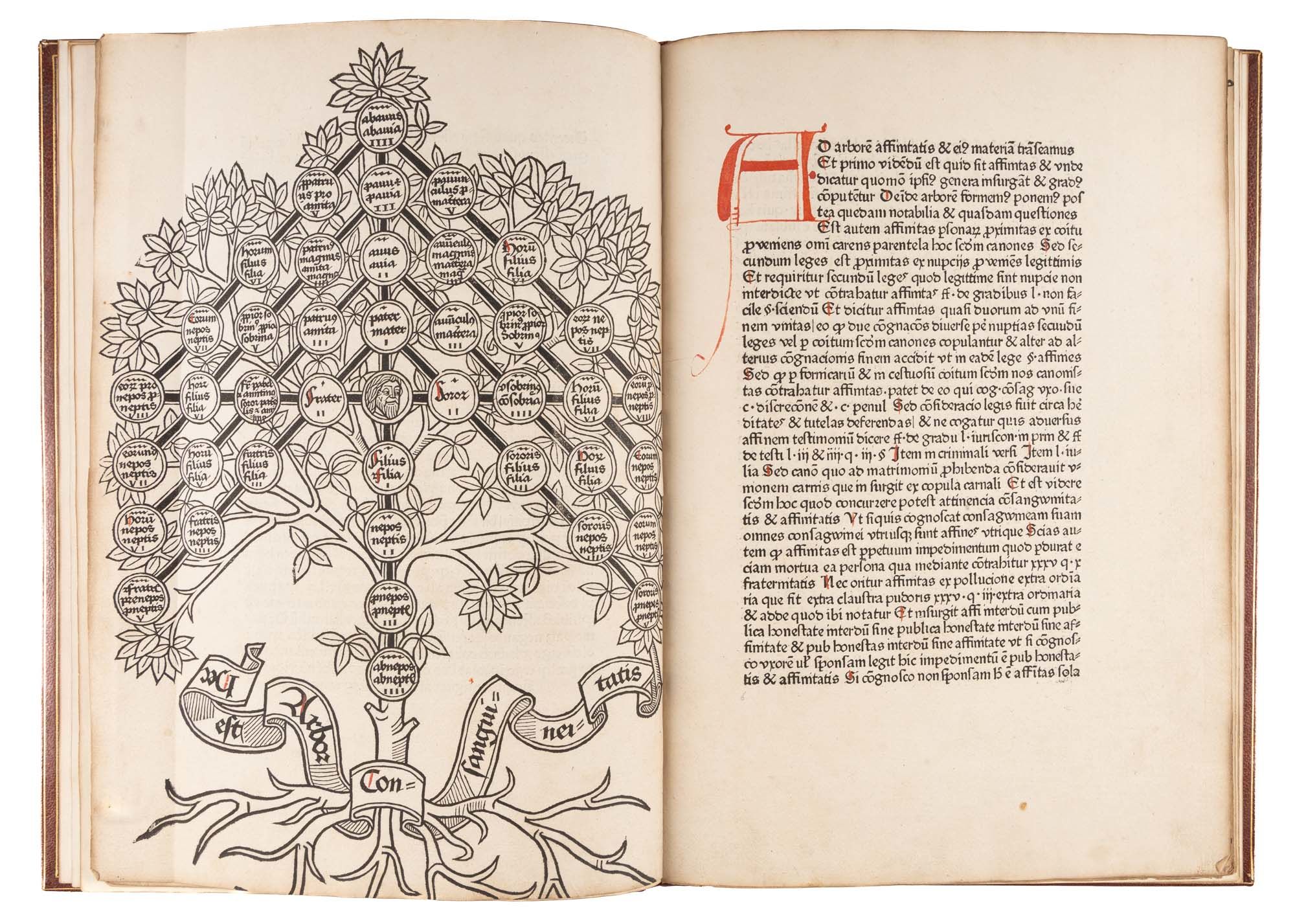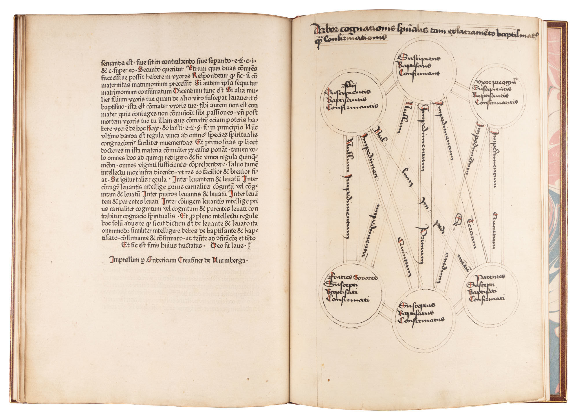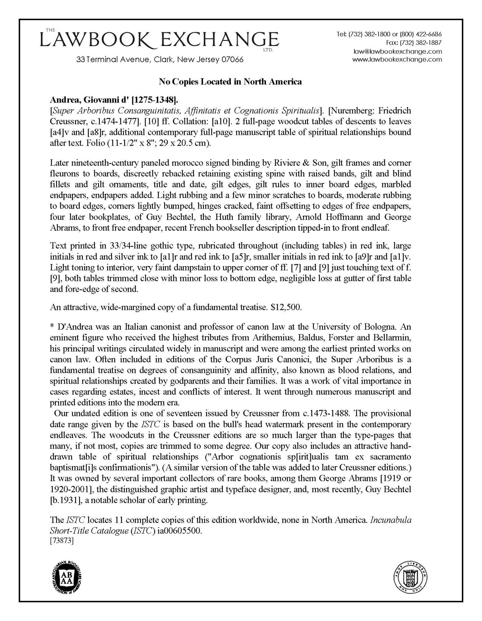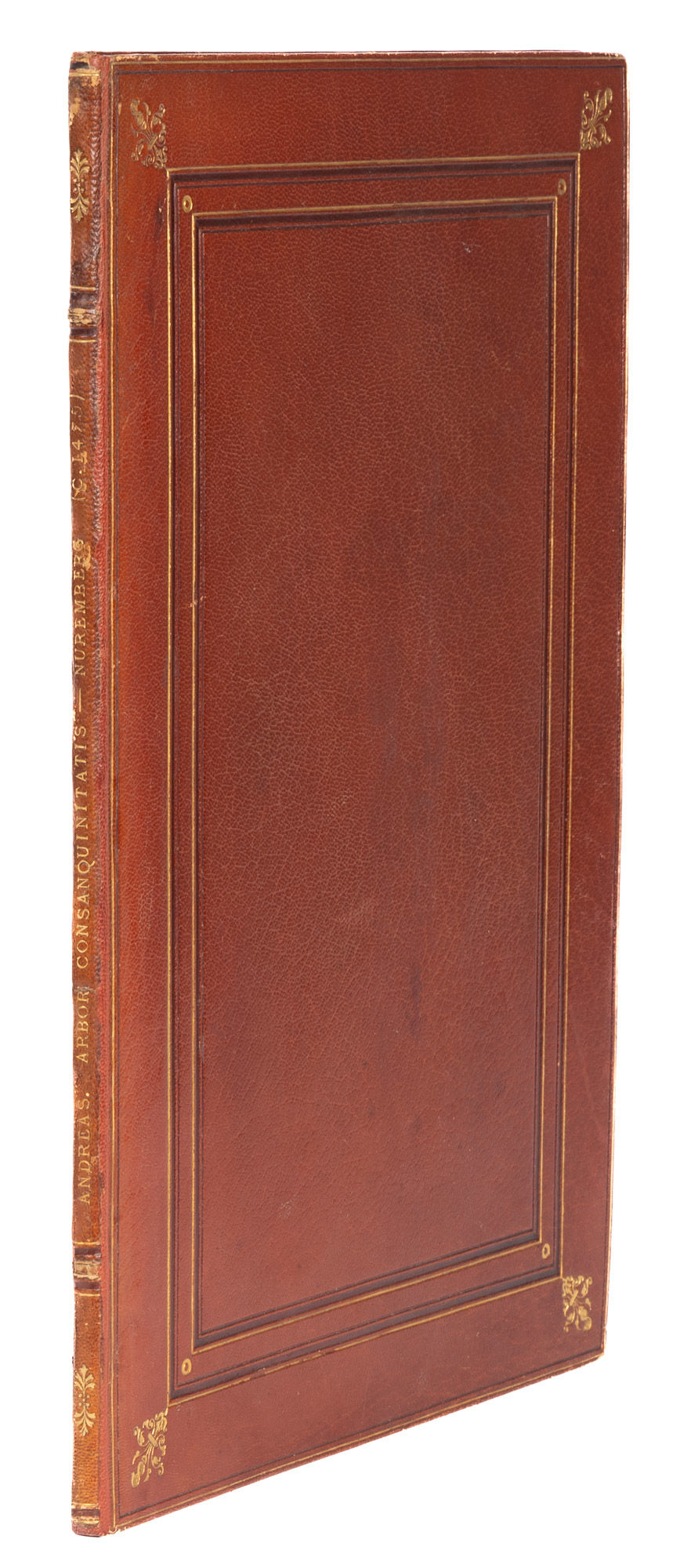 1474. Nuremberg: Friedrich Creussner, c.1474. 10 ff.. Nuremberg: Friedrich Creussner, c.1474. 10 ff. Possibly the First Law Book with Illustrations, No Copies of This Edition Located in North America Andrea, Giovanni d' [1275-1348]. [Super Arboribus Consanguinitatis, Affinitatis et Cognationis Spiritualis]. [Nuremberg: Friedrich Creussner, c.1473-1477]. [10] ff. Collation: [a10]. 2 full-page woodcut tables of descents to leaves [a4]v and [a8]r, additional contemporary full-page manuscript table of spiritual relationships bound after text. Folio (11-1/2" x 8"; 29 x 20.5 cm). Incunabula Short-Title Catalogue (ISTC) ia00605500 (11 complete copies worldwide, none in North America). Later nineteenth-century paneled morocco signed binding by Riviere & Son, gilt frames and corner fleurons to boards, discreetly rebacked retaining existing spine with raised bands, gilt and blind fillets and gilt ornaments, title and date, gilt edges, gilt rules to inner board edges, marbled endpapers, endpapers added. Light rubbing and a few minor scratches to boards, moderate rubbing to board edges, corners lightly bumped, hinges cracked, faint offsetting to edges of free endpapers, four later bookplates, of Guy Bechtel, the Huth family library, Arnold Hoffmann and George Abrams, to front free endpaper, recent French bookseller description tipped-in to front endleaf. Text printed in 33/34-line gothic type, rubricated throughout (including tables) in red ink, large initials in red and silver ink to [a1]r and red ink to [a5]r, smaller initials in red ink to [a9]r and [a1]v. Light toning to interior, very faint dampstain to upper corner of ff. [7] and [9] just touching text of f. [9], both tables trimmed close with minor loss to bottom edge, negligible loss at gutter of first table and fore-edge of second. An attractive, wide-margined copy of a fundamental treatise. $8,000. **THIS DESCRIPTION IS TRUNCATED DUE TO CHARACTER LIMITS. PLEASE CONTACT US FOR A COMPLETE VERSION.** * D'Andrea was an Italian canonist and professor of canon law at the University of Bologna. An eminent figure who received the highest tributes from Arithemius, Baldus, Forster and Bellarmin, his principal writings circulated widely in manuscript and were among the earliest printed works on canon law. Often included in editions of the Corpus Juris Canonici, the Super Arboribus is a fundamental treatise on degrees of consanguinity and affinity, also known.