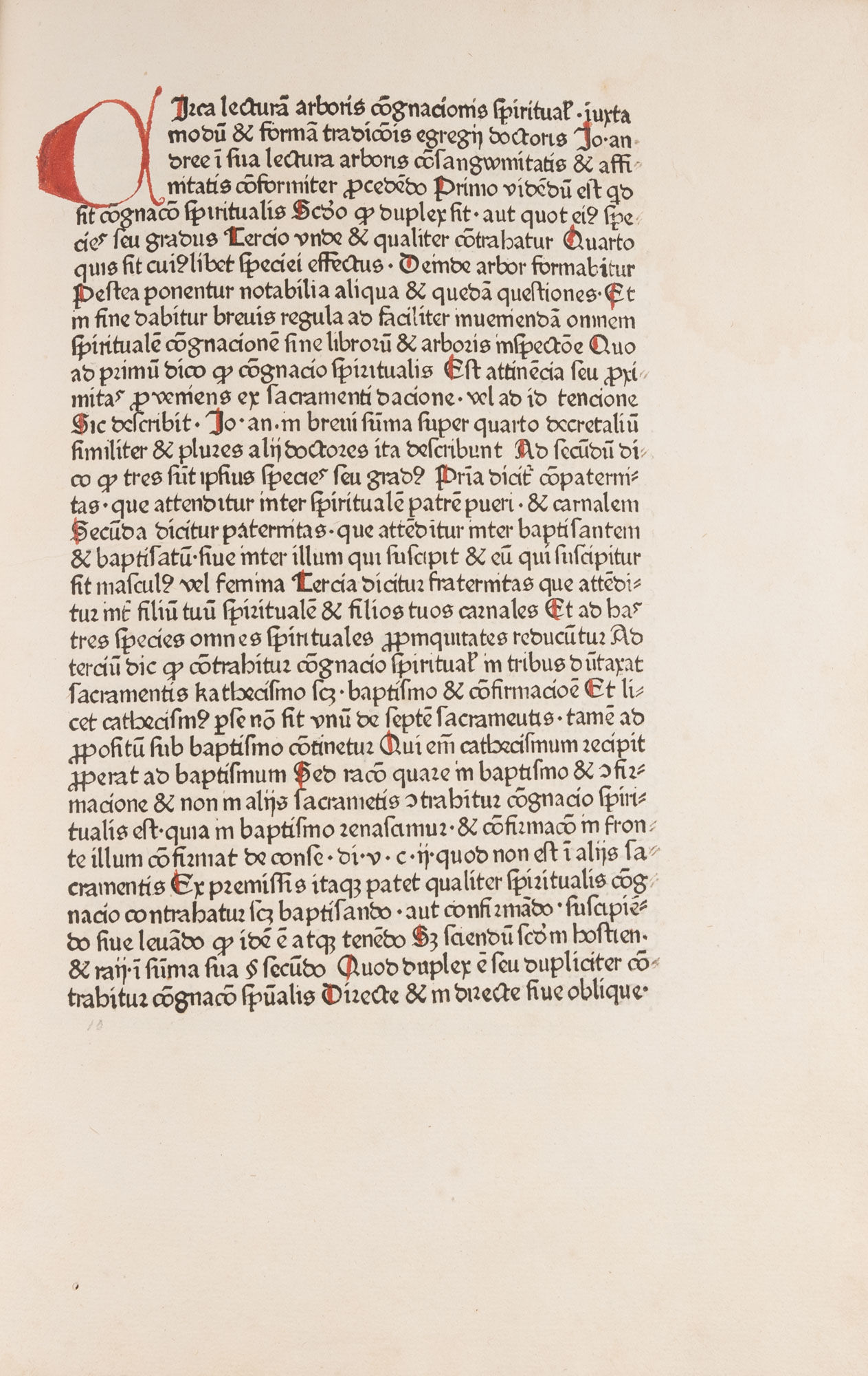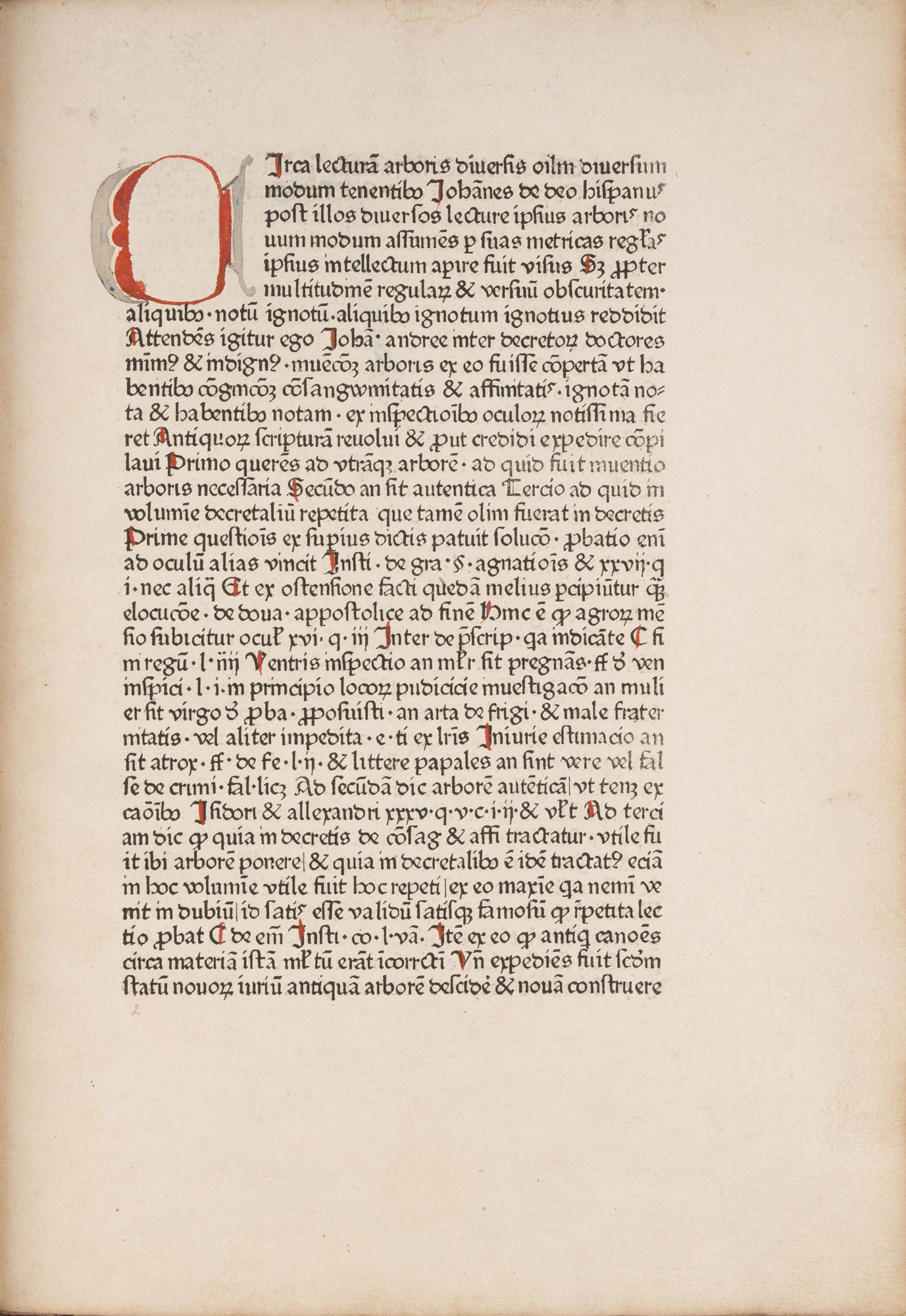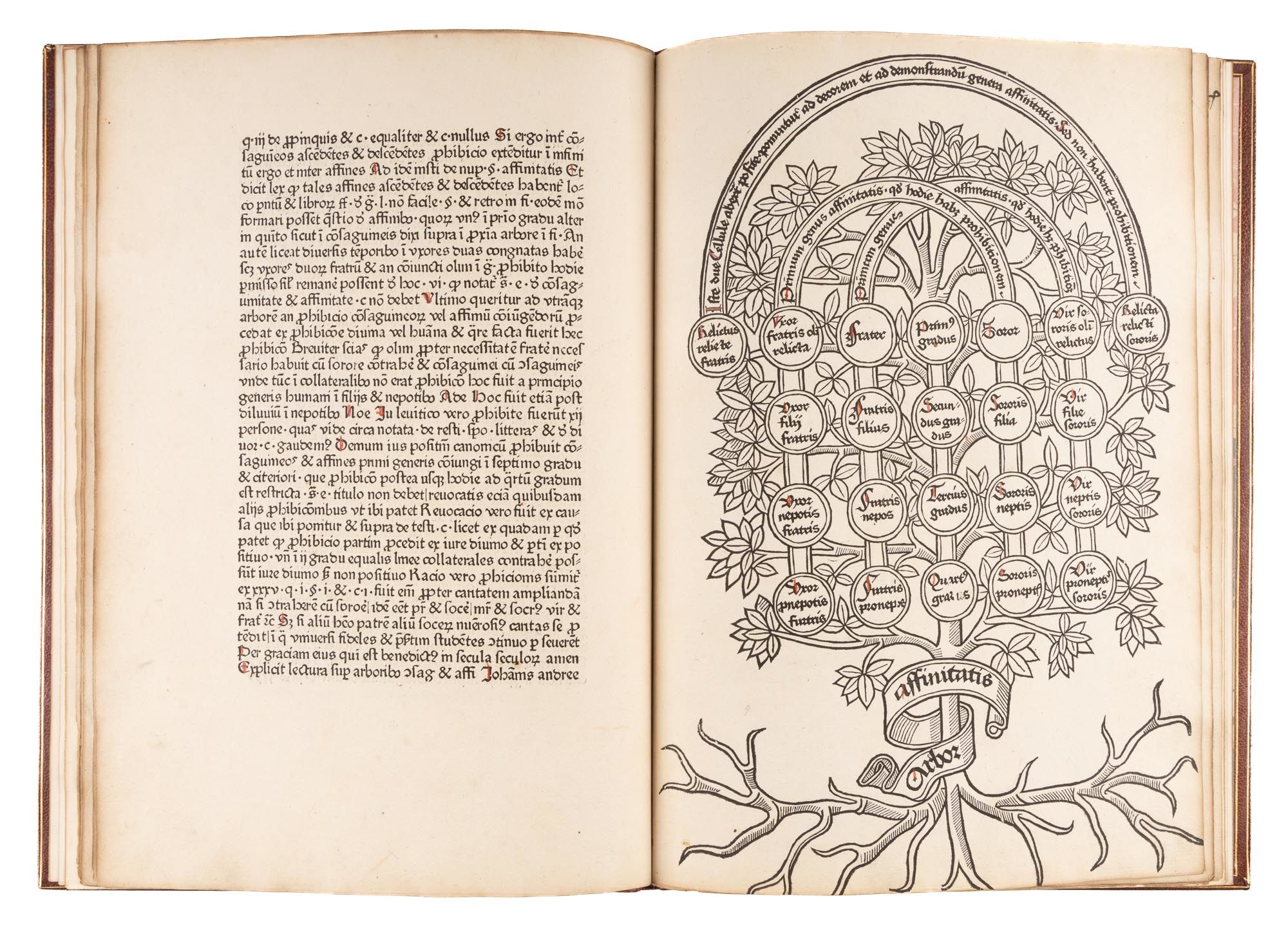 1474. Nuremberg: Friedrich Creussner, c.1474. 10 ff.. Nuremberg: Friedrich Creussner, c.1474. 10 ff. Possibly the First Law Book with Illustrations, No Copies of This Edition Located in North America Andrea, Giovanni d' [1275-1348]. [Super Arboribus Consanguinitatis, Affinitatis et Cognationis Spiritualis]. [Nuremberg: Friedrich Creussner, c.1473-1477]. [10] ff. Collation: [a10]. 2 full-page woodcut tables of descents to leaves [a4]v and [a8]r, additional contemporary full-page manuscript table of spiritual relationships bound after text. Folio (11-1/2" x 8"; 29 x 20.5 cm). Incunabula Short-Title Catalogue (ISTC) ia00605500 (11 complete copies worldwide, none in North America). Later nineteenth-century paneled morocco signed binding by Riviere & Son, gilt frames and corner fleurons to boards, discreetly rebacked retaining existing spine with raised bands, gilt and blind fillets and gilt ornaments, title and date, gilt edges, gilt rules to inner board edges, marbled endpapers, endpapers added. Light rubbing and a few minor scratches to boards, moderate rubbing to board edges, corners lightly bumped, hinges cracked, faint offsetting to edges of free endpapers, four later bookplates, of Guy Bechtel, the Huth family library, Arnold Hoffmann and George Abrams, to front free endpaper, recent French bookseller description tipped-in to front endleaf. Text printed in 33/34-line gothic type, rubricated throughout (including tables) in red ink, large initials in red and silver ink to [a1]r and red ink to [a5]r, smaller initials in red ink to [a9]r and [a1]v. Light toning to interior, very faint dampstain to upper corner of ff. [7] and [9] just touching text of f. [9], both tables trimmed close with minor loss to bottom edge, negligible loss at gutter of first table and fore-edge of second. An attractive, wide-margined copy of a fundamental treatise. $8,000. **THIS DESCRIPTION IS TRUNCATED DUE TO CHARACTER LIMITS. PLEASE CONTACT US FOR A COMPLETE VERSION.** * D'Andrea was an Italian canonist and professor of canon law at the University of Bologna. An eminent figure who received the highest tributes from Arithemius, Baldus, Forster and Bellarmin, his principal writings circulated widely in manuscript and were among the earliest printed works on canon law. Often included in editions of the Corpus Juris Canonici, the Super Arboribus is a fundamental treatise on degrees of consanguinity and affinity, also known.