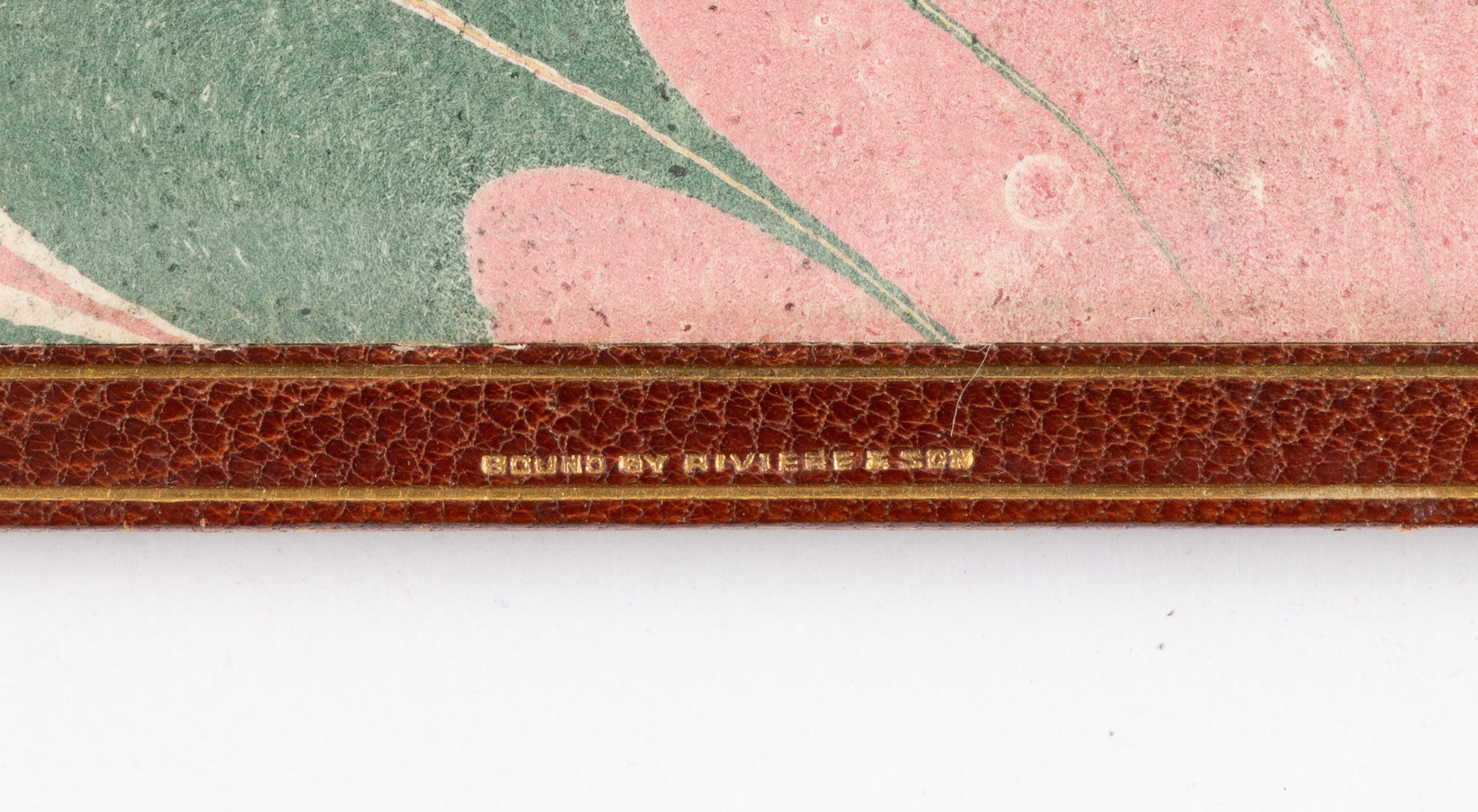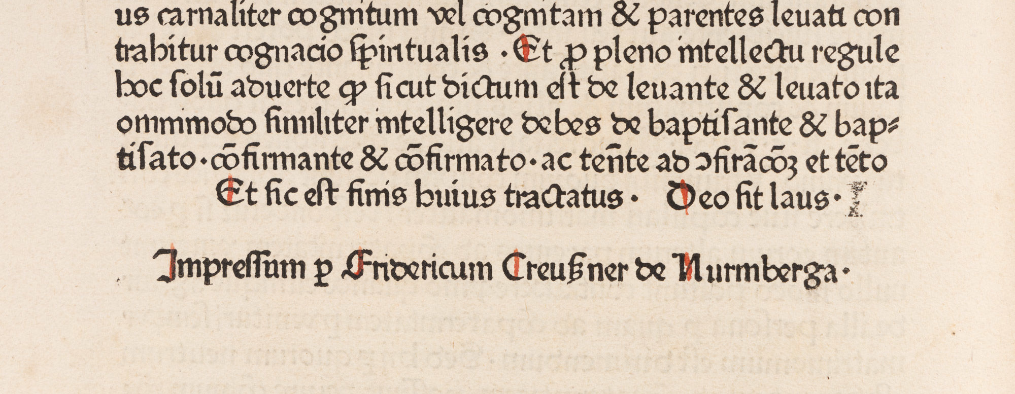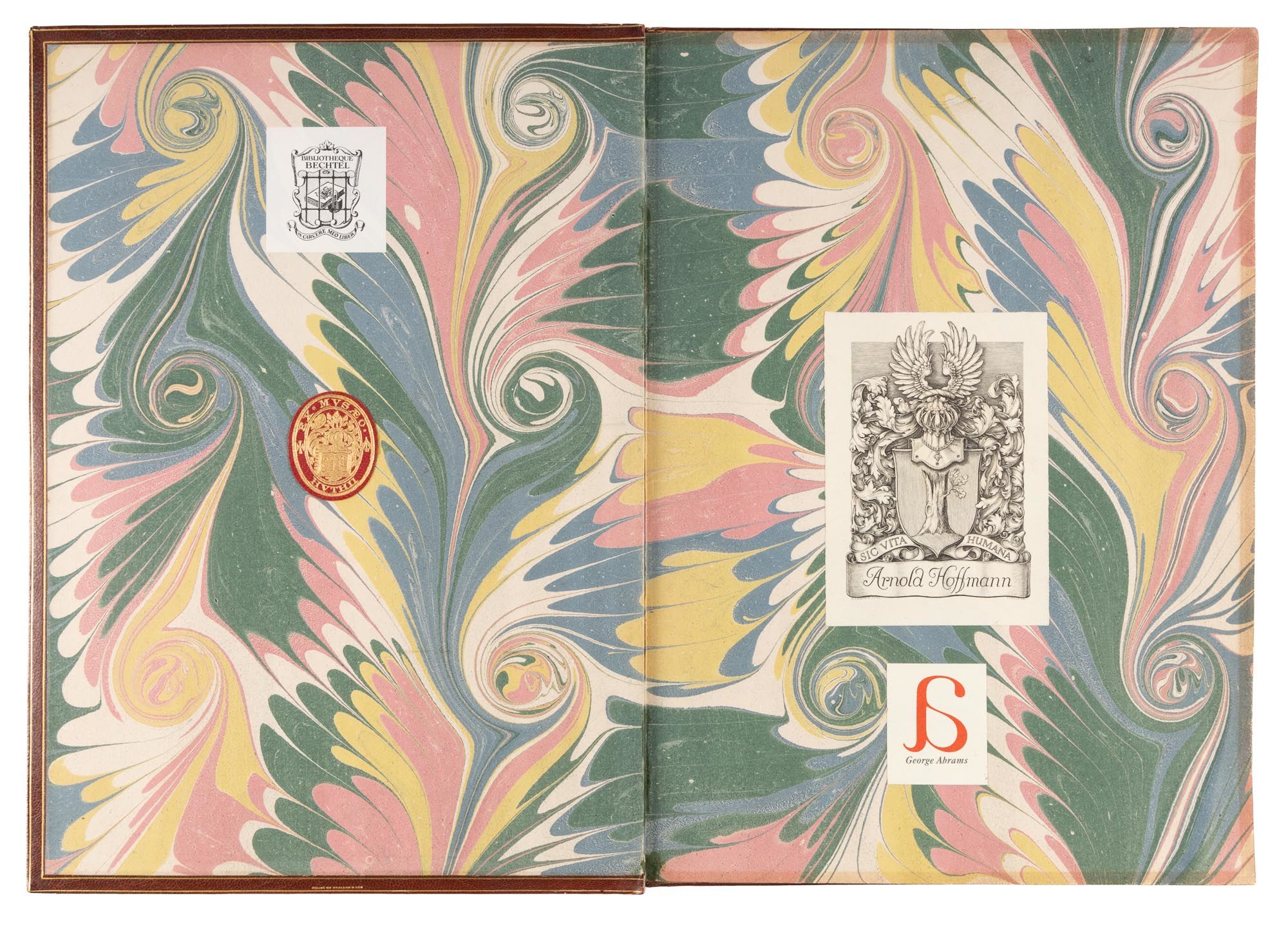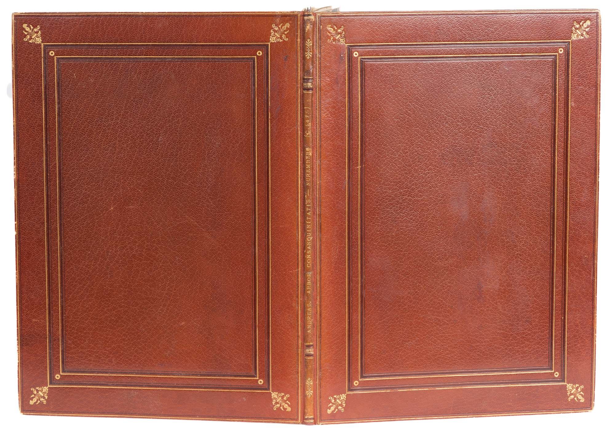 1474. Nuremberg: Friedrich Creussner, c.1474. 10 ff.. Nuremberg: Friedrich Creussner, c.1474. 10 ff. Possibly the First Law Book with Illustrations, No Copies of This Edition Located in North America Andrea, Giovanni d' [1275-1348]. [Super Arboribus Consanguinitatis, Affinitatis et Cognationis Spiritualis]. [Nuremberg: Friedrich Creussner, c.1473-1477]. [10] ff. Collation: [a10]. 2 full-page woodcut tables of descents to leaves [a4]v and [a8]r, additional contemporary full-page manuscript table of spiritual relationships bound after text. Folio (11-1/2" x 8"; 29 x 20.5 cm). Incunabula Short-Title Catalogue (ISTC) ia00605500 (11 complete copies worldwide, none in North America). Later nineteenth-century paneled morocco signed binding by Riviere & Son, gilt frames and corner fleurons to boards, discreetly rebacked retaining existing spine with raised bands, gilt and blind fillets and gilt ornaments, title and date, gilt edges, gilt rules to inner board edges, marbled endpapers, endpapers added. Light rubbing and a few minor scratches to boards, moderate rubbing to board edges, corners lightly bumped, hinges cracked, faint offsetting to edges of free endpapers, four later bookplates, of Guy Bechtel, the Huth family library, Arnold Hoffmann and George Abrams, to front free endpaper, recent French bookseller description tipped-in to front endleaf. Text printed in 33/34-line gothic type, rubricated throughout (including tables) in red ink, large initials in red and silver ink to [a1]r and red ink to [a5]r, smaller initials in red ink to [a9]r and [a1]v. Light toning to interior, very faint dampstain to upper corner of ff. [7] and [9] just touching text of f. [9], both tables trimmed close with minor loss to bottom edge, negligible loss at gutter of first table and fore-edge of second. An attractive, wide-margined copy of a fundamental treatise. $8,000. **THIS DESCRIPTION IS TRUNCATED DUE TO CHARACTER LIMITS. PLEASE CONTACT US FOR A COMPLETE VERSION.** * D'Andrea was an Italian canonist and professor of canon law at the University of Bologna. An eminent figure who received the highest tributes from Arithemius, Baldus, Forster and Bellarmin, his principal writings circulated widely in manuscript and were among the earliest printed works on canon law. Often included in editions of the Corpus Juris Canonici, the Super Arboribus is a fundamental treatise on degrees of consanguinity and affinity, also known.