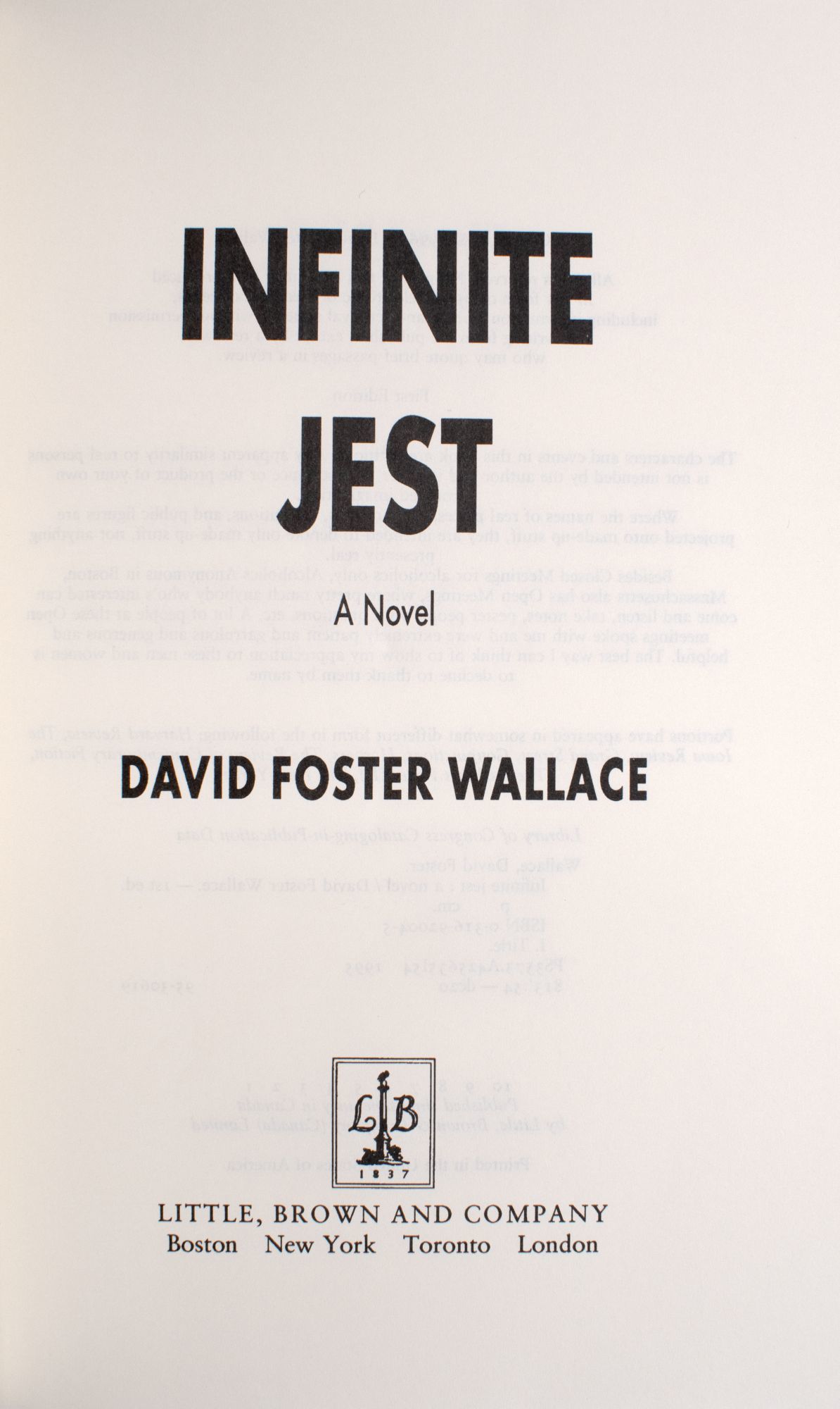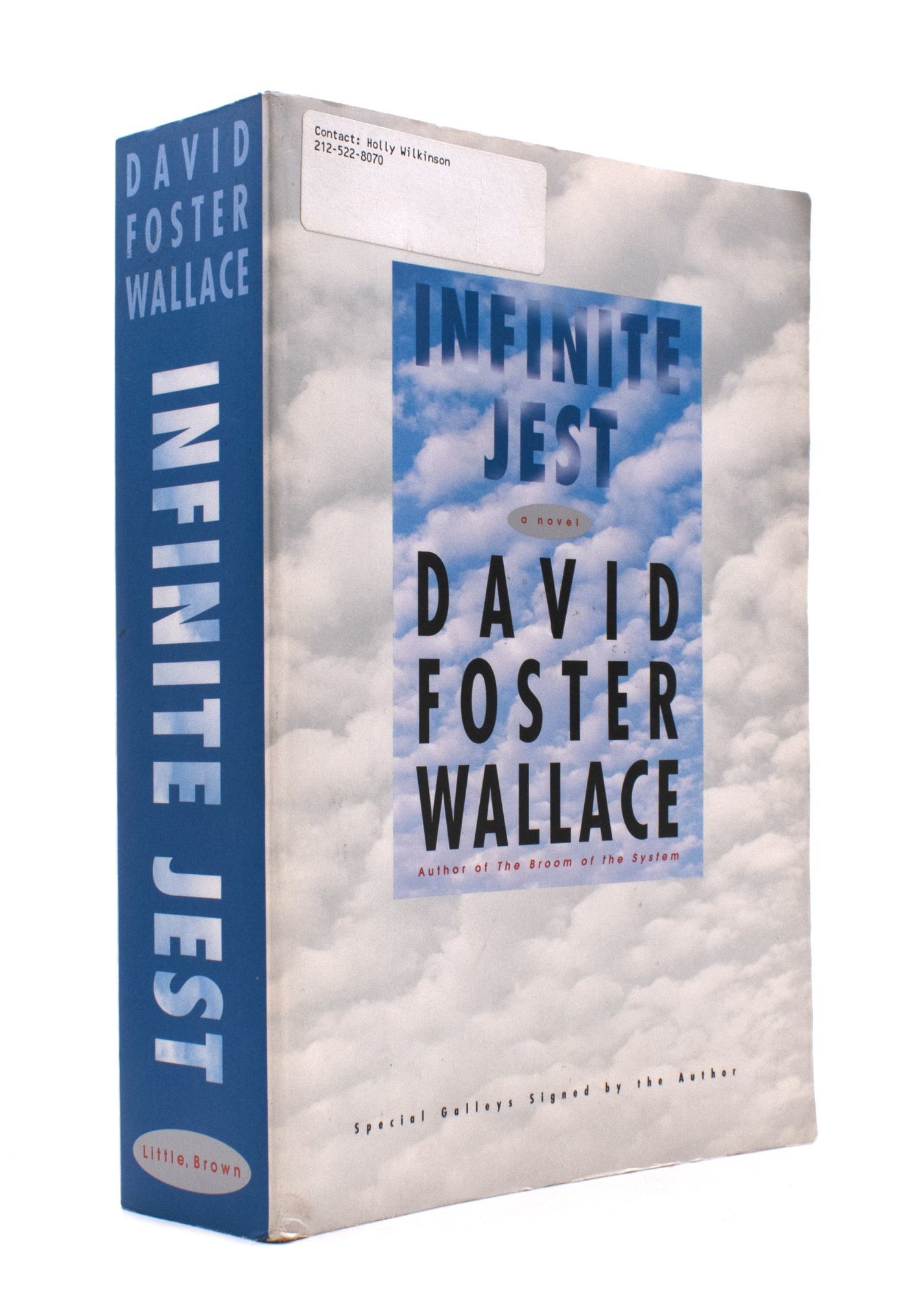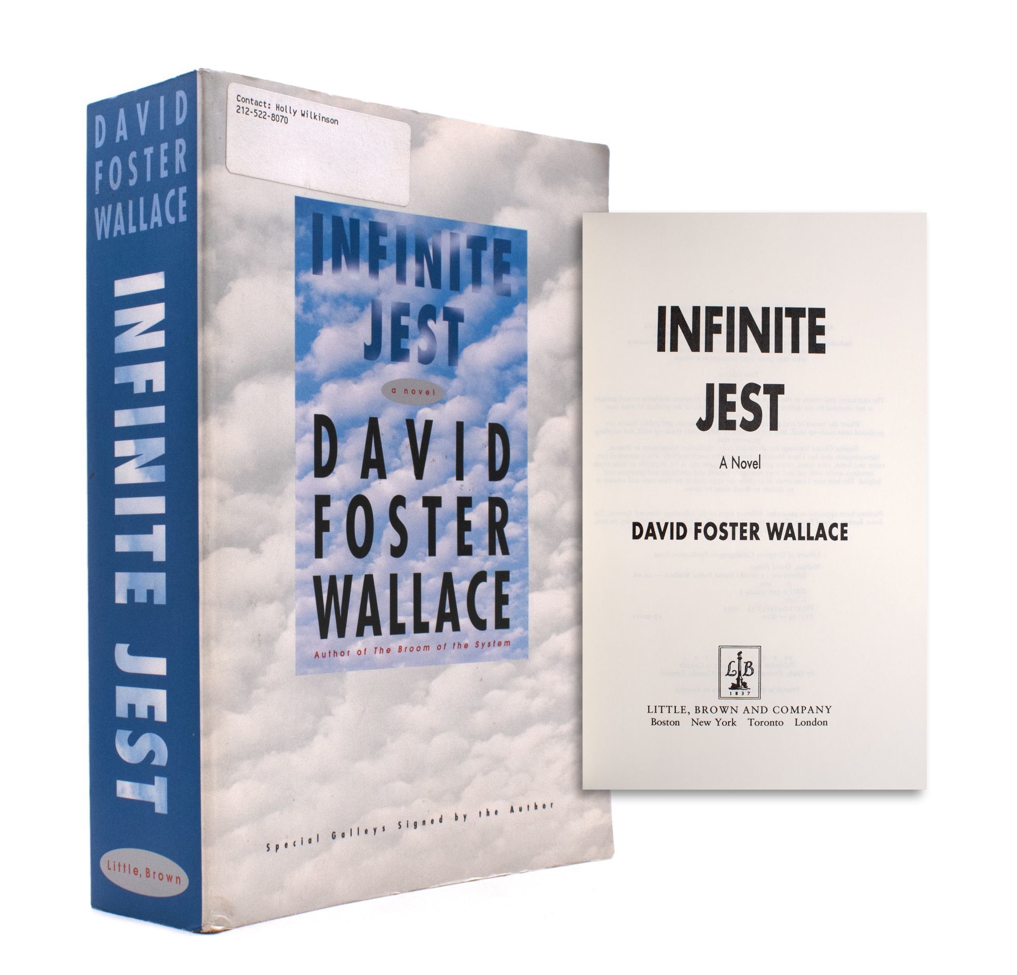 New York: Little, Brown & Company, 1996. Uncorrected advance proof. 1079 pp. 1 vols. 8vo. Printed wrappers with the published cover as an image, with "Special Galleys Signed by the Author" printed at the bottom, with a marketing contact sticker at the top, some rubbing, very good plus. Uncorrected advance proof. 1079 pp. 1 vols. 8vo. "Infinite Jest" is the name of a movie said to be so entertaining that anyone who watches it loses all desire to do anything but watch it over and over. Equal parts philosophical quest and screwball comedy, the book bends every rule of fiction without sacrificing its own entertainment value.