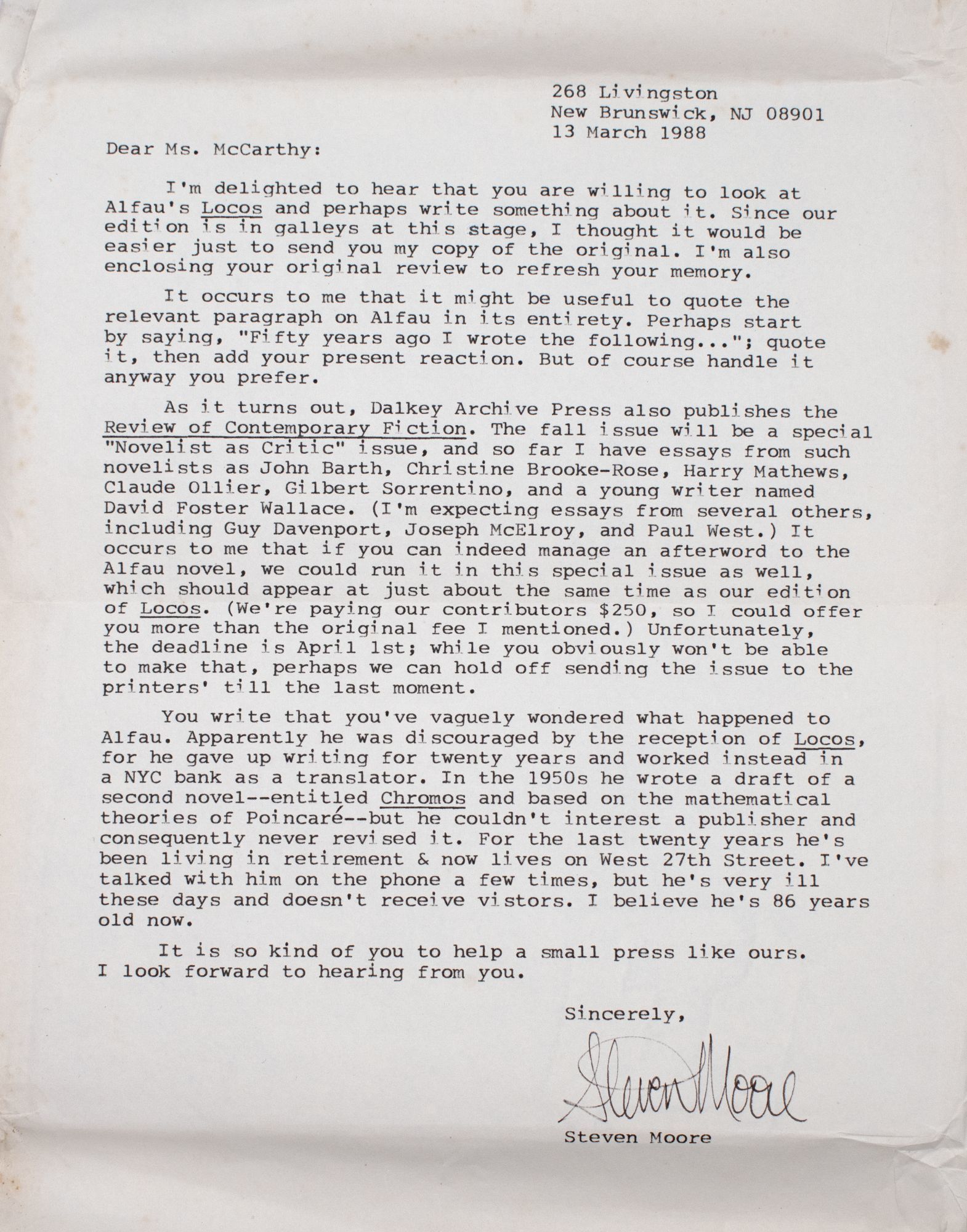 But for its small bit of critical success, the reception of Locos dispirited its author so much that he stopped writing (or wrote without hope of publication) for decades and took refuge as a bank translator. Steven Moore's Dalkey Archive Press republished the novel in 1988. At the point of writing his letter it is still in galleys, so he encloses his own copy of the original. McCarthy, in her published afterward for the book, says she was attracted her to the book was "the modernist novel as detective story," comparing it to Nabokov's Pale Fire. Later commentators have compared it to the work of Pirandello, Borges, Flann O'Brien, and Calvino.