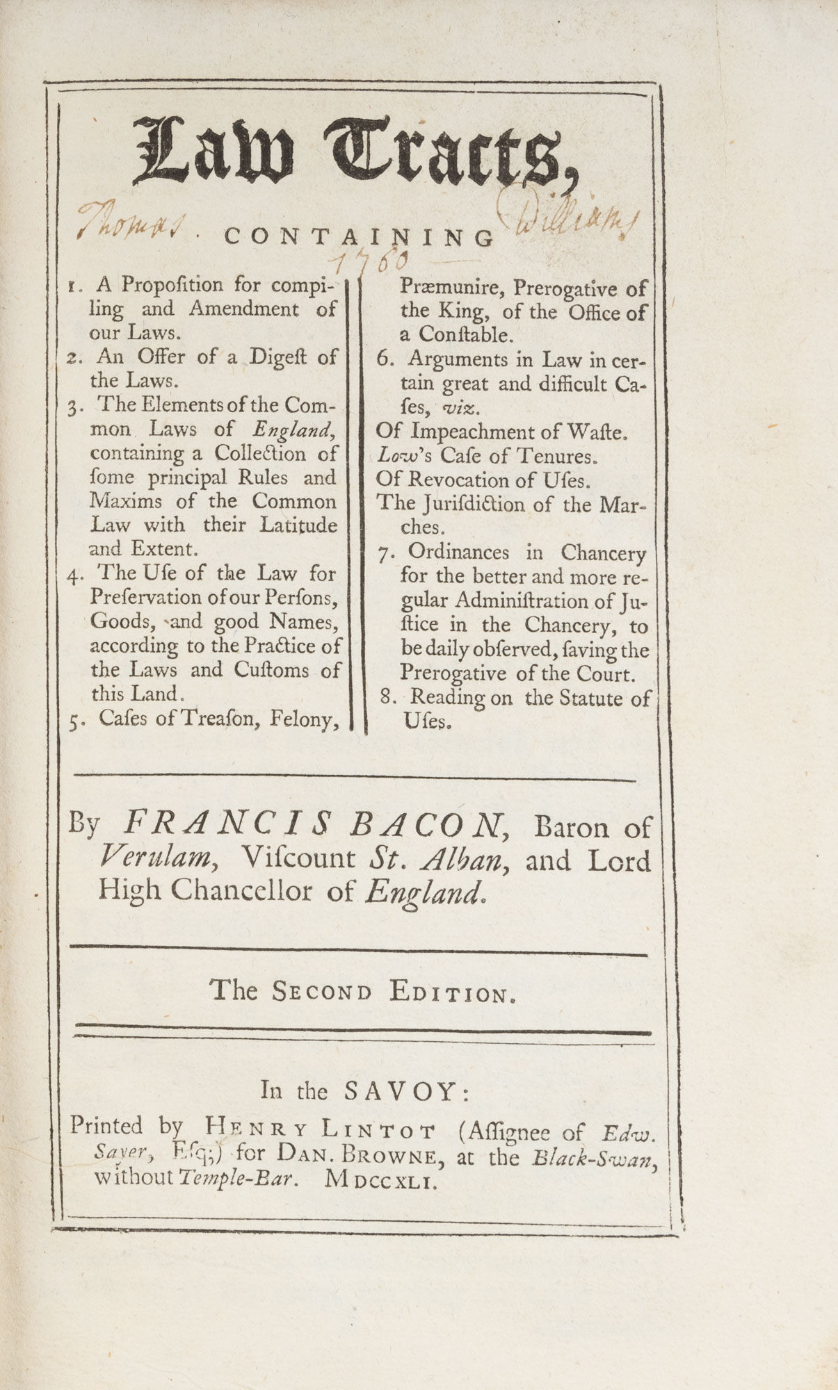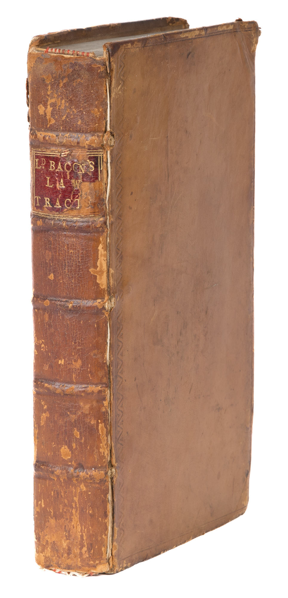 1741. London, 1741. Second edition. London, 1741. Second edition. "A More Complete Lawyer Than Any of His Contemporaries" Bacon, Sir Francis [1561-1626]. Law Tracts, Containing 1. A Proposition for Compiling and Amendment of Our Laws. 2. An Offer of a Digest of the Laws. 3. The Elements of the Common Laws of England, Containing a Collection of Some Principal Rules and Maxims of the Common Law, With their Latitude and Extent. 4. The Use of the Law for Preservation of our Persons, Goods and Good Names, According to the Practice of the Laws and Customs of this Land. 5. Cases of Treason, Felony, Praemunire, Prerogative of the King, Of the Office of a Constable. 6. Arguments in Law in Certain Great and Difficult Cases, Viz. Of Impeachment of Waste. Low's Case of Tenures. Of Revocation of Uses. The Jurisdiction of the Marches. 7. Ordinances in Chancery for the Better and More Regular Administration of Justice in the Chancery, To be Daily Observed, Saving the Prerogative of the Court. 8. Reading on the Statute of Uses. [London]: Printed by Henry Lintot (Assignee of Edw. Sawyer, Esq;), 1741. [ii], 356, [16] pp. Publisher advertisement on verso of half-title. Octavo (7-3/4" x 5"). Contemporary calf, blind rules to boards, blind fillets along joints, raised bands and lettering piece to spine, gilt tooling to board edges. Light rubbing and a few small scratches and stains to boards, front board detached, rear board near-detached, moderate rubbing to extremities, light gatoring and a few nicks to spine, lower right corner of lettering piece, which has a chip to its top-edge, lacking with loss to text, spine ends chipped, corners bumped and worn, moderate toning and light foxing to endleaves, early ownership signatures (Thomas Williams, 1760) to front pastedown and title page, armorial bookplate (Penry Williams) to front pastedown. Very light toning to interior, negligible light soiling to margins in several places, light creasing to margins or corners of a few leaves not affecting text, slight crack in text block between pp. 128-129, all leaves secure, text notably bright and fresh. A good candidate for rebacking. $500. * Second and final edition, a reissue of the first edition, 1737, with a reset title page and half-title. This book is notable as the only collected edition of Bacon's legal works and the only work that includes the essays listed as Tracts 1, 2 and 6. Bacon,